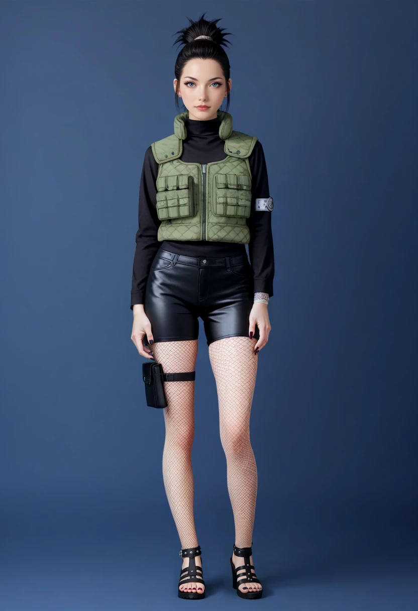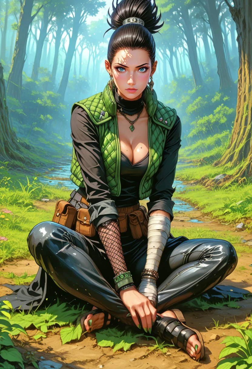 green vest, long black pants, metal Konoha headband, Shinobi back pouch, bandage, peep toe sandal.