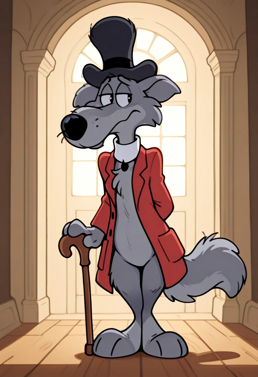 Professor Waldo Wigglesworth, gray fur, long big snout, black eyes, black hat, red , white collar, holding cane