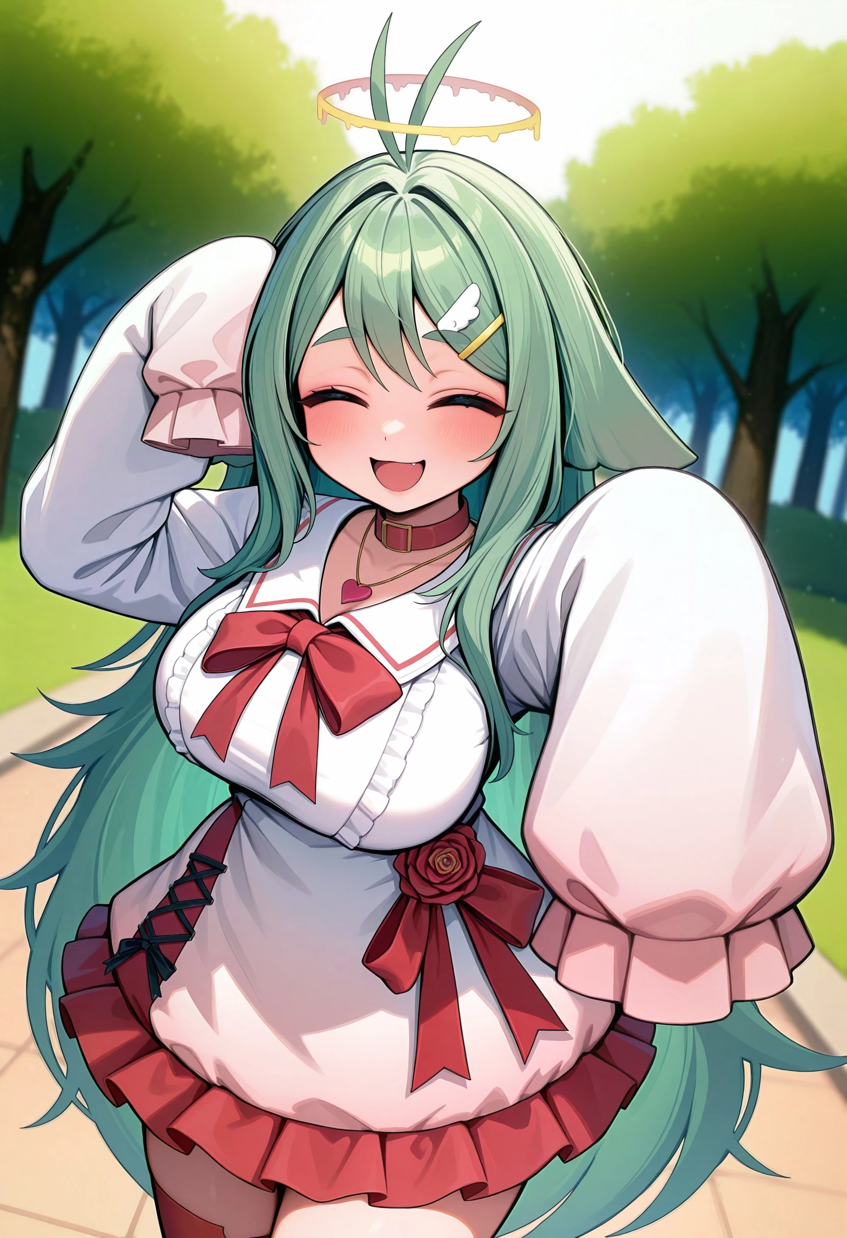 red eyes, green hair, long hair, hairclip, hair pin, red nails,