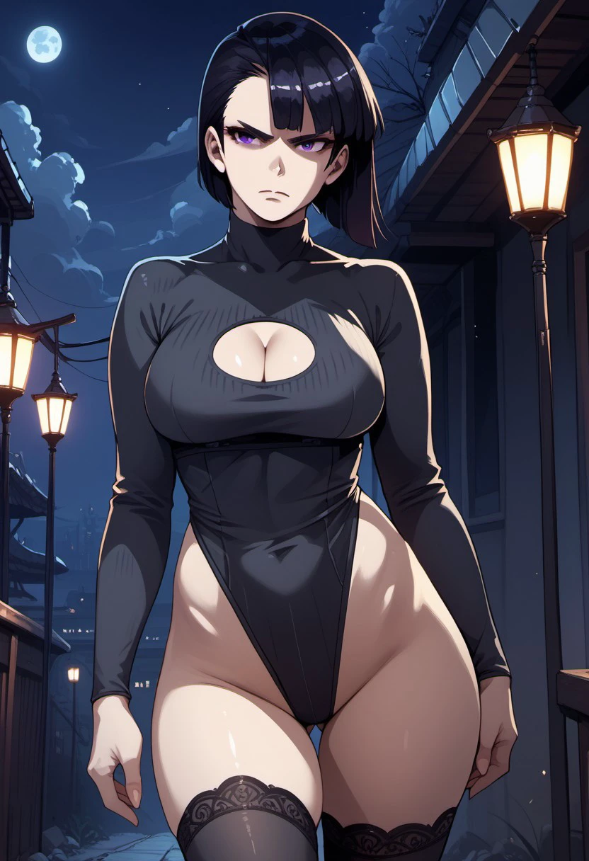black leotard, high leg leotard, long sleeves, cleavage cutout, thighhighs,
