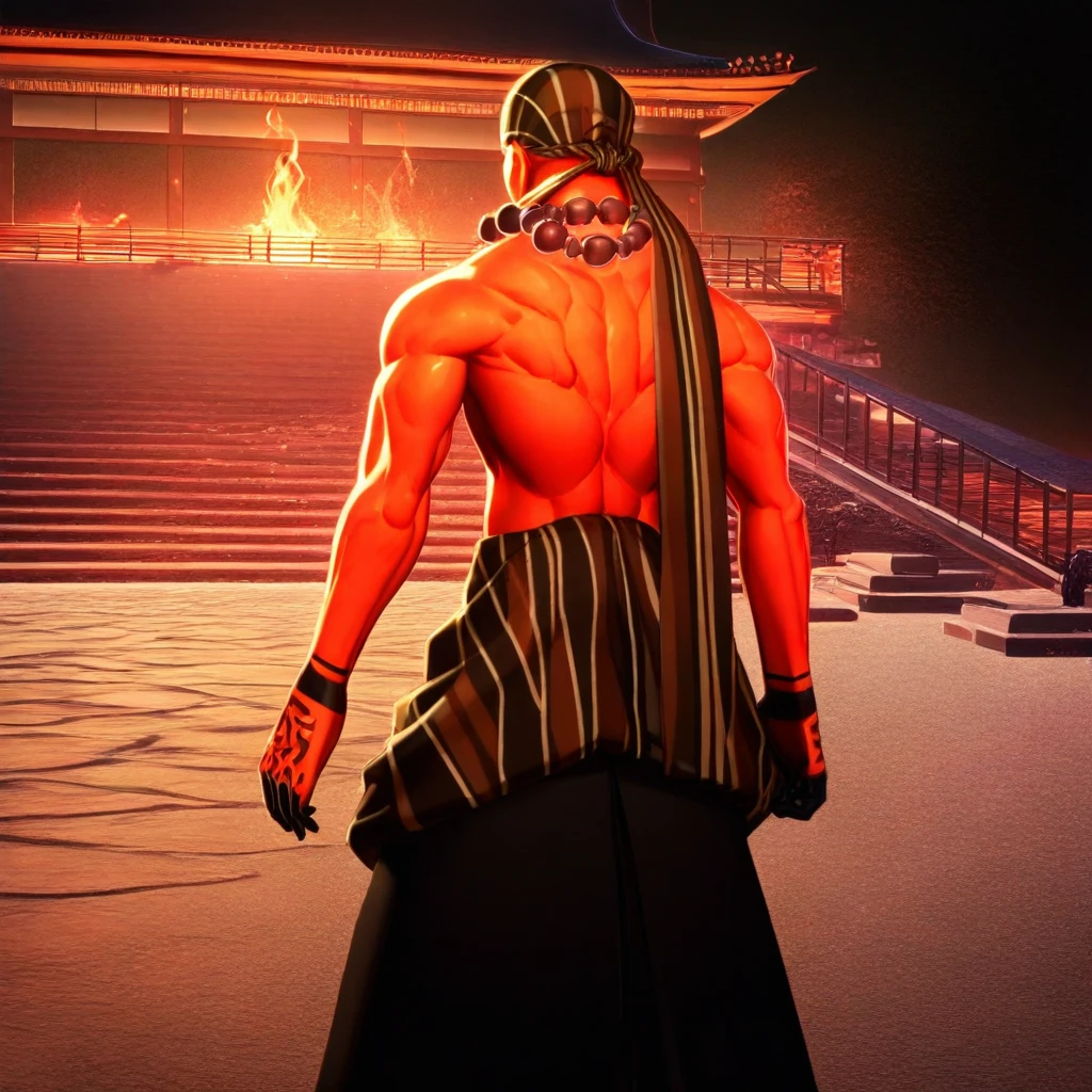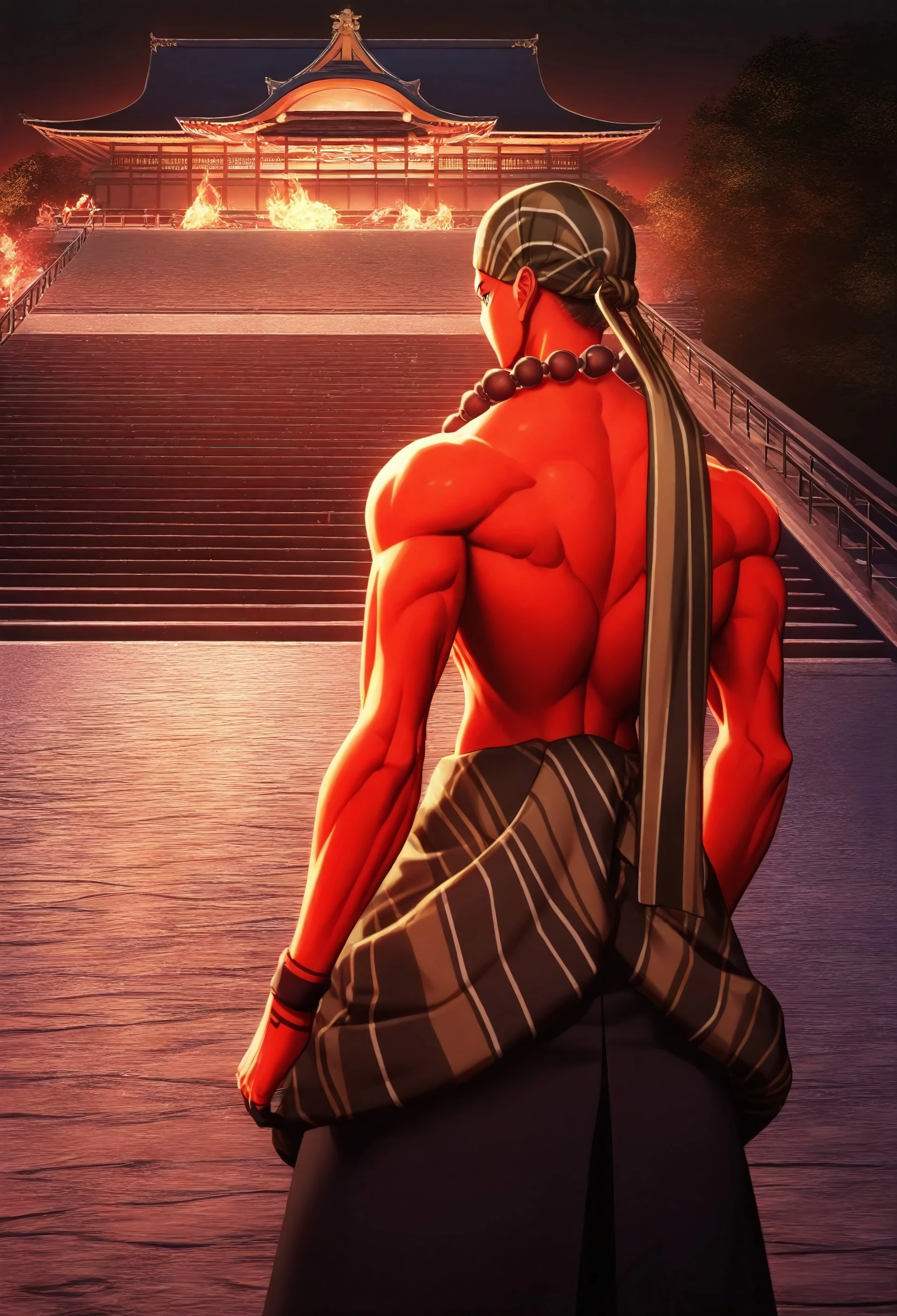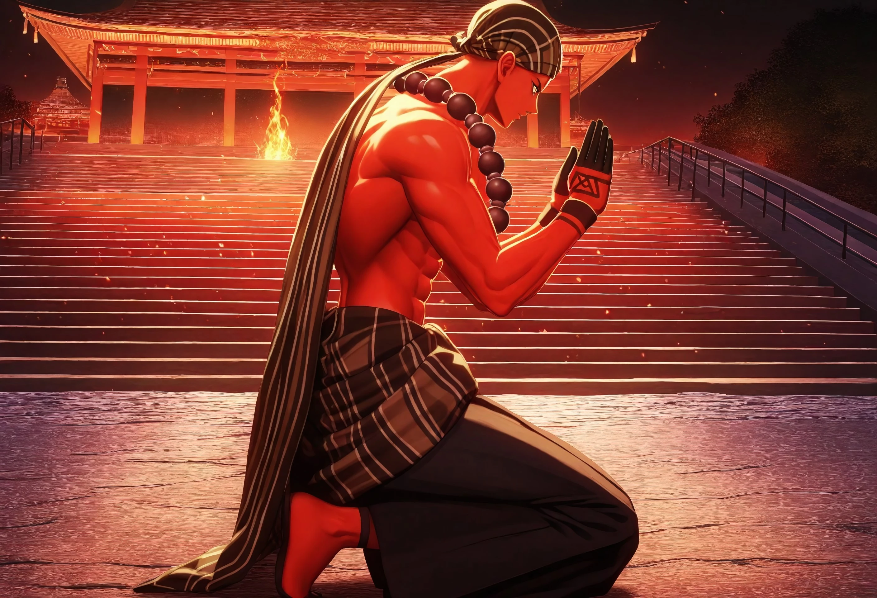 Goko_SMT, red skin, striped headscarf, brown bead necklace, brown eyes