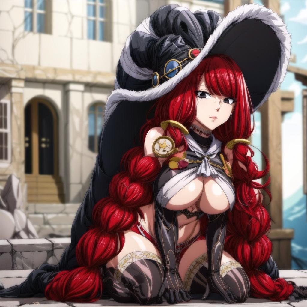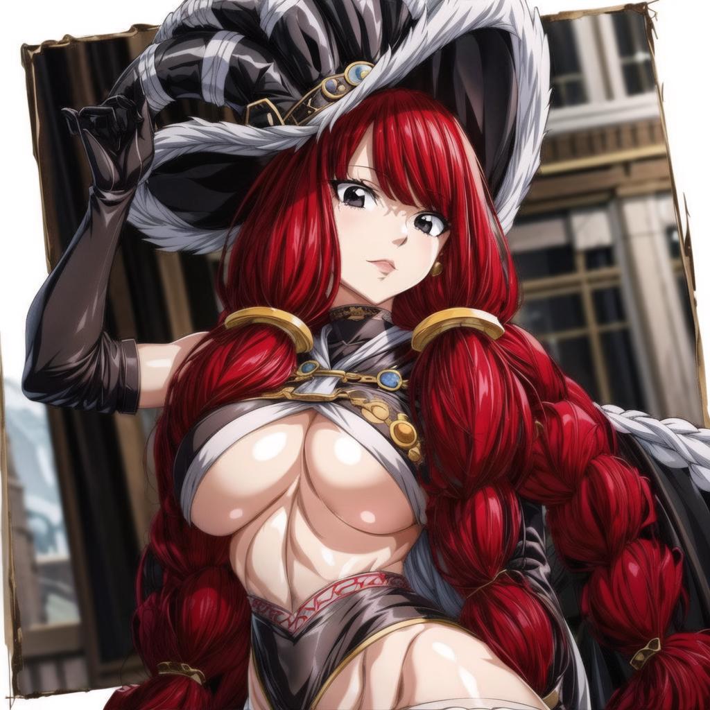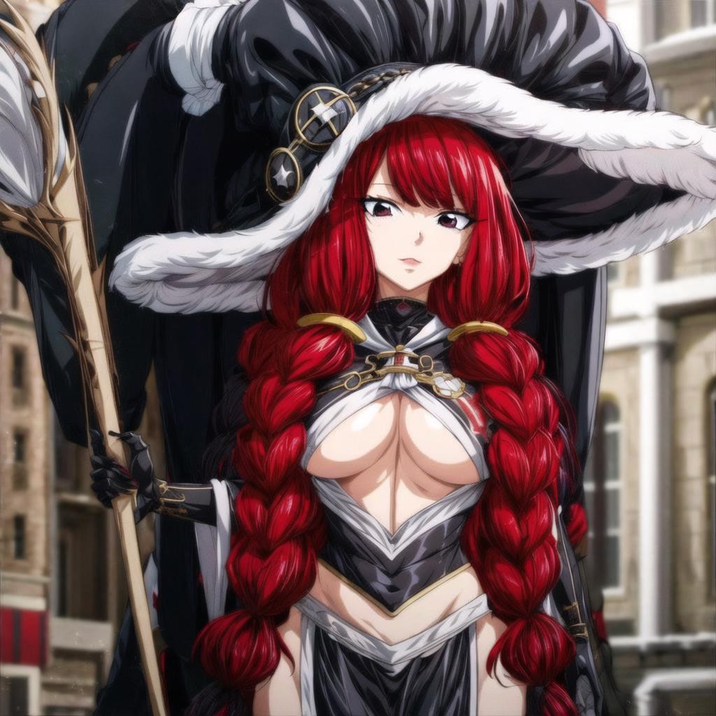 <lora:IreneV2:0.8>,solo, irene, breasts, red hair, underboob, hat, long hair, witch hat, 1girl, braid, large breasts, twin braids, gloves, elbow gloves, black eyes, looking at viewer,(full body),