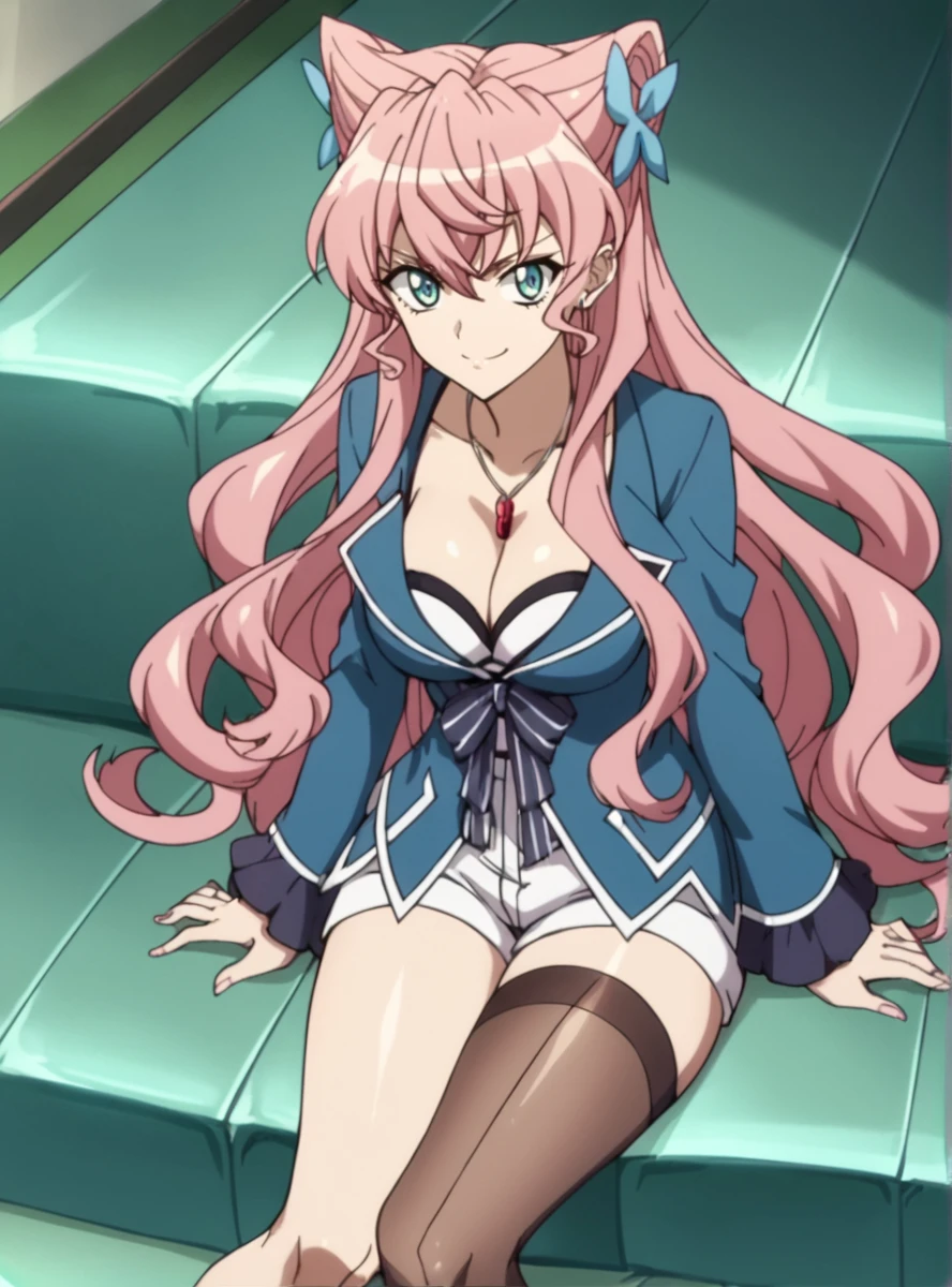 Prompts: pink hair, long hair, blue eyes, ,hair ornament, very long hair , cleavage white shorts, ,uneven legwear, pendant, cleavage,single thighhigh, large breast,thick thighs, single leg pantyhose,