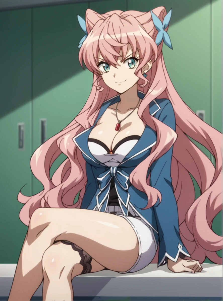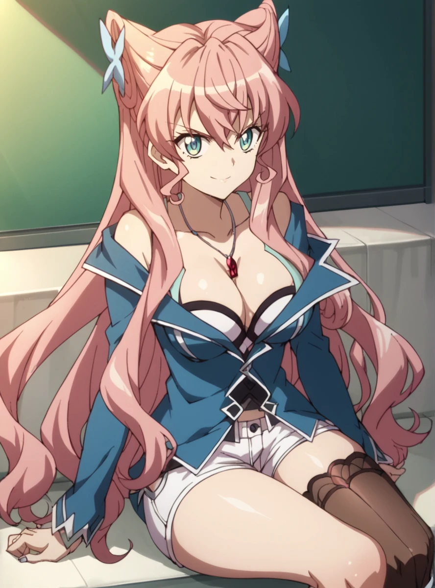 pink hair, long hair, blue eyes, ,hair ornament, very long hair , cleavage white shorts, ,uneven legwear, pendant, cleavage,single thighhigh, large breast,thick thighs, single leg pantyhose,