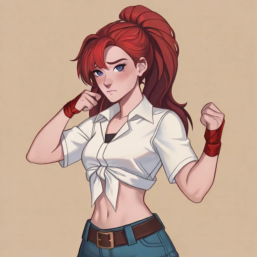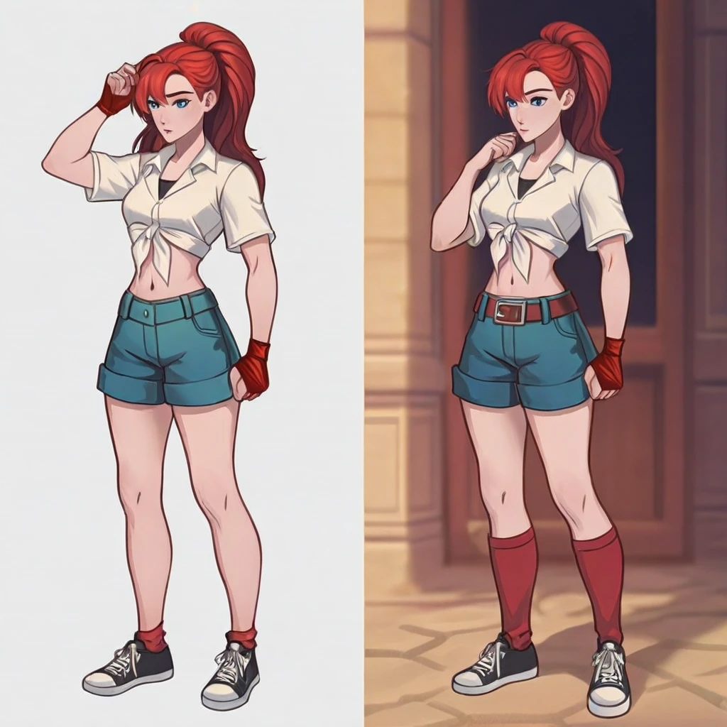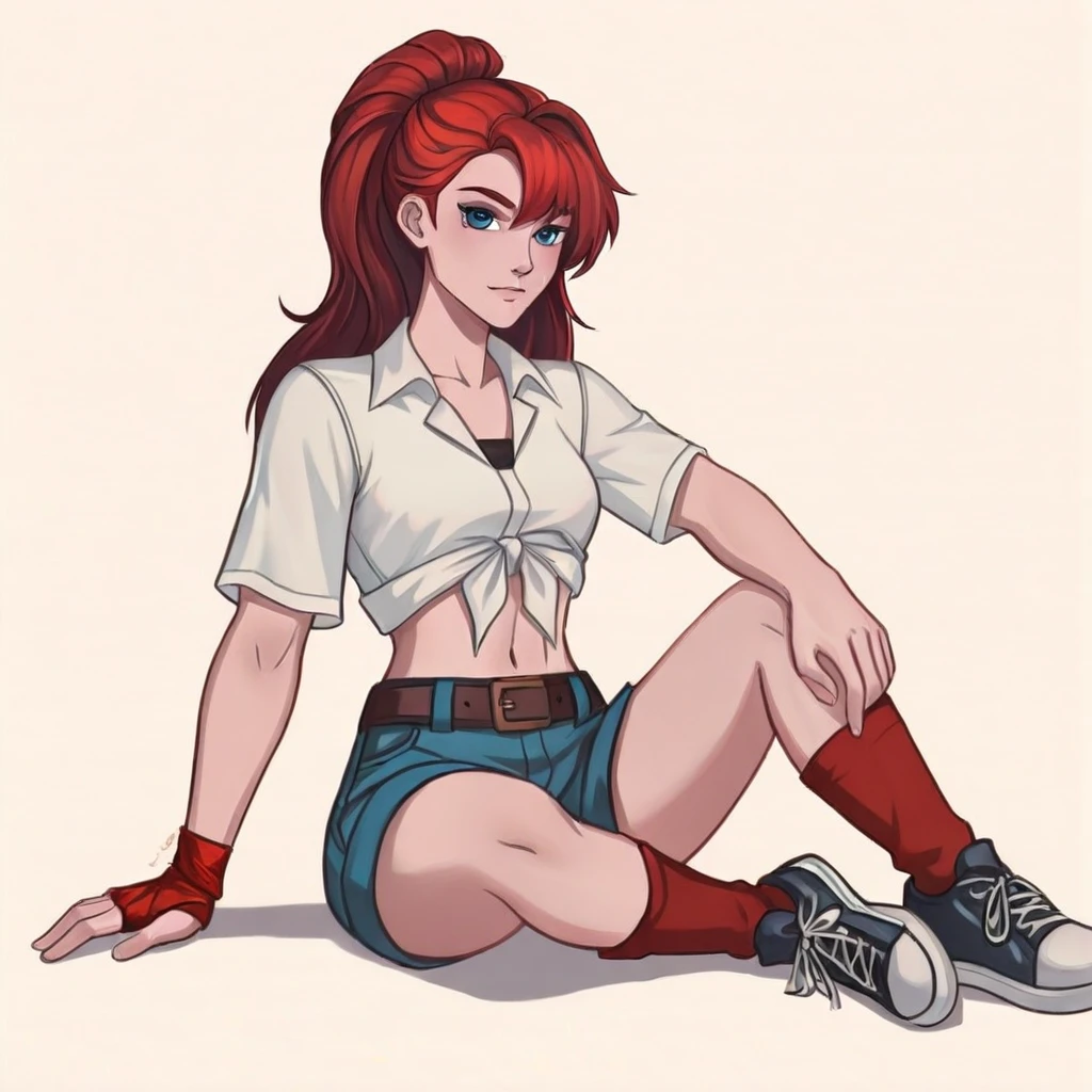 blue eyes, red hair, white shirt, navel, ponytail, denim shorts, shoes, tied shirt, red armband, high socks, sneakers, belt buckle, pleated skirt