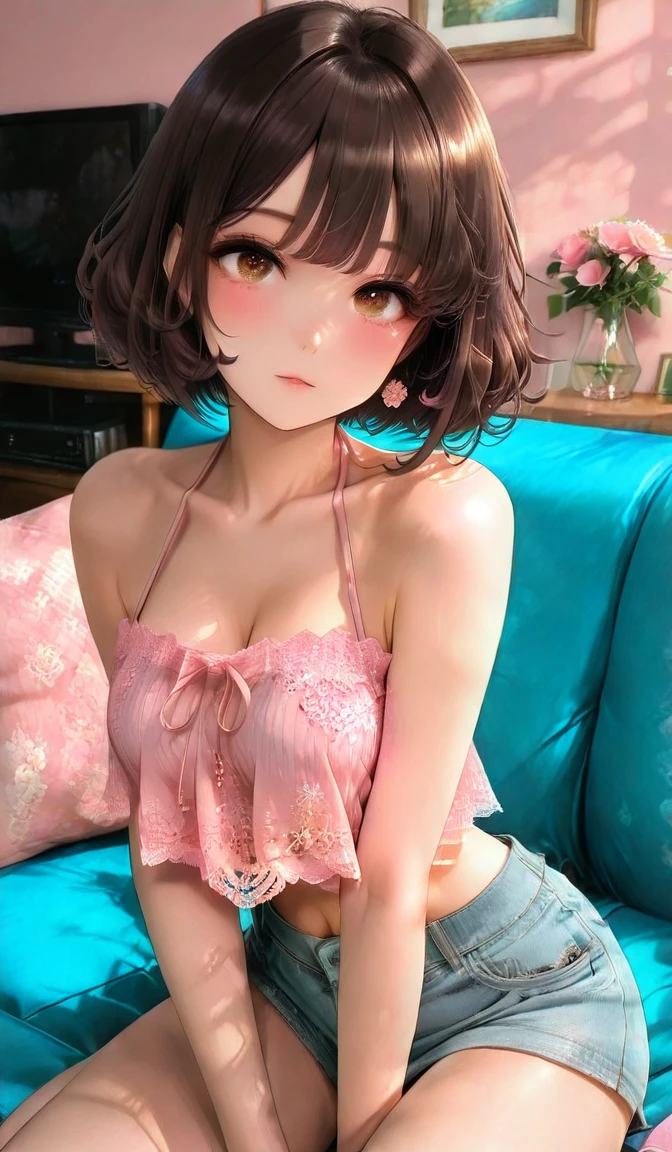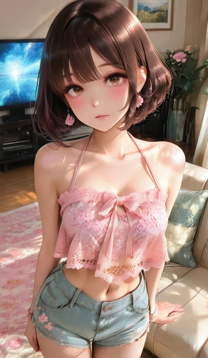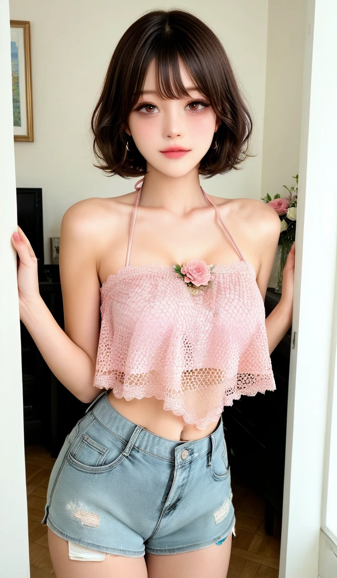 xg1,soft pink crochet lace halter crop top with thin halter straps, intricate openwork crochet pattern, scalloped hem, and a 3D pink crochet flower decoration at the center of the chest. Paired with light-wash high-waisted denim shorts with front pockets and button closure