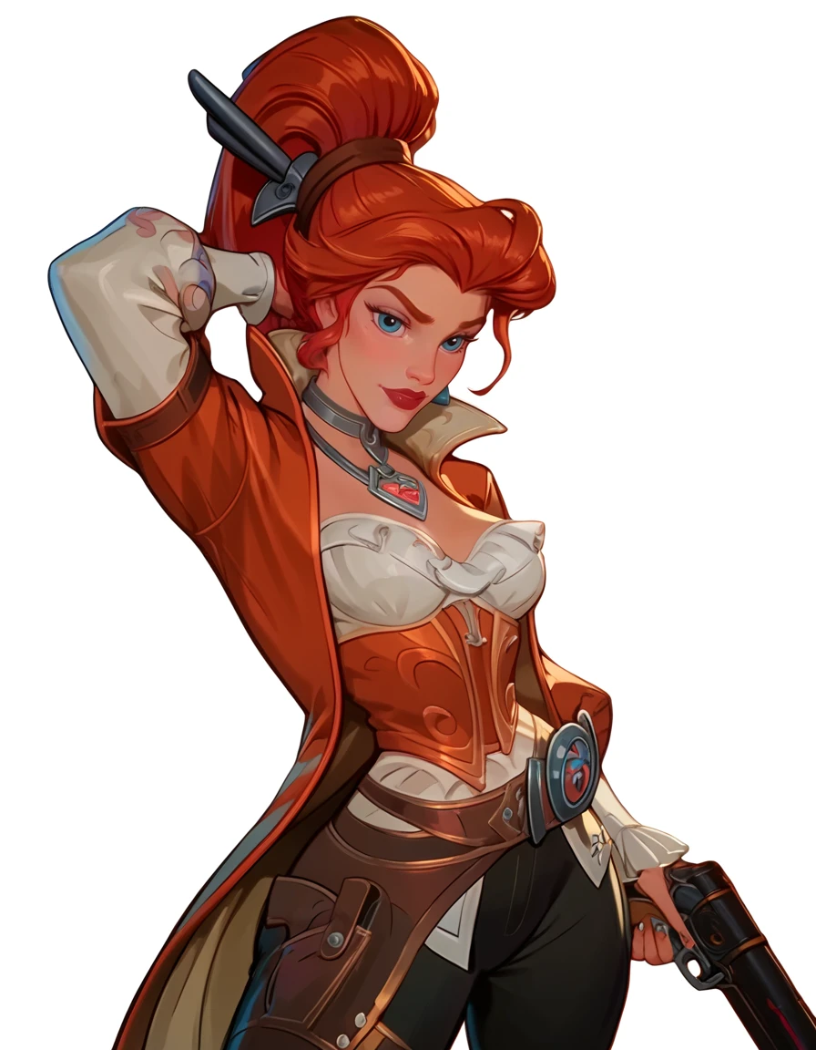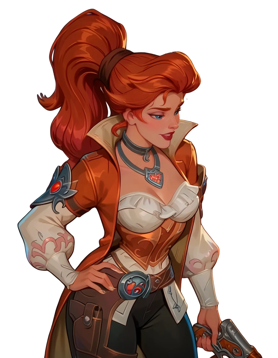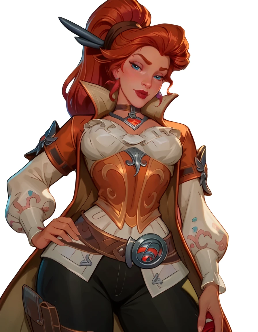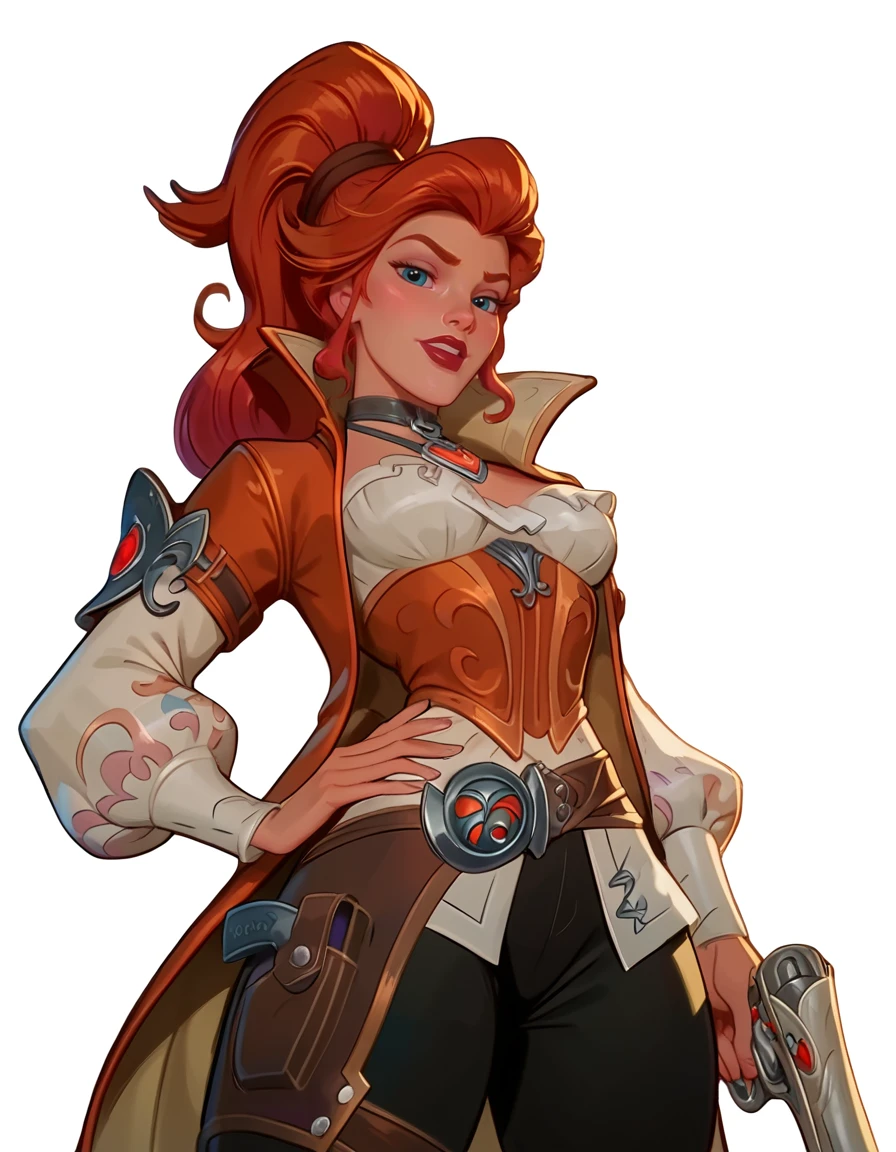 red hair, high ponytail, dark orange trench coat, pirate outfit, dark lipstick, dark orange and gold underbust, white blouse, silver collar necklace, puffy white sleeves, brown belt harness, black pants, brown boots,