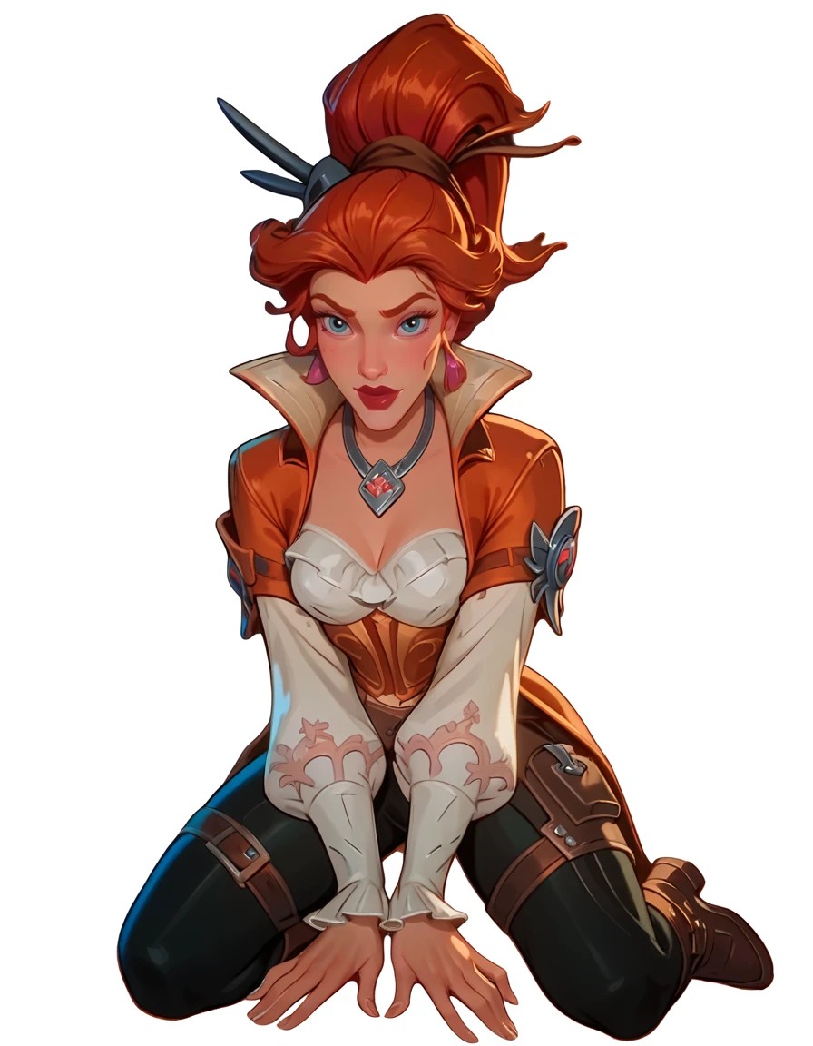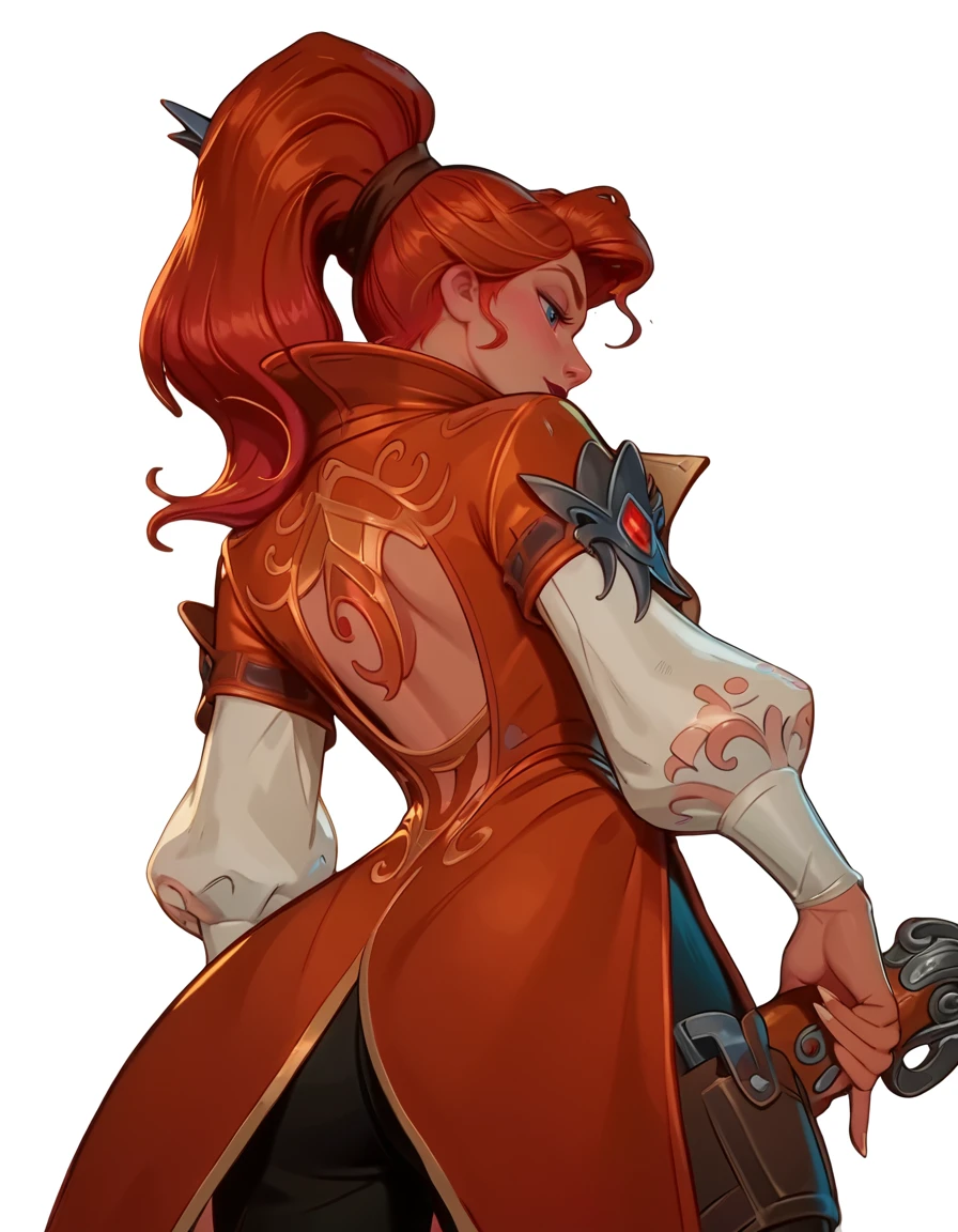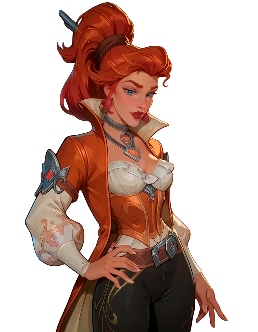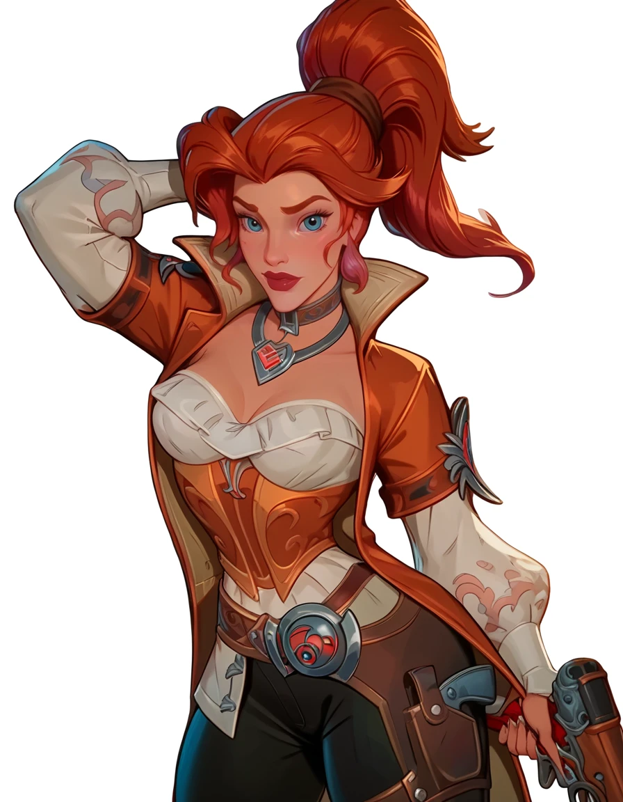 red hair, high ponytail, dark orange trench coat, pirate outfit, dark lipstick, dark orange and gold underbust, white blouse, silver collar necklace, puffy white sleeves, brown belt harness, black pants, brown boots,