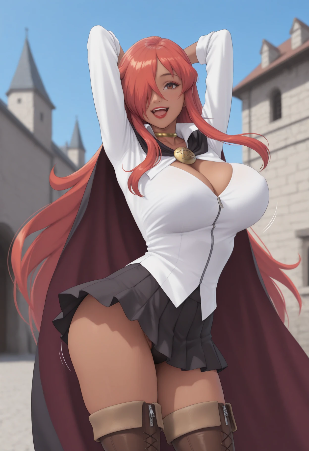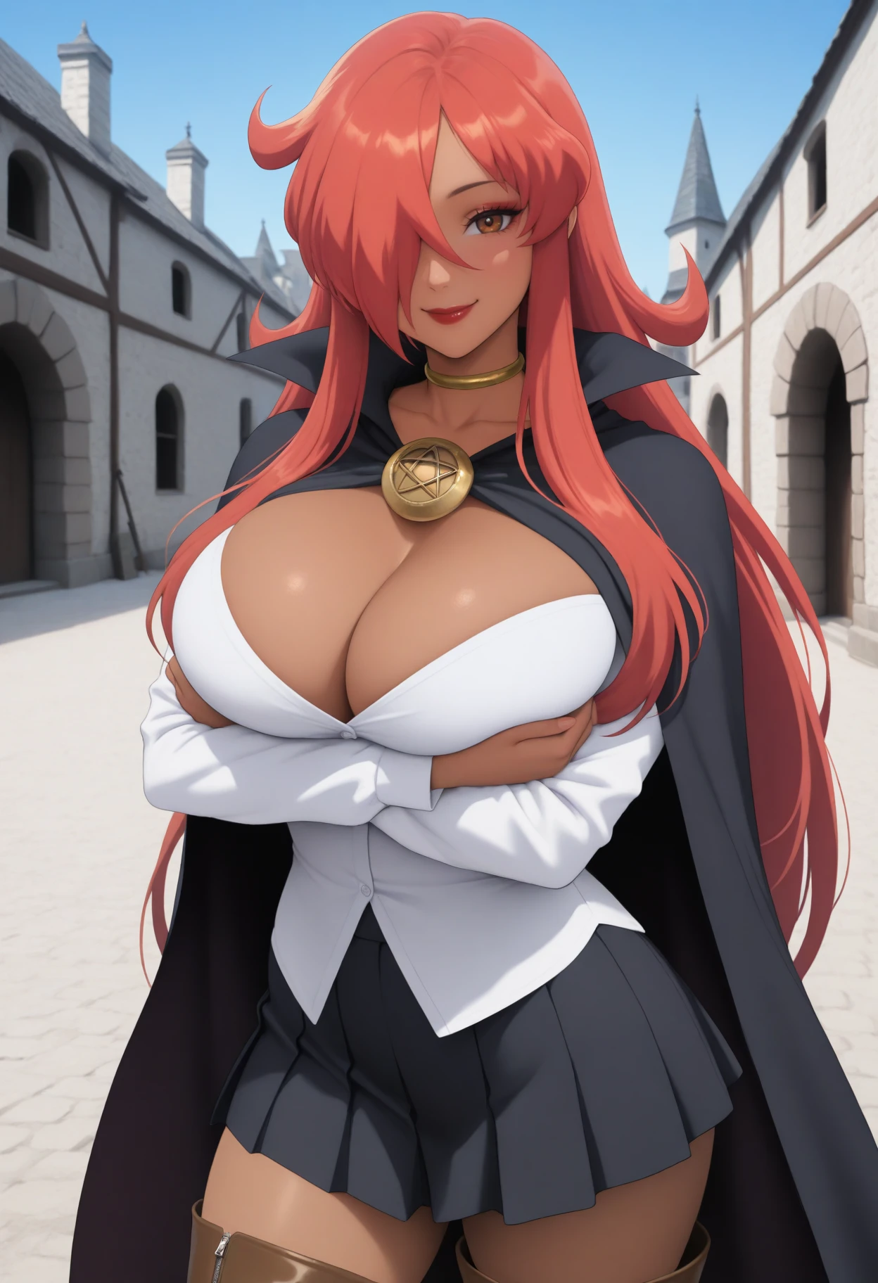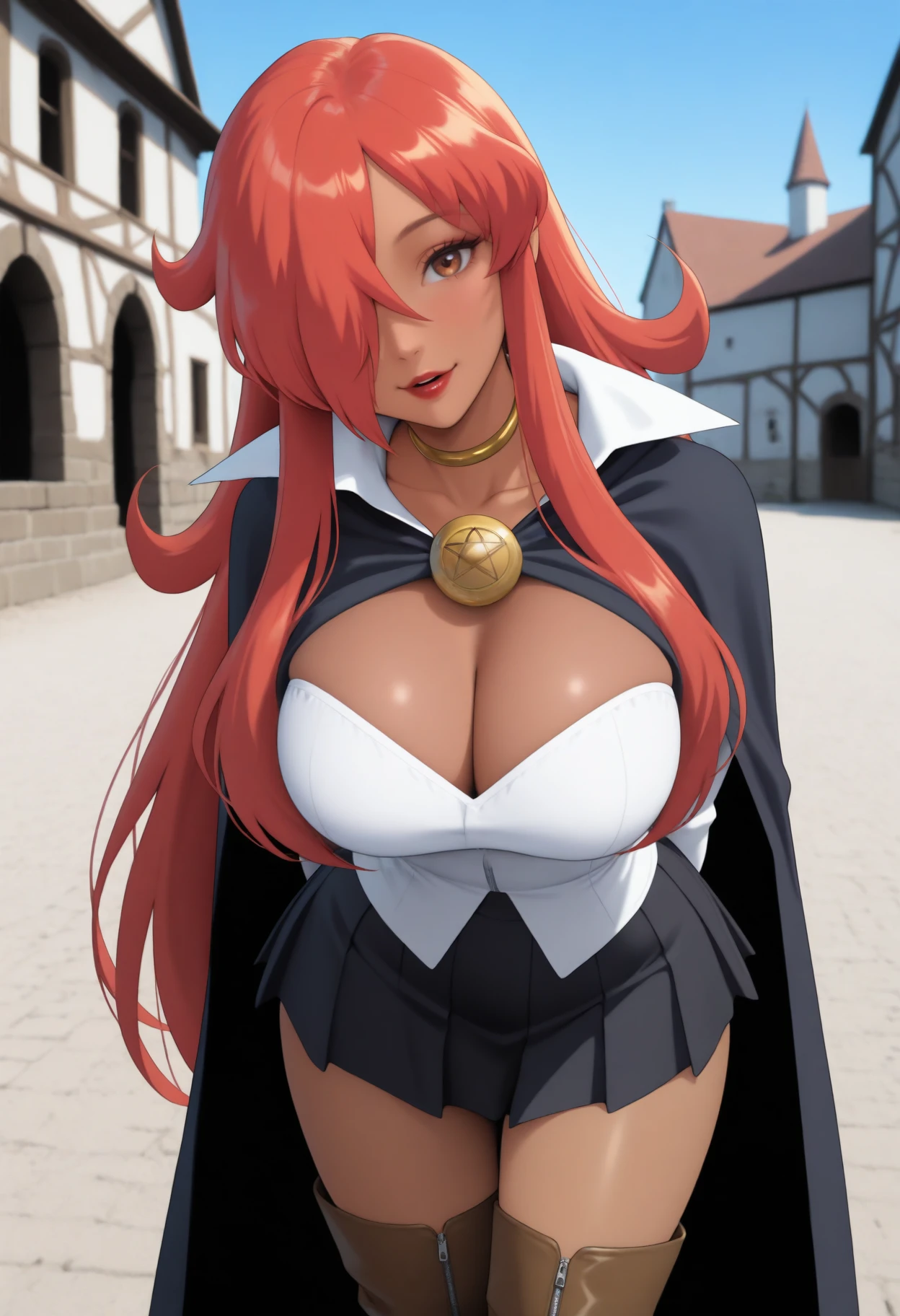 Main Prompt: dark-skinned female, curvy, very long hair, red hair, bangs, hair over one eye, sidelocks, brown eyes, makeup, red lipstick, large breasts, slim waist,