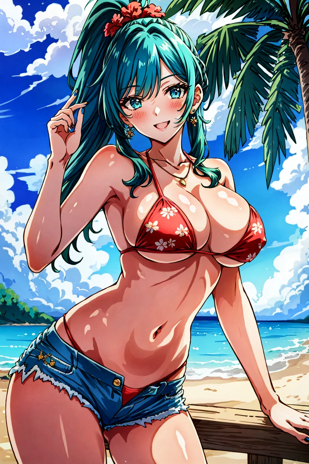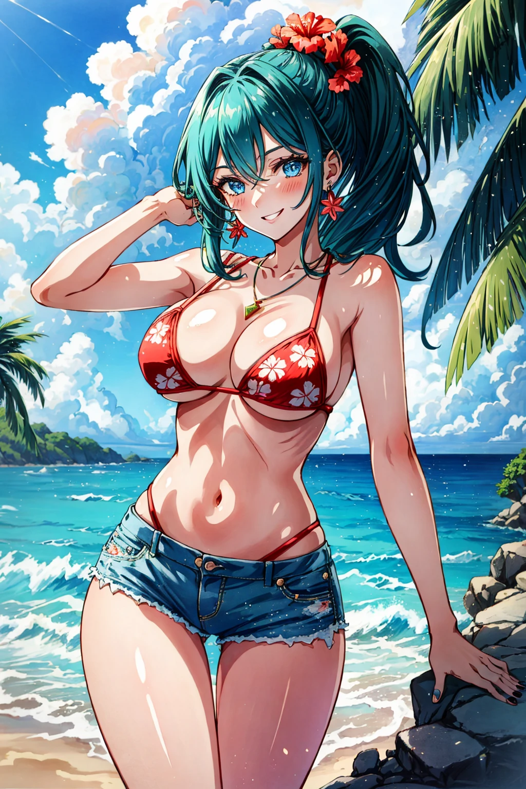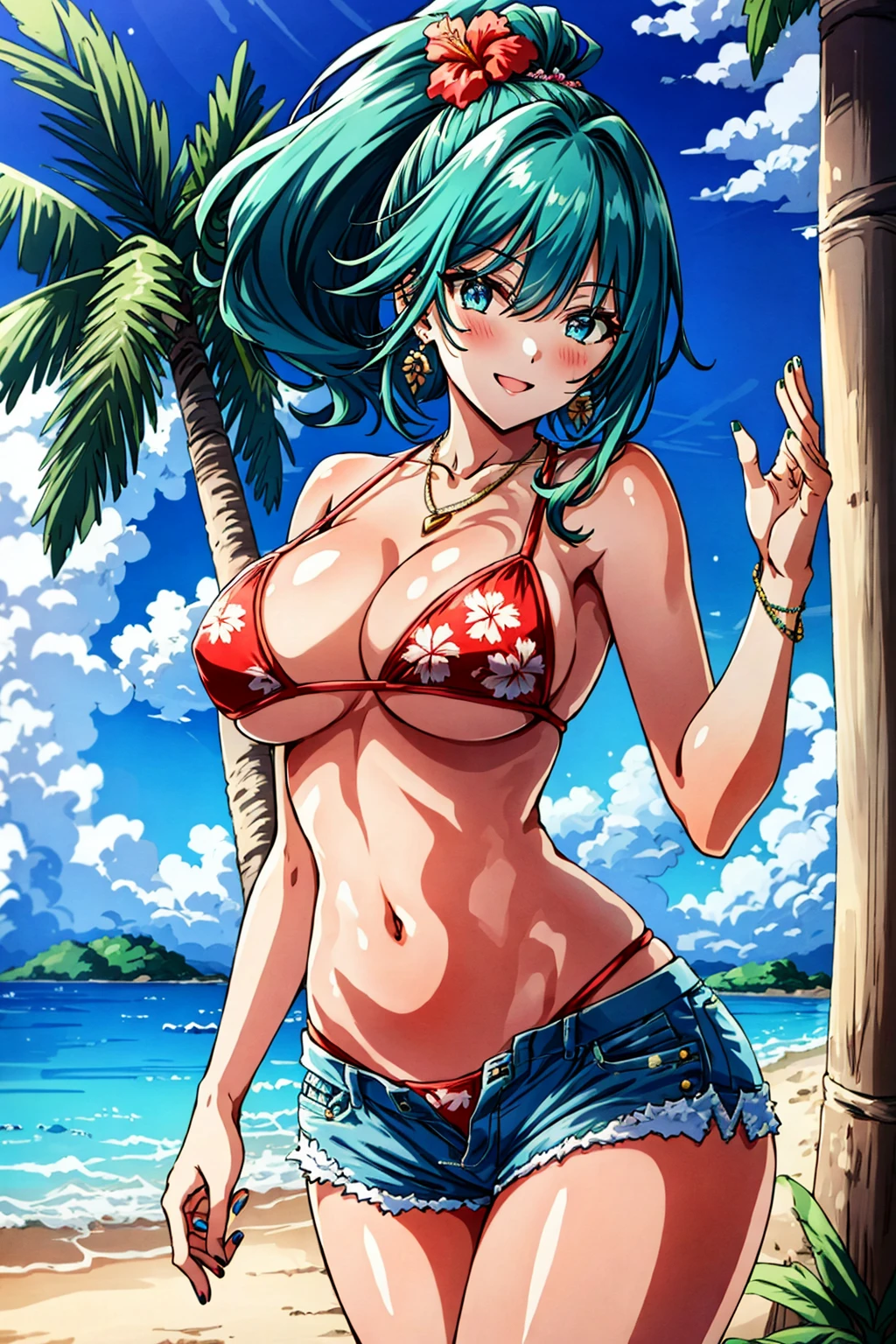 Prompt: malibu, smile, in heat, blush, blue eyes, deep green hair, long hair, ponytail, nails, necklace, jewelry, earrings, red micro bikini with Palm tree pattern print, denim shorts, (1hibiscus side head),
