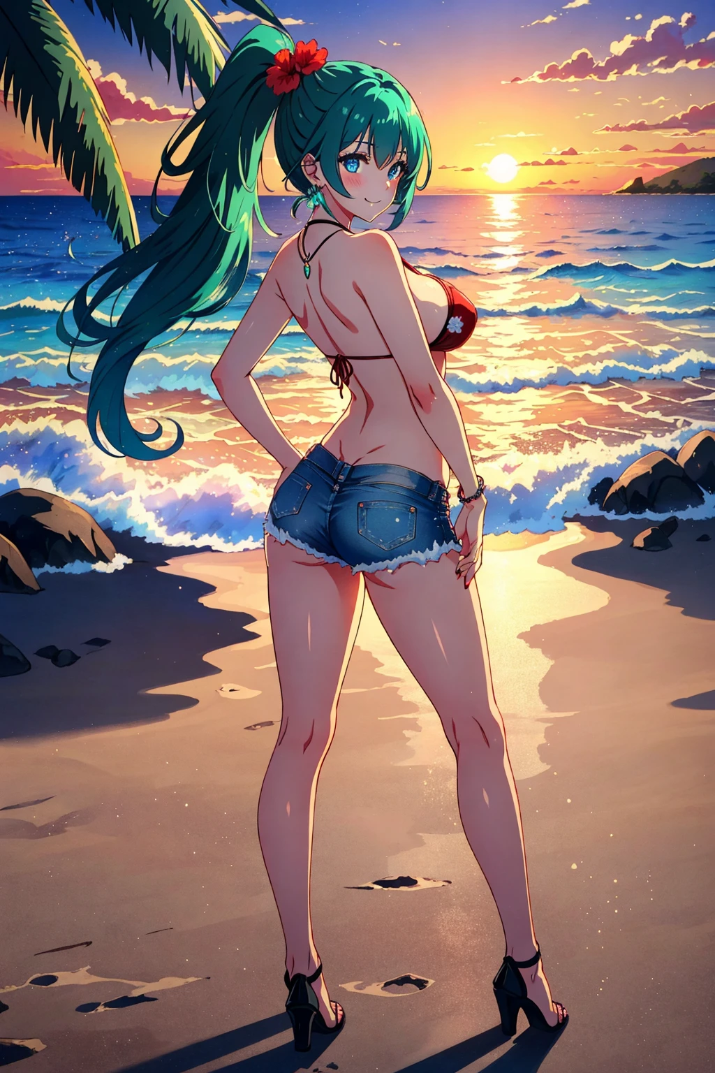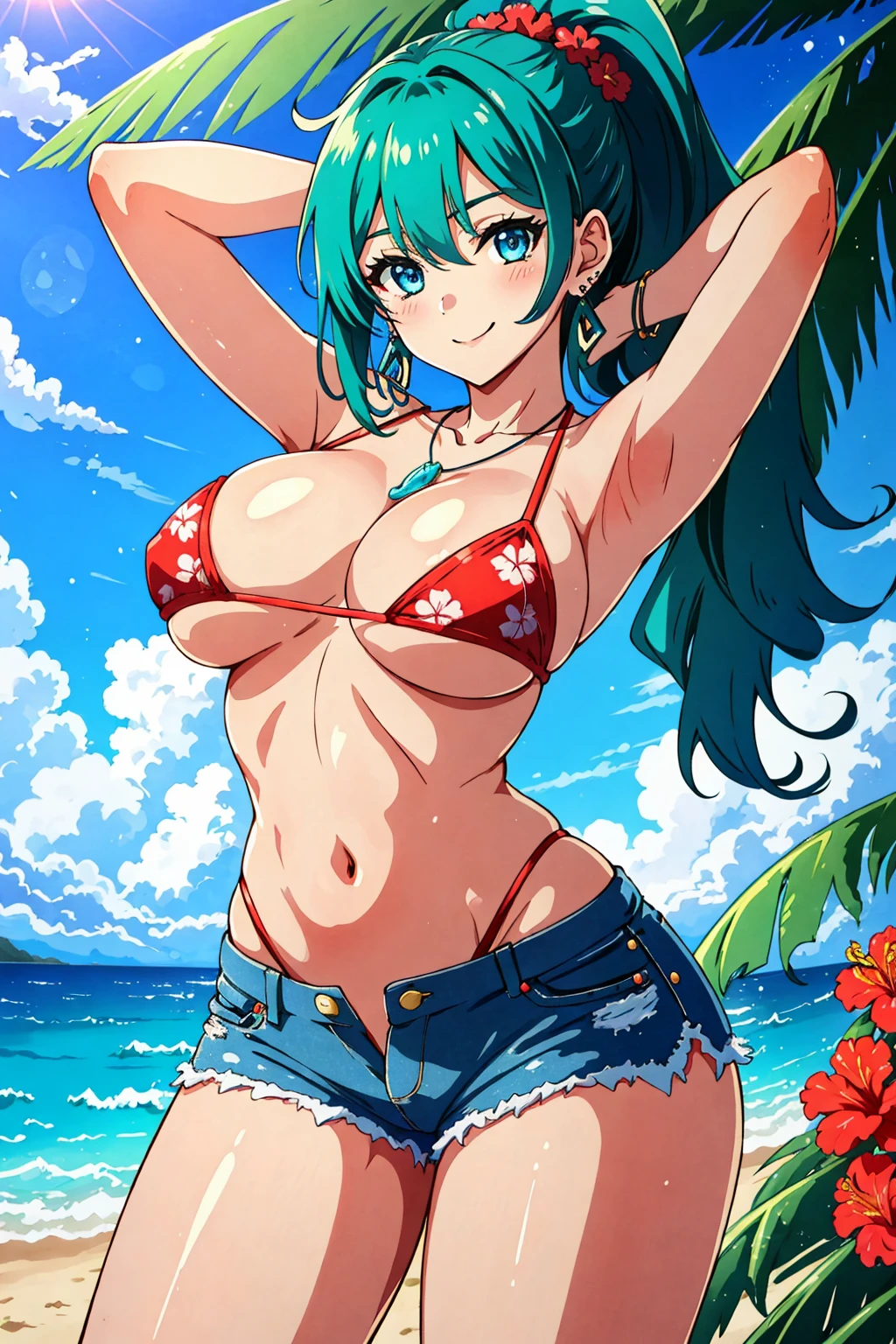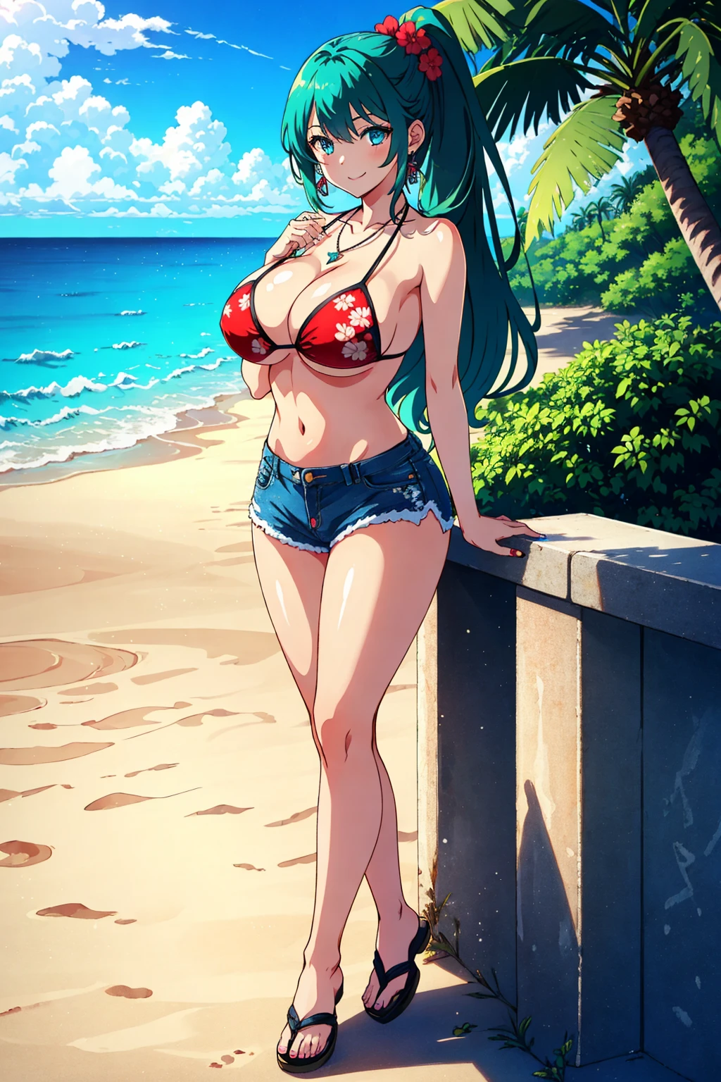 Prompt: malibu, smile, in heat, blush, blue eyes, deep green hair, long hair, ponytail, nails, necklace, jewelry, earrings, red micro bikini with Palm tree pattern print, denim shorts, (1hibiscus side head),