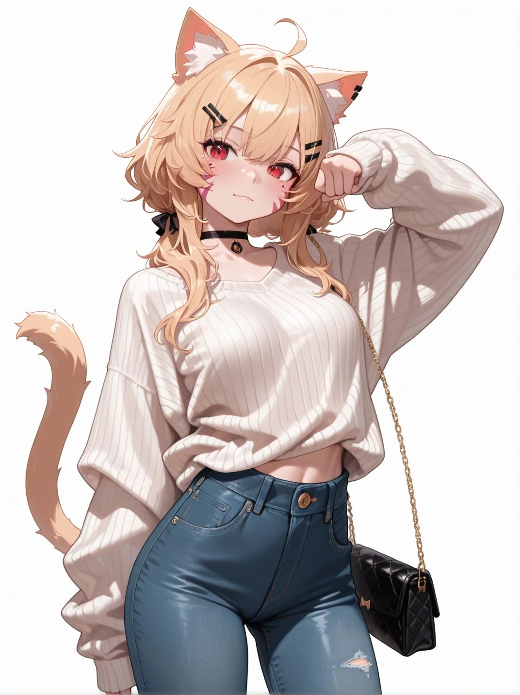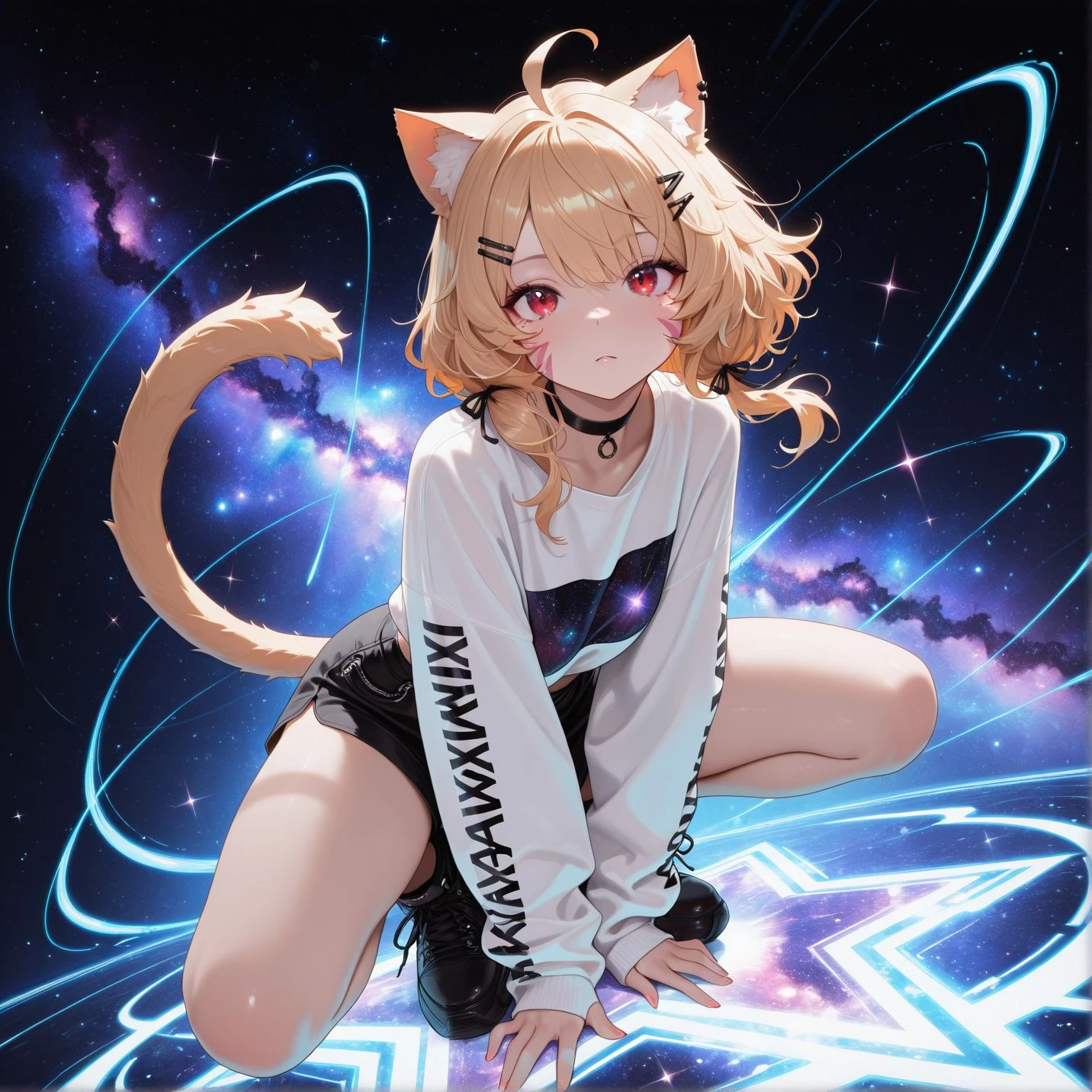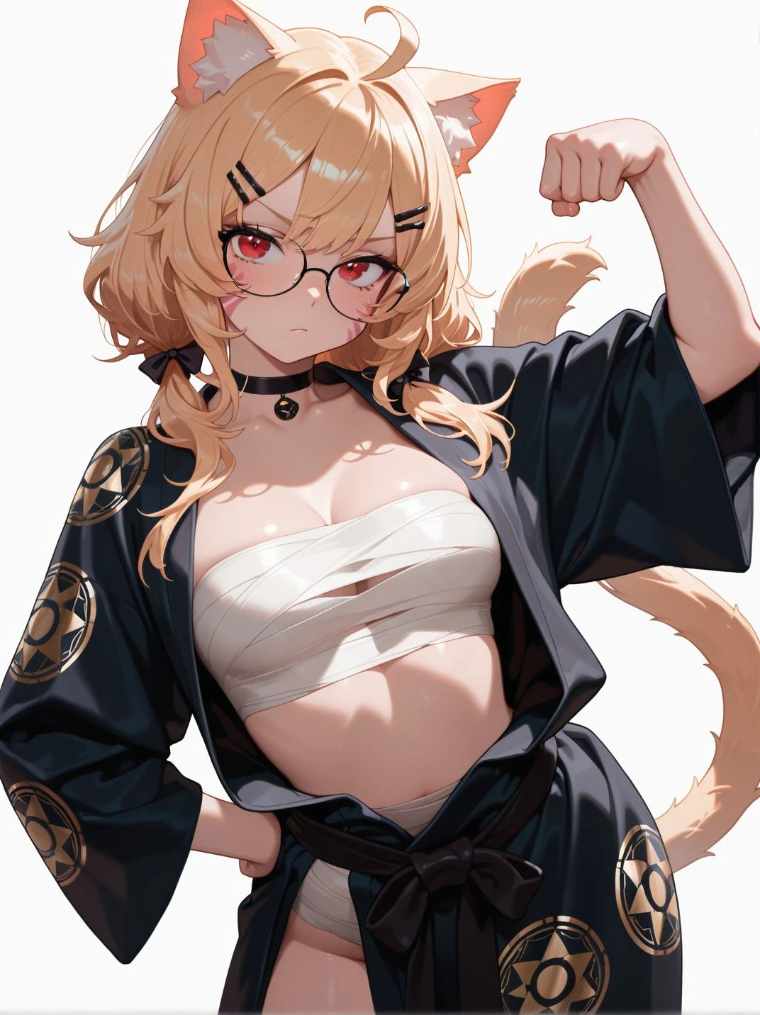 facial mark, cat ears, animal ears, tail, cat girl, blonde hair, ahoge, hair ornament, red eyes, hairclip