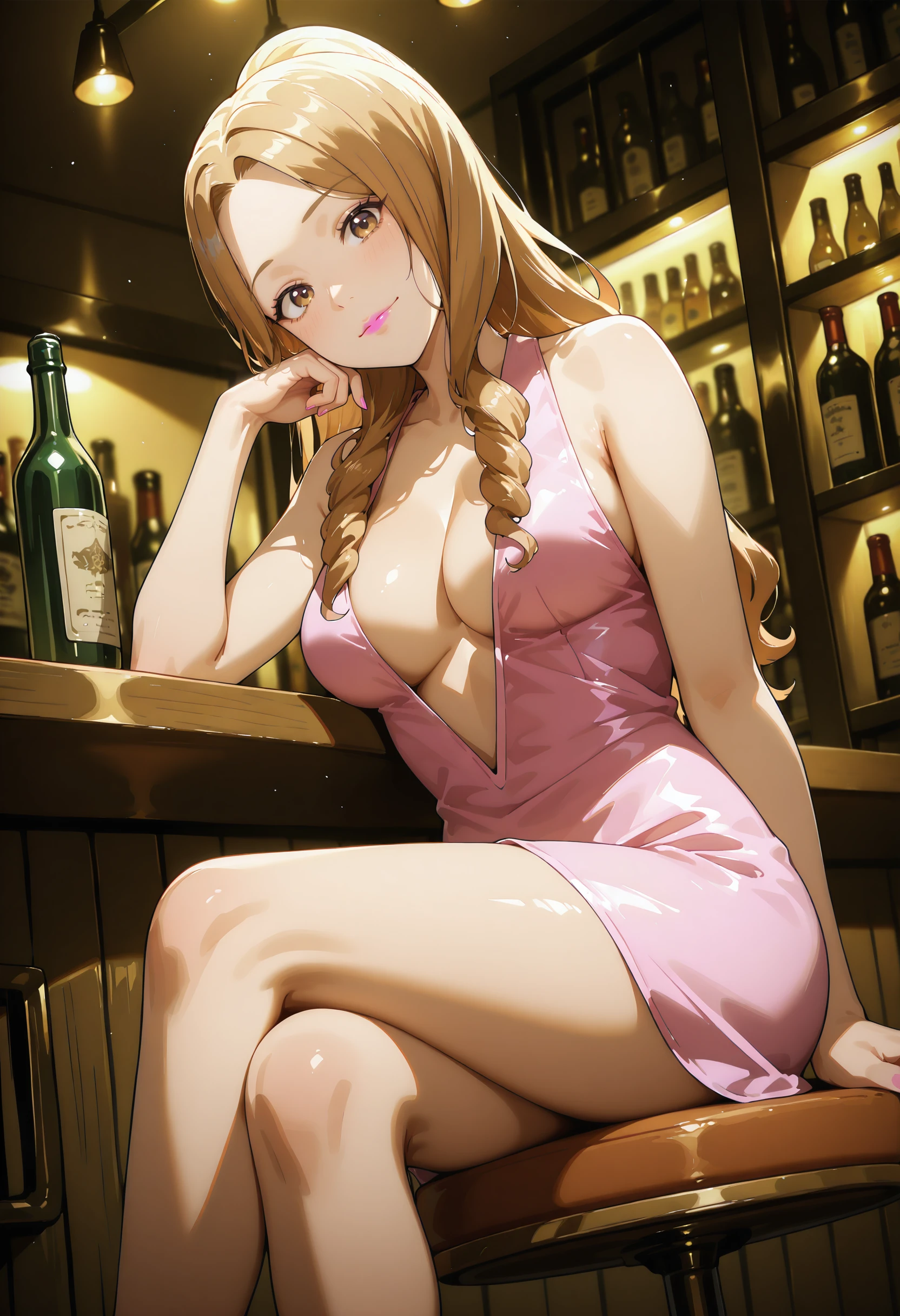 #1: pink dress, plunging neckline, pink high heels, pink nails
