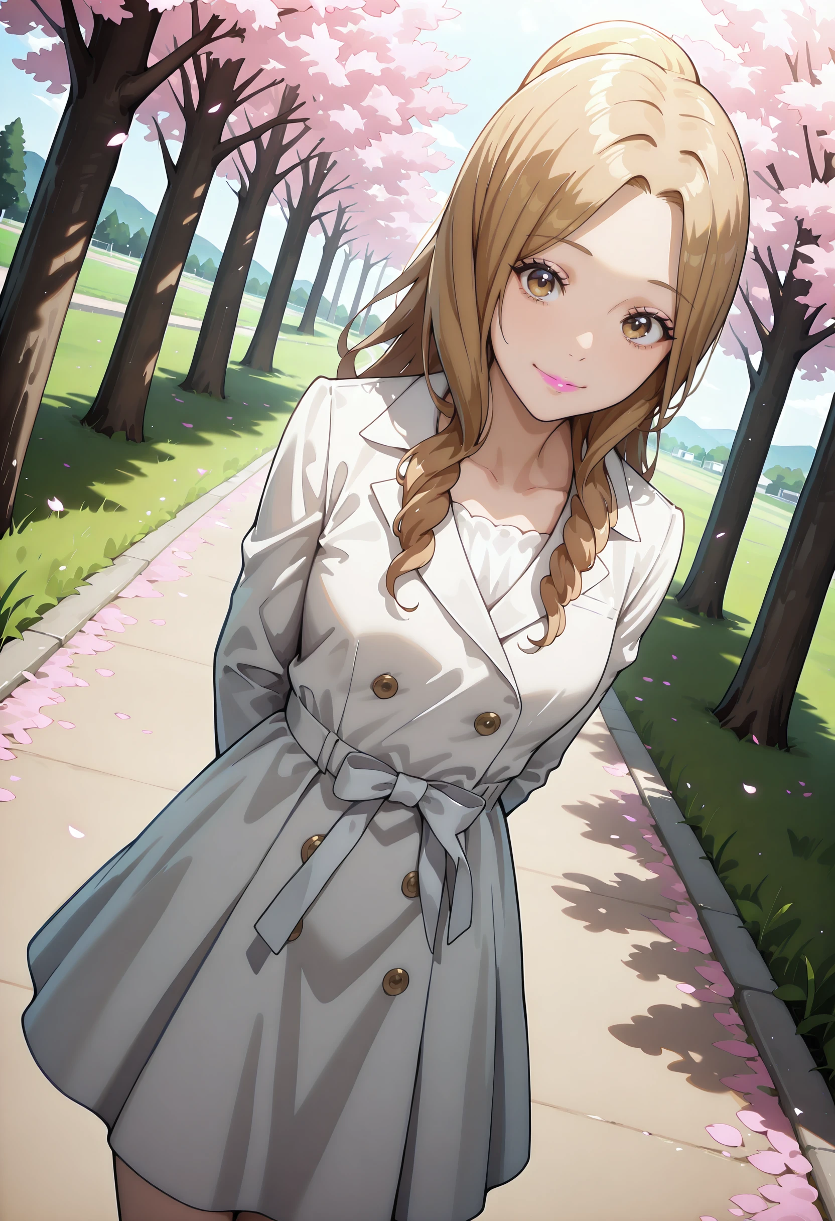 HomeHeroHibiki, brown eyes, long hair, drill hair, brown hair, pink lipstick — Adding "dusk" to negative tags can counteract the models propensity for yellowish lighting