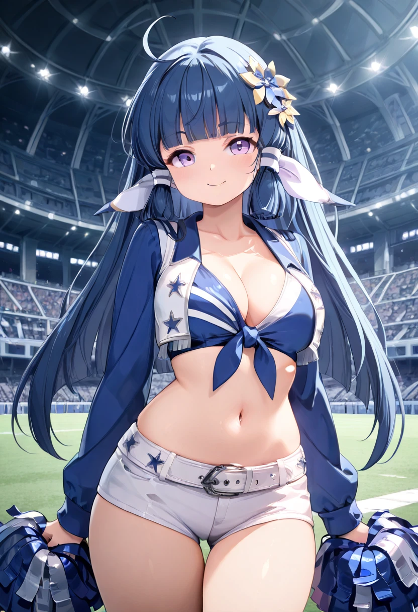 zzNanoha, purple eyes, ahoge, blue hair, hair tubes, long hair, blunt bangs,
