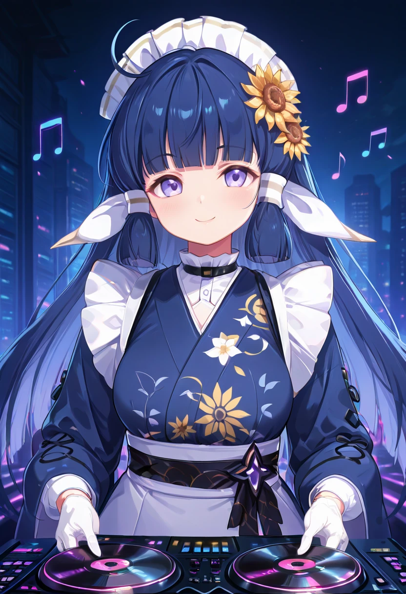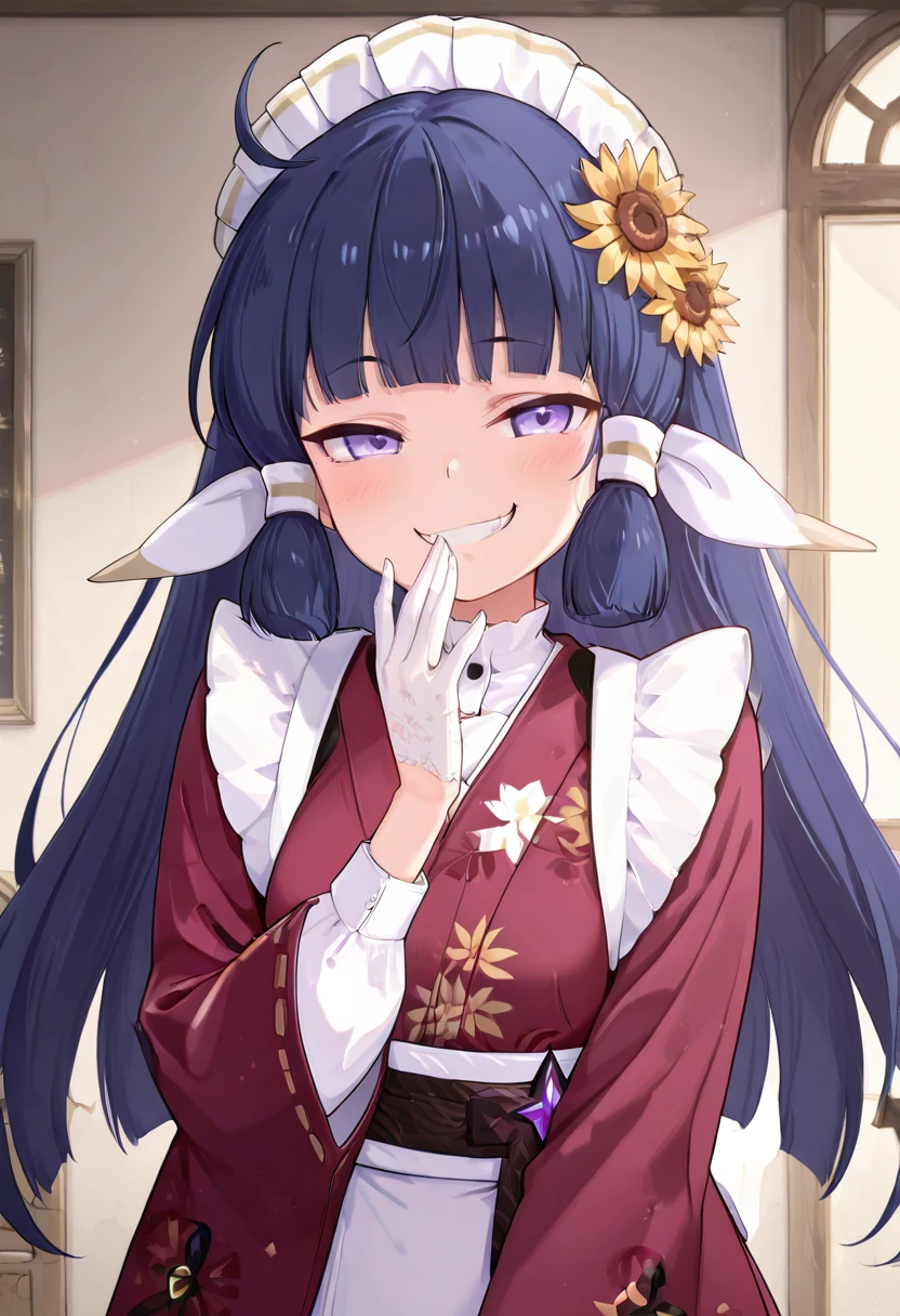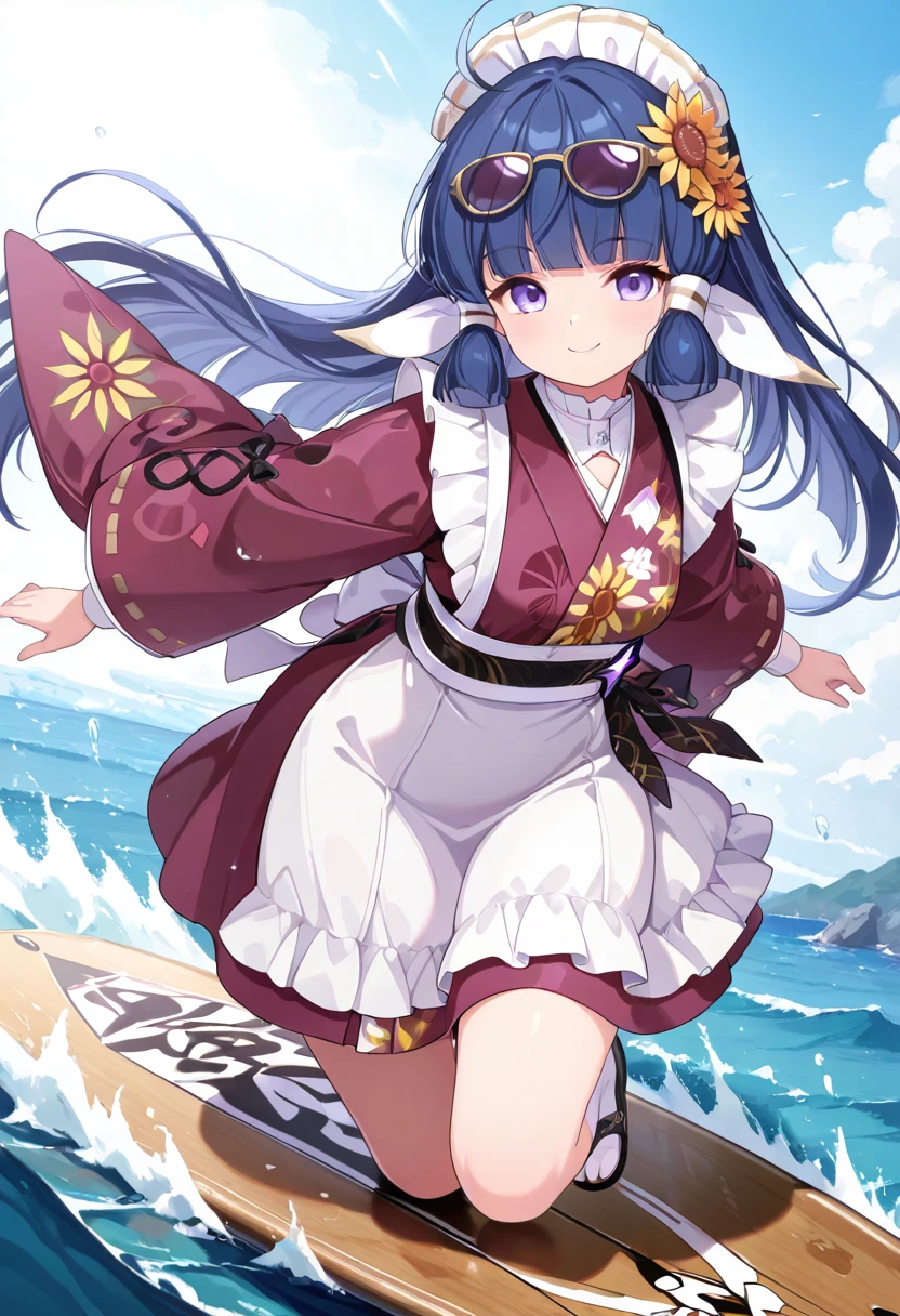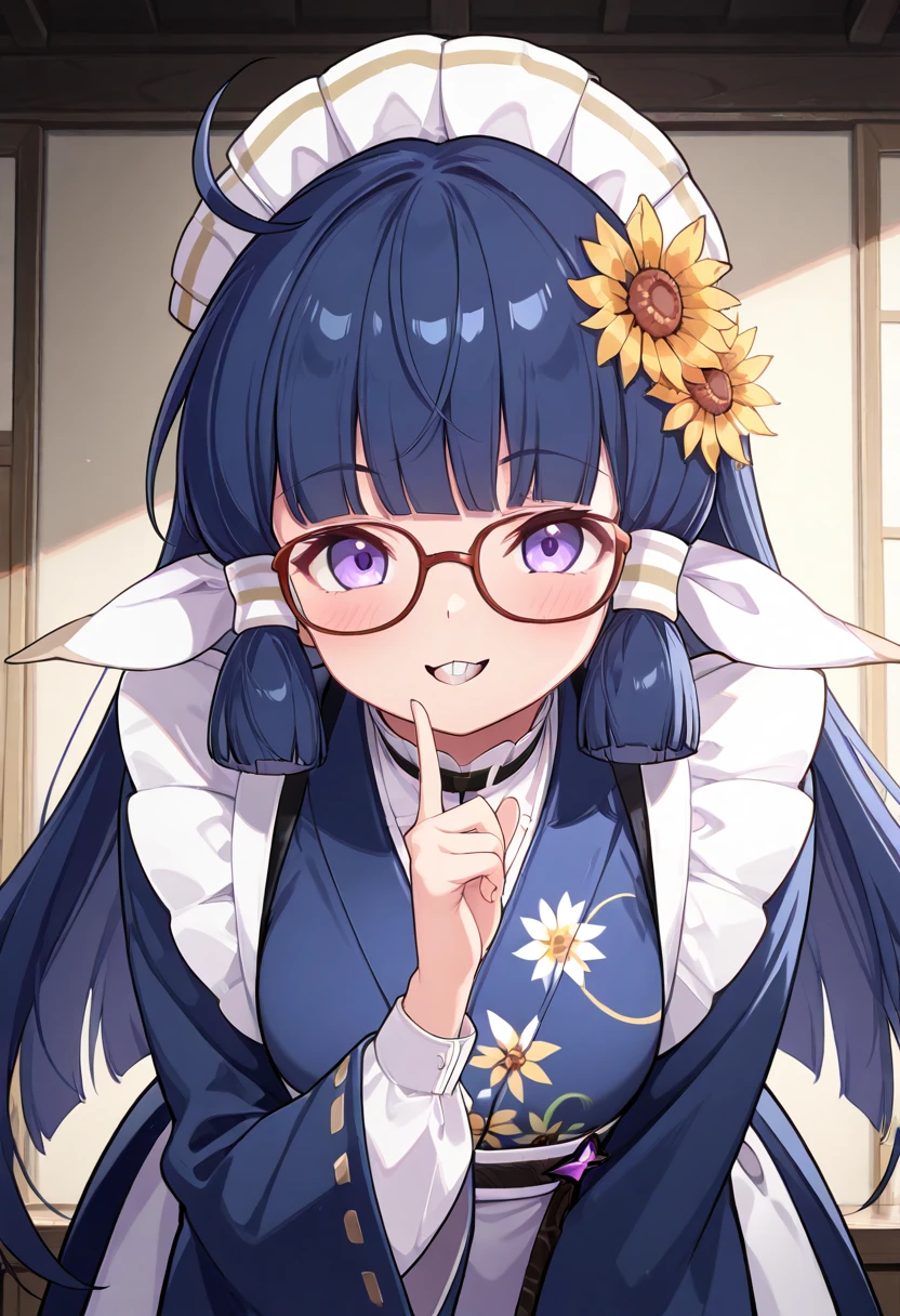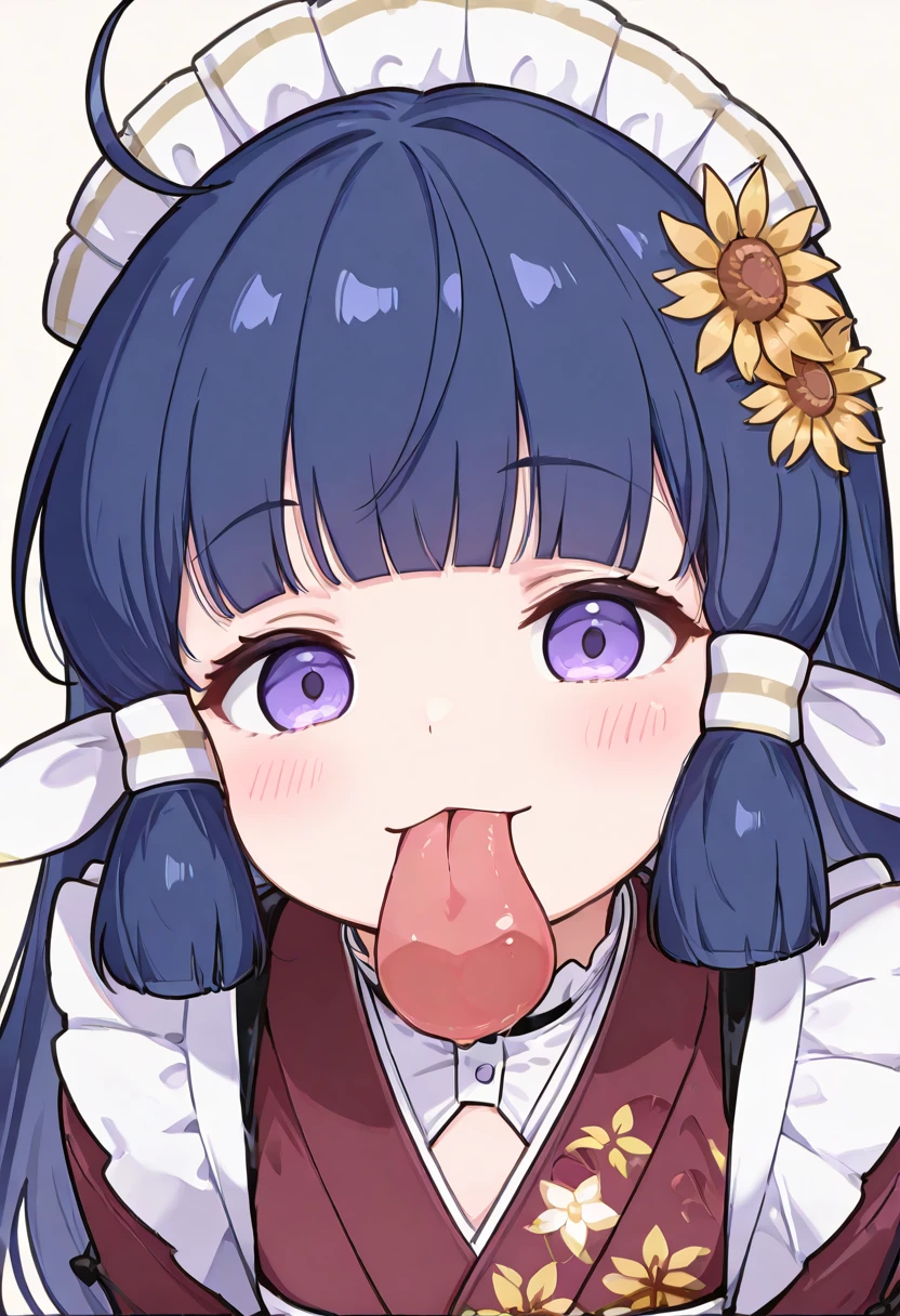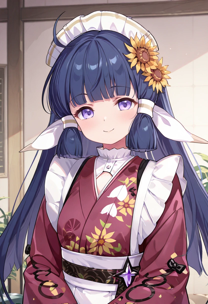 zzNanoha, purple eyes, ahoge, blue hair, hair tubes, long hair, blunt bangs, maid headdress, flower, hair ornament, hair flower, japanese clothes, kimono,