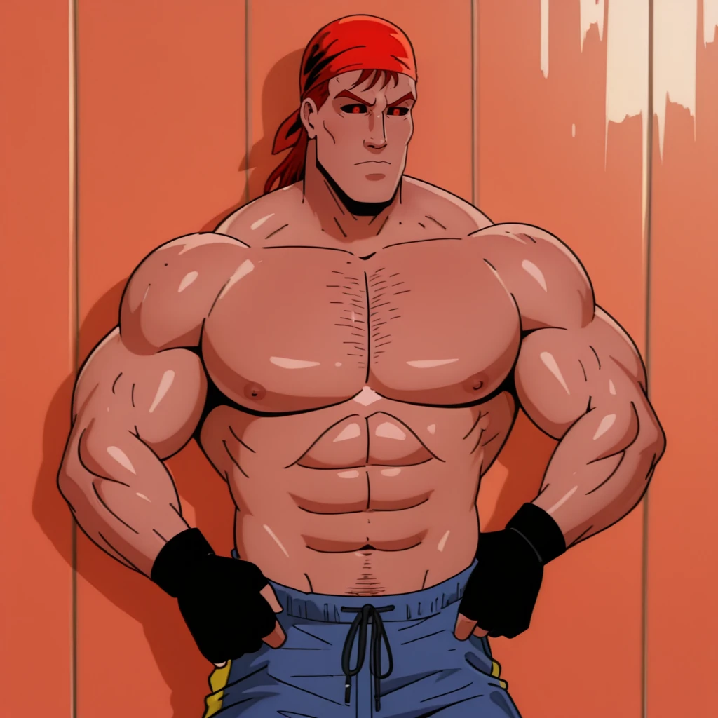 Trigger with basketball: Gambit92Basketball, topless male, abs, nipples, bara, large pectorals, bandana, fingerless gloves, navel hair, pants, short hair, thick eyebrows, stomach, mature male, black sclera,