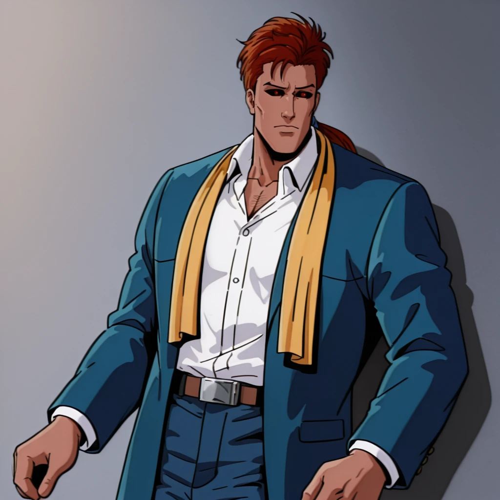Trigger with suit: Gambit92Suit, white shirt, scarf, pants, blue jacket, belt, brown hair, dark skin, ponytail, collared shirt, black sclera, cowboy shot