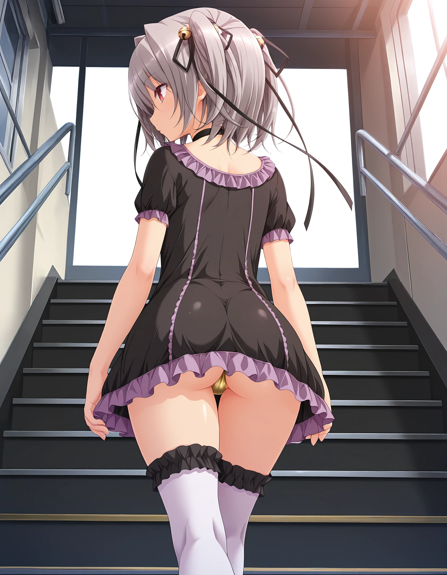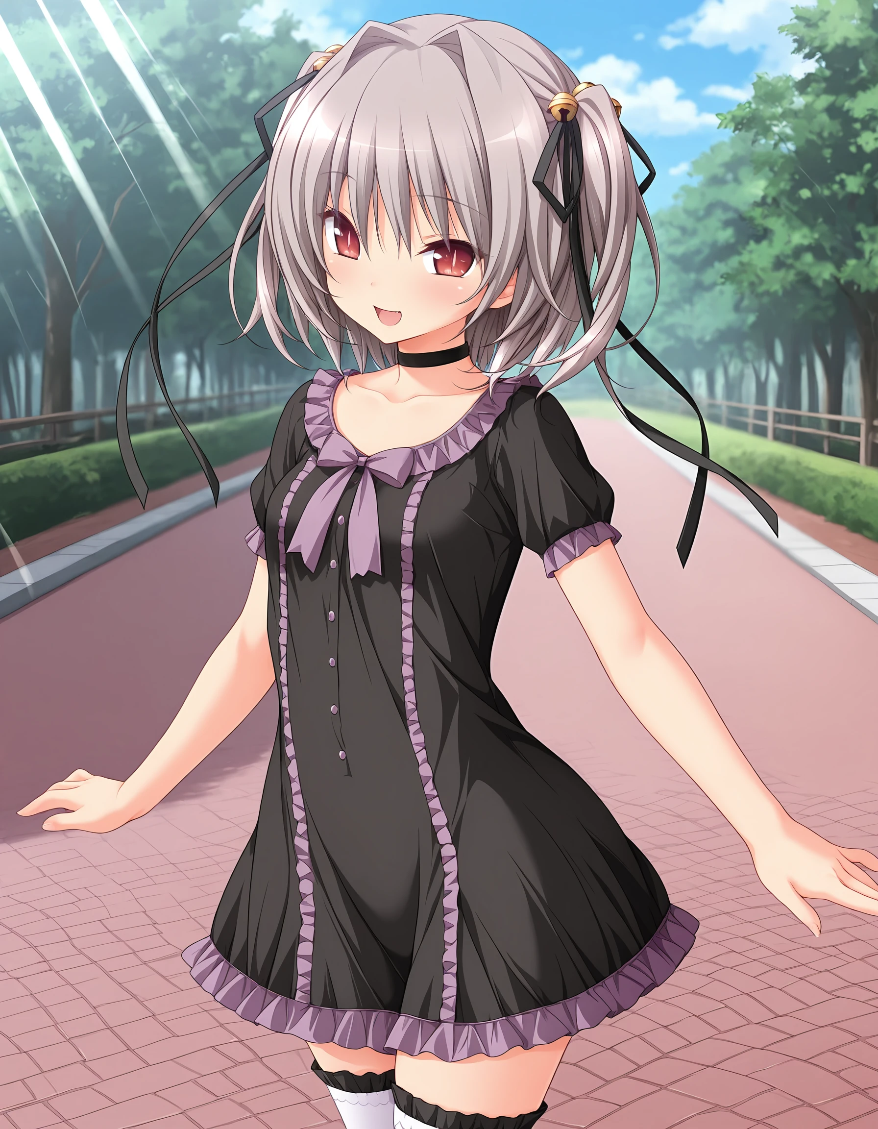 outfit02, choker, black choker, dress, one-piece dress, short dress, black dress, frills, purple frills, frills decollated dress, short sleeves, puffy short sleeves, ribbon, purple ribbon, white thighhighs, black frill trimmed thighhighs, zettai ryouiki, hairbow, black hairbow, bells on hairbow, yellow bells on hairbow,
