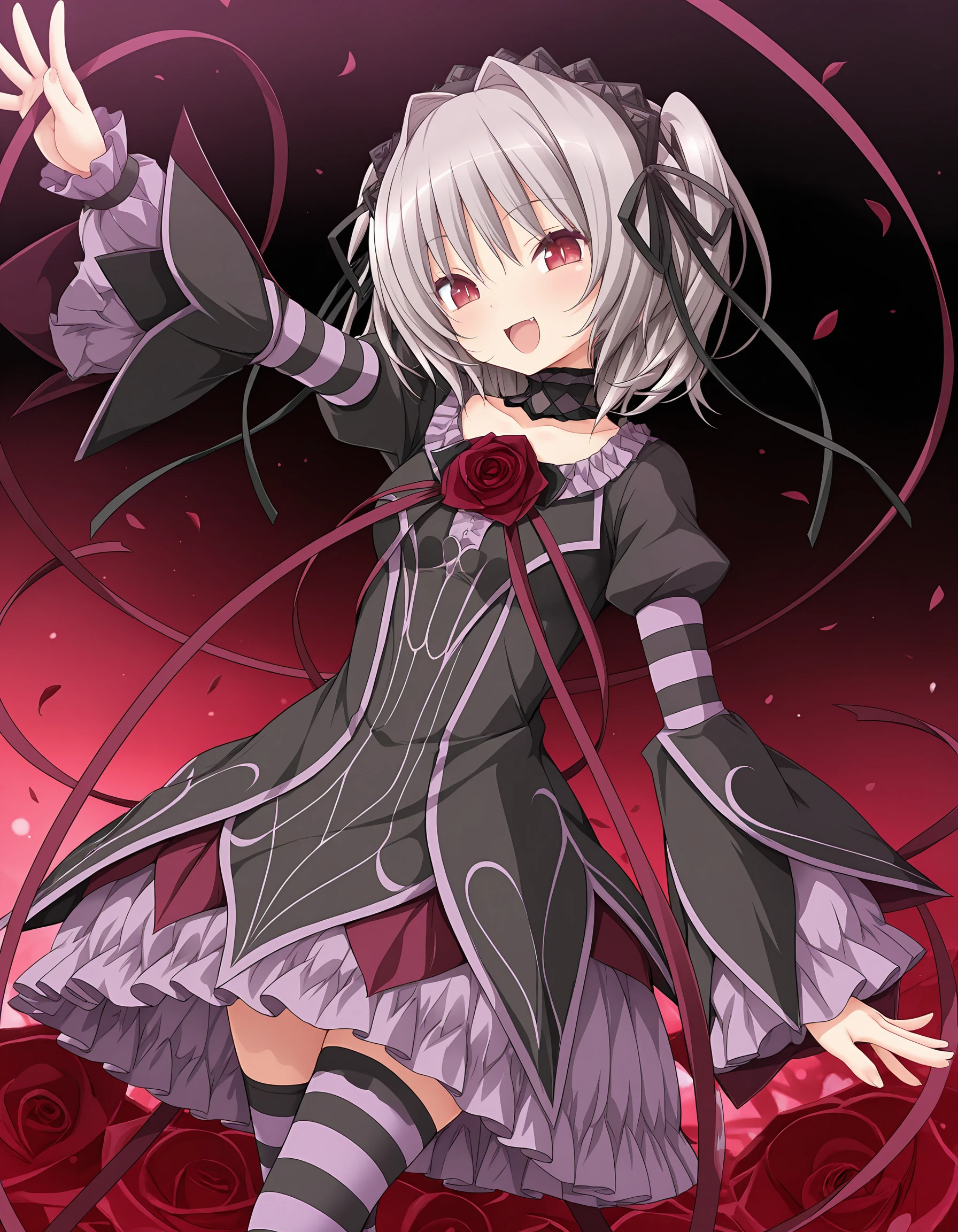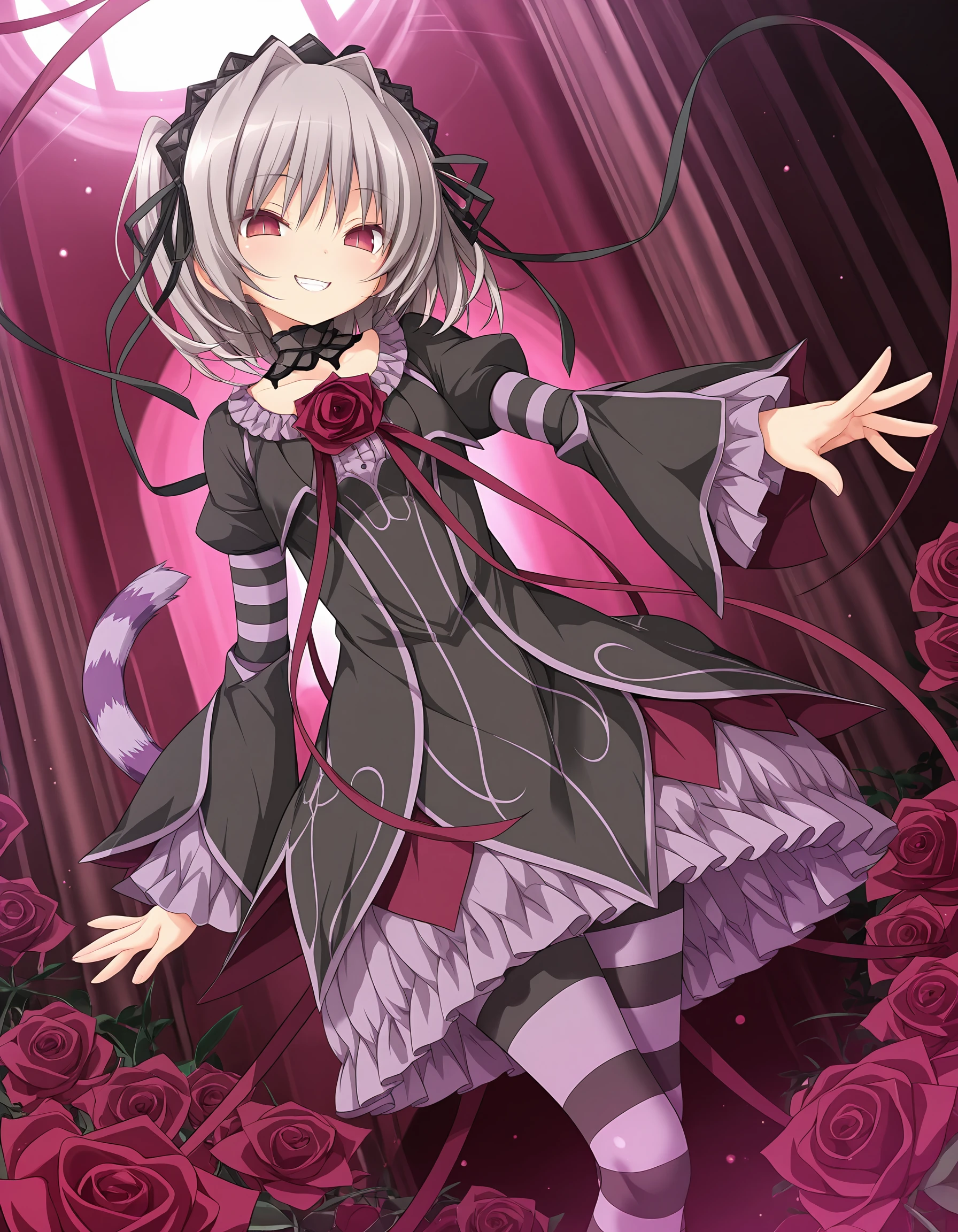 outfit03, hairbow, black hairbow, brim, black brim, dress, black dress, gothic dress, frilled dress, rose on dress, ribbon, red ribbon, ribbon extending from dress, long sleeves, puffy sleeves, wide sleeves, striped sleeves, cuffs, frill cuffs, thighighs, striped thighhighs, purple thighhighs, tail, purple tail, cat tail, striped tail,