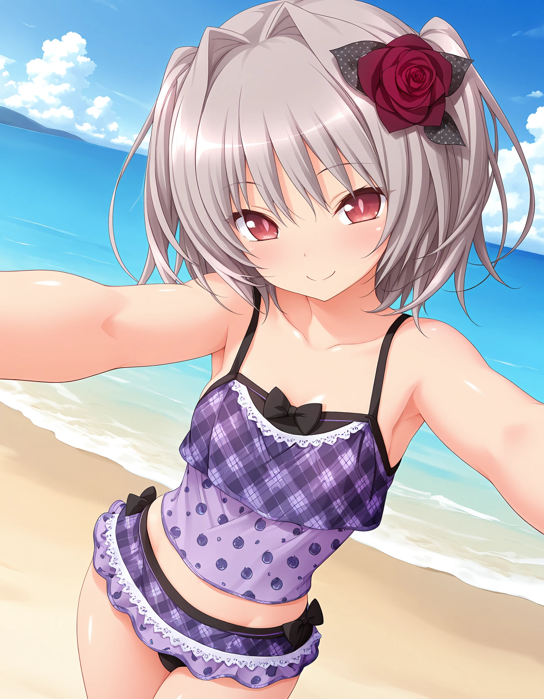 outfit04, swimsuit, 2-piece swimsuit, purple swimsuit, ribbon swimsuit, plaid swimsuit, pattern swimsuit, lace trimmed swimsuit, tankini, tank top, rose on hair,