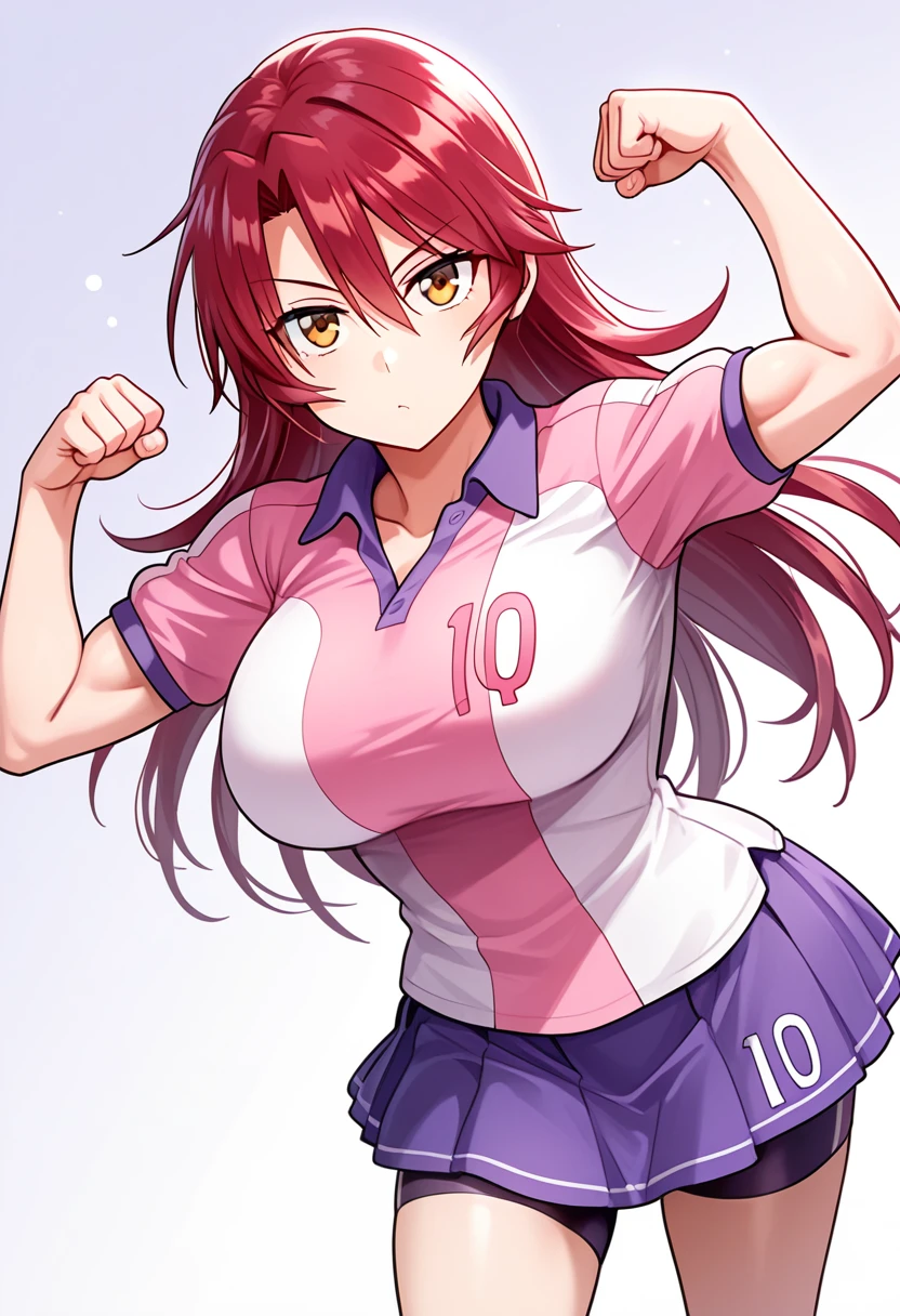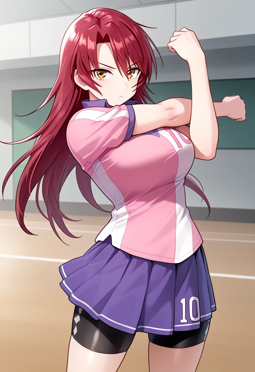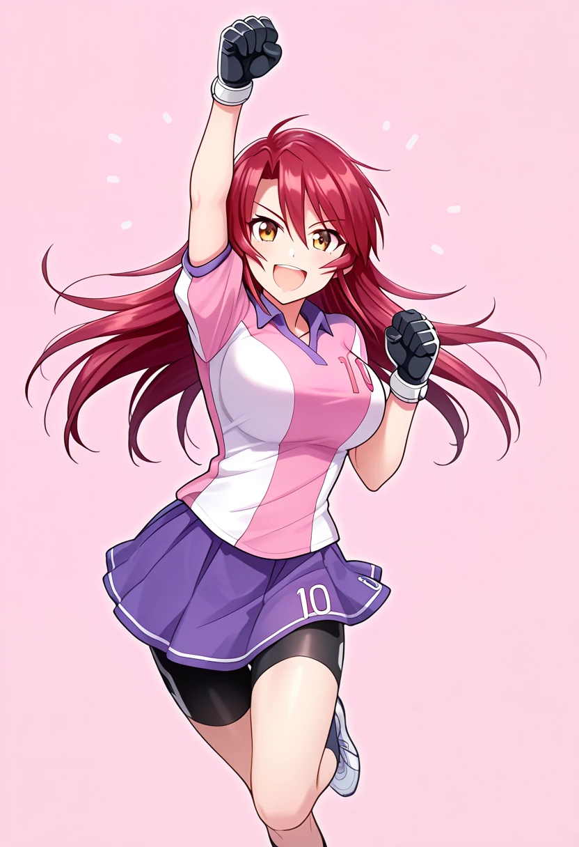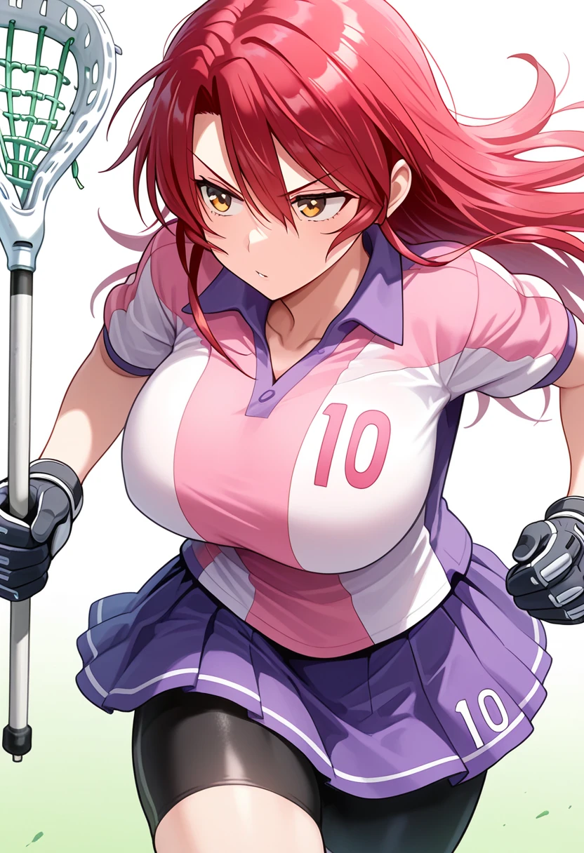 lacrosse outfit: ayalacu-uniform, ayalacu-pink-shirt, pink shirt, number print, ayalacu-purple-skirt, purple skirt, pleated skirt, bike shorts, joshilacu-gloves, joshilacu-lacrosse-stick