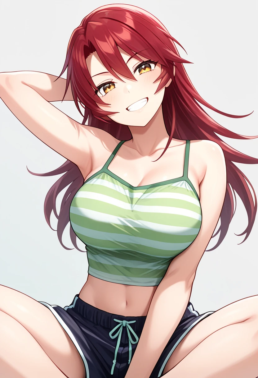 casual clothes: green stripped crop camisole, crop top, shorts