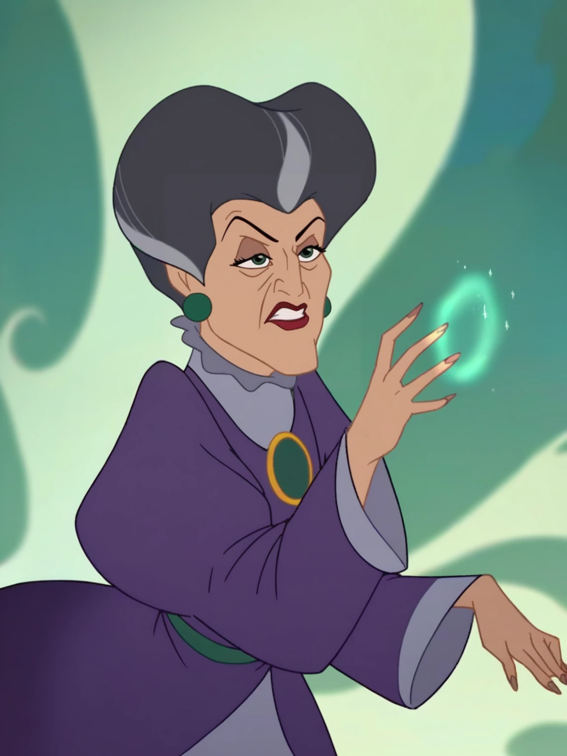 l_tr, 1girl, green eyes, gray hair, high heart-shaped pompadour hair, hooked nose, creases on down eyes, red lips, earrings