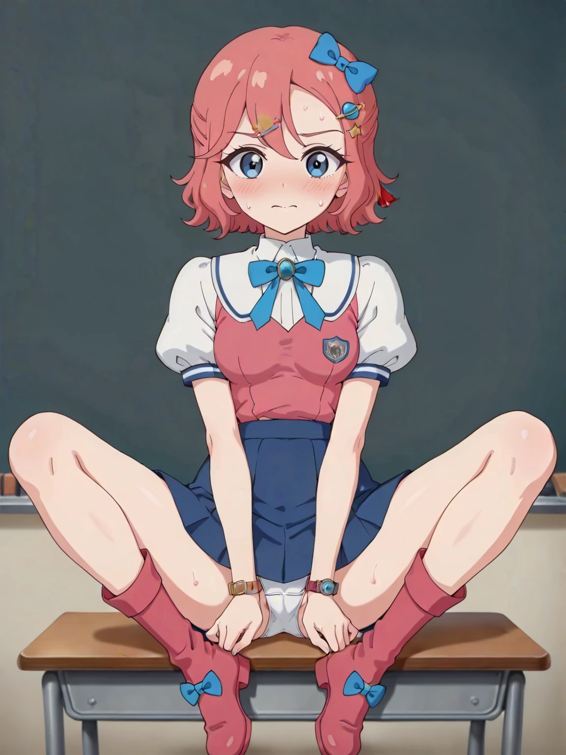 バース内:otome_verse,future_school,pink hair, short hair, blue eyes ,hair bow,bow,blue bow,shirt,pink shirt,skirt,boots,short sleeves,pink footwear,puffy sleeves,watch,jewelry,pleated skirt,blue skirt,puffy short sleeves,