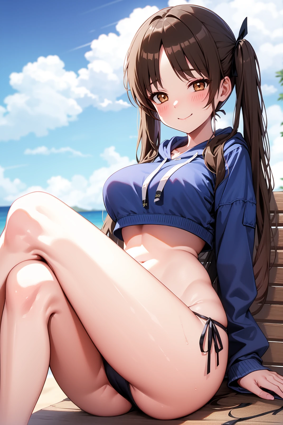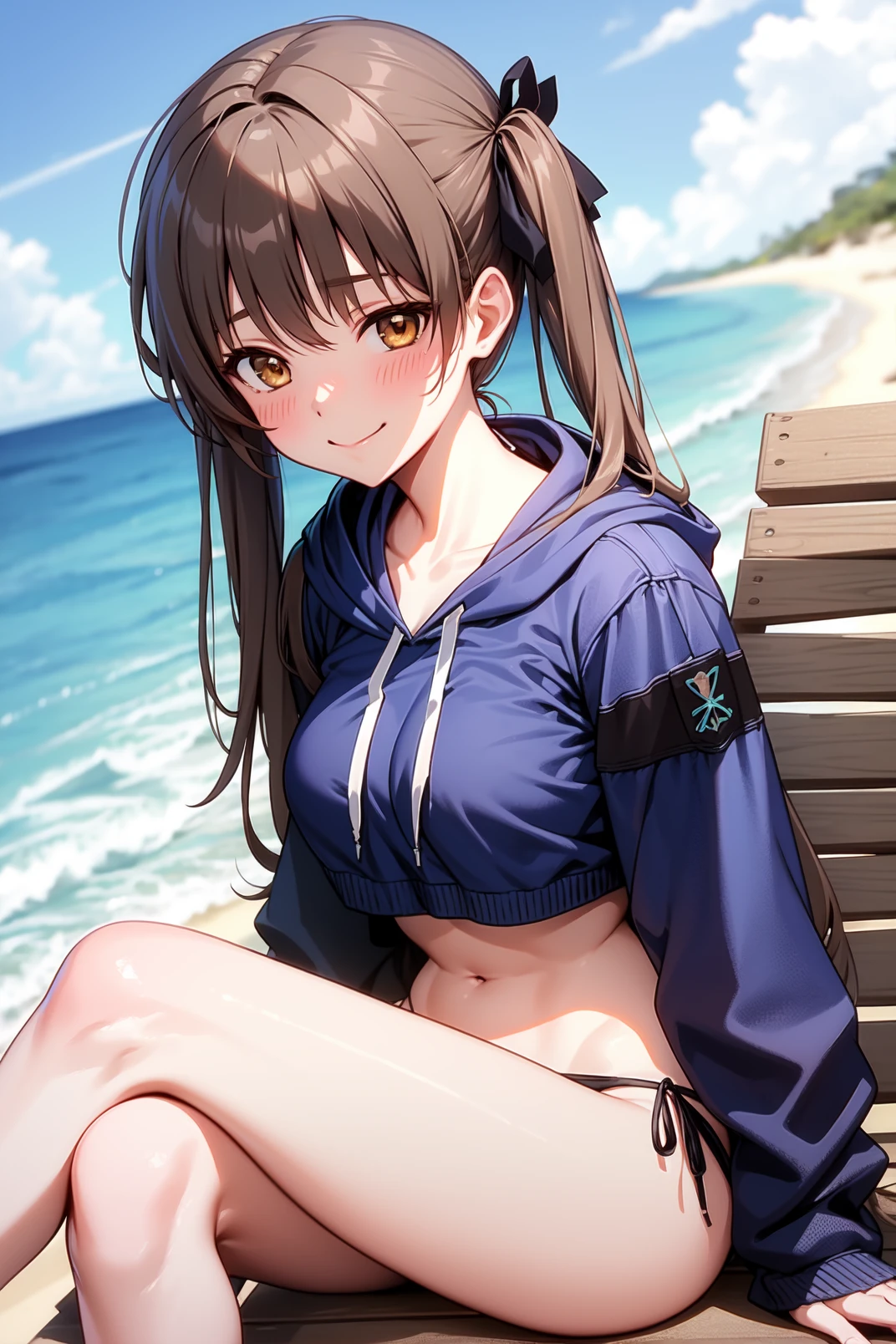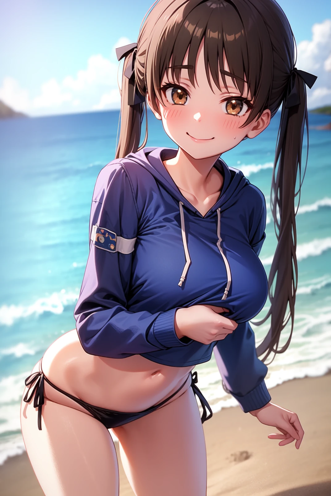 blue hoodie top, hood down, hood, groin, navel, swimsuit, black bikini, side-tie bikini bottom