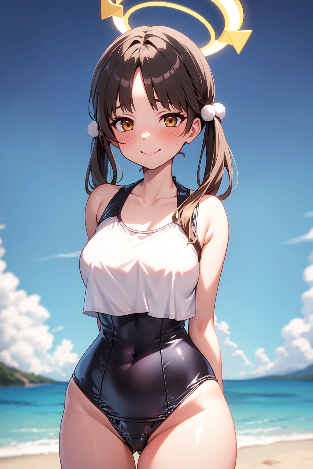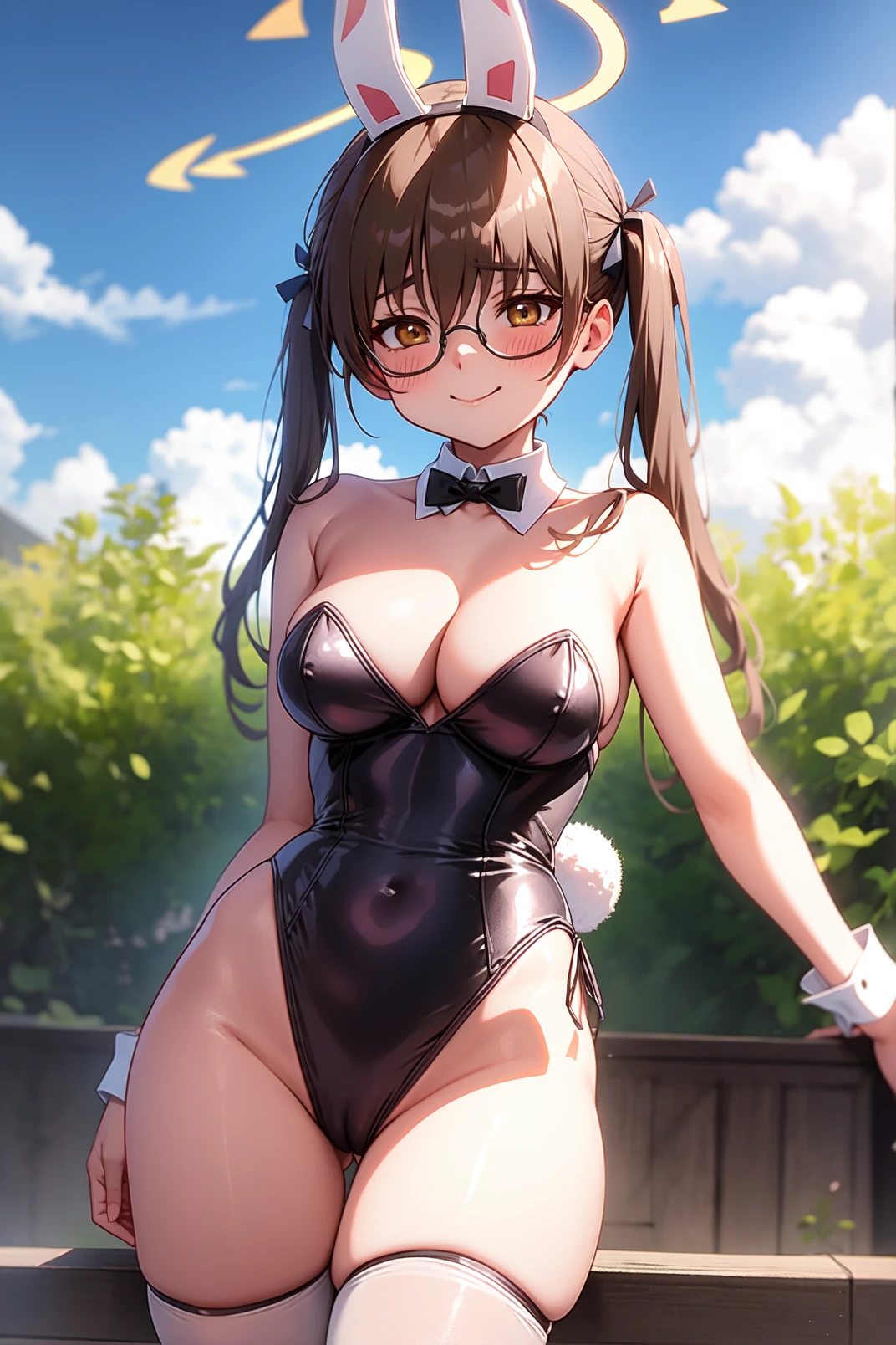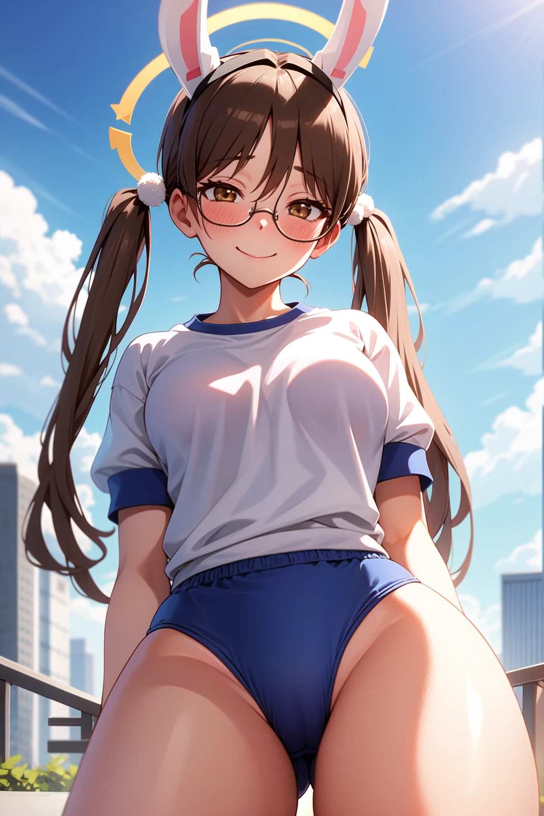 kazekura, brown eyes, brown hair, short hair, bangs, pom pom hair ornament, low twintails, fake animal ears, glasses, halo