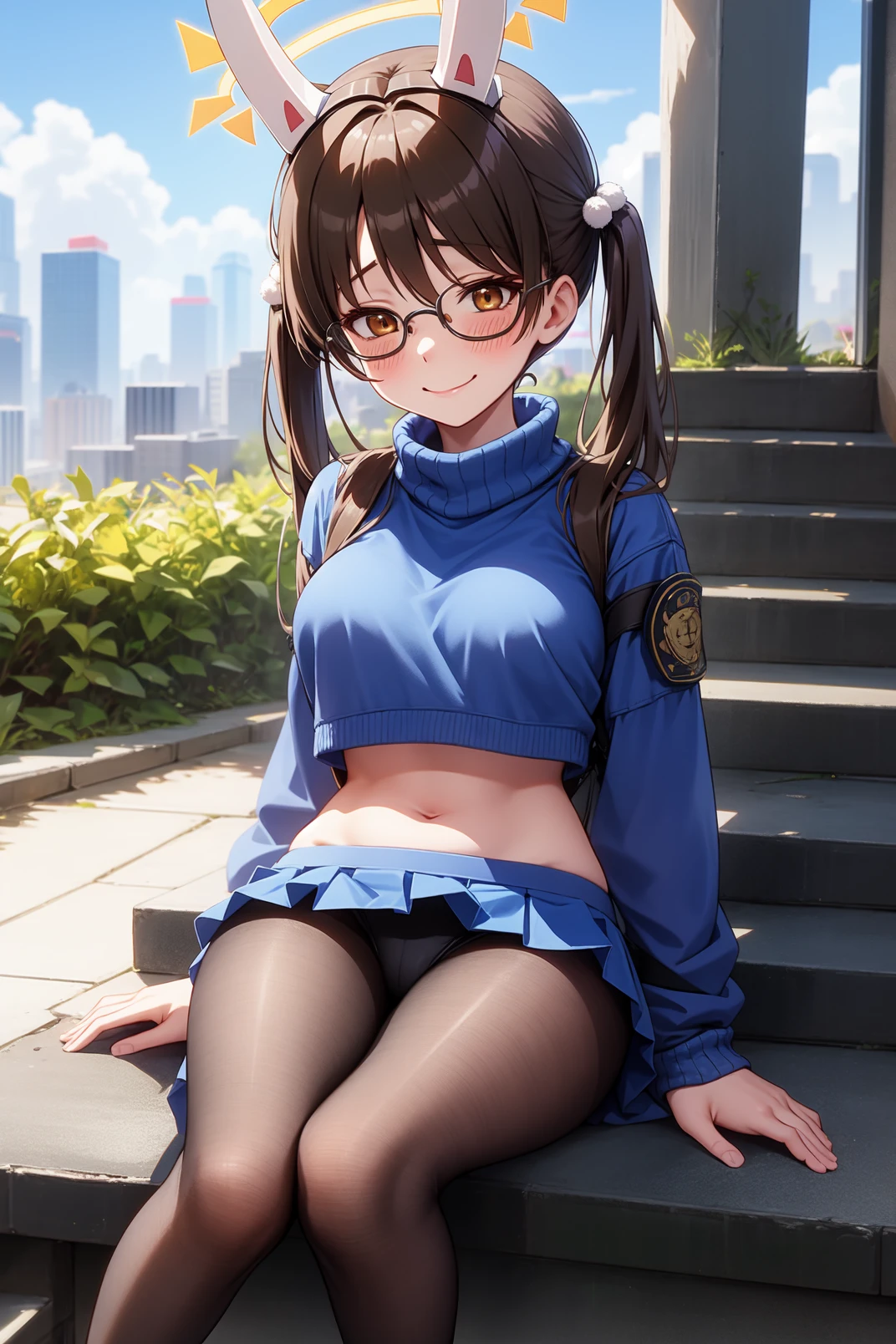 outfit: blue sweater, turtleneck, navel, blue skirt, pleated skirt, black pantyhose