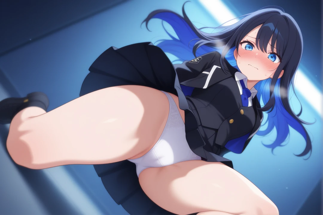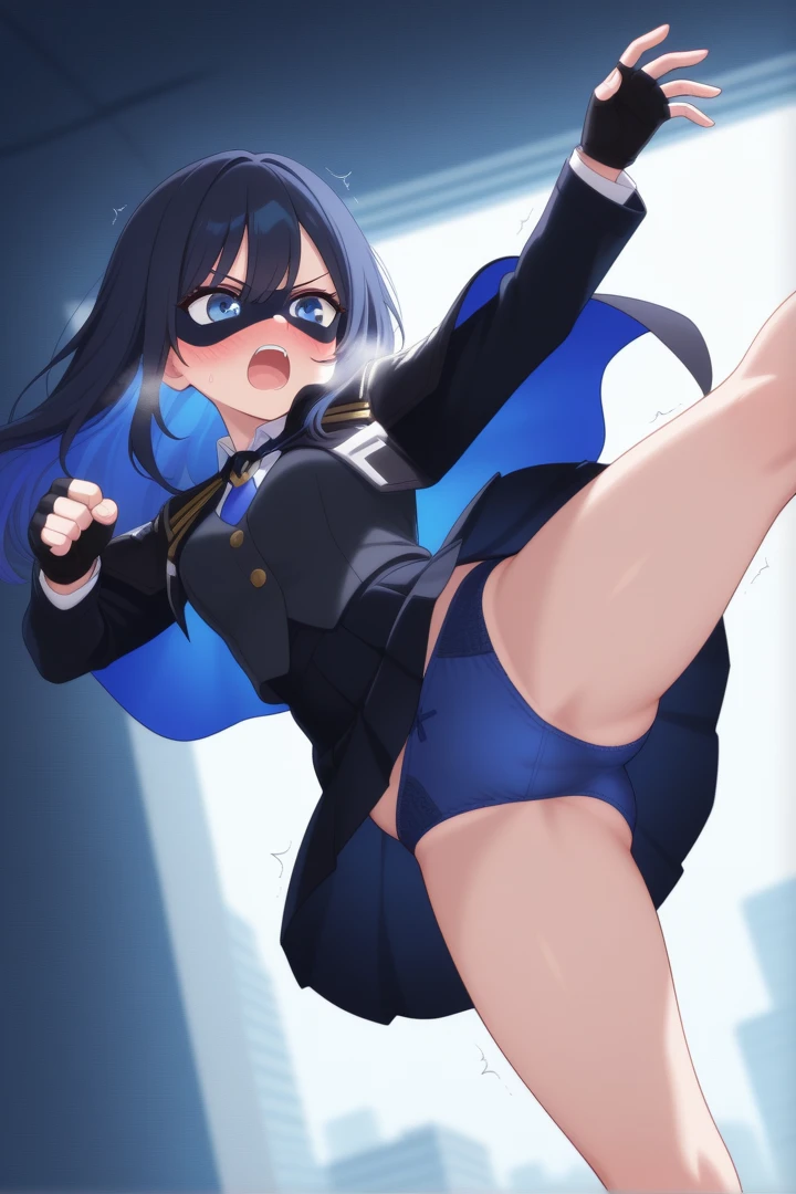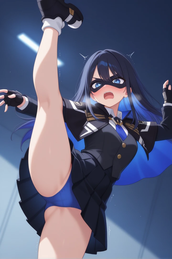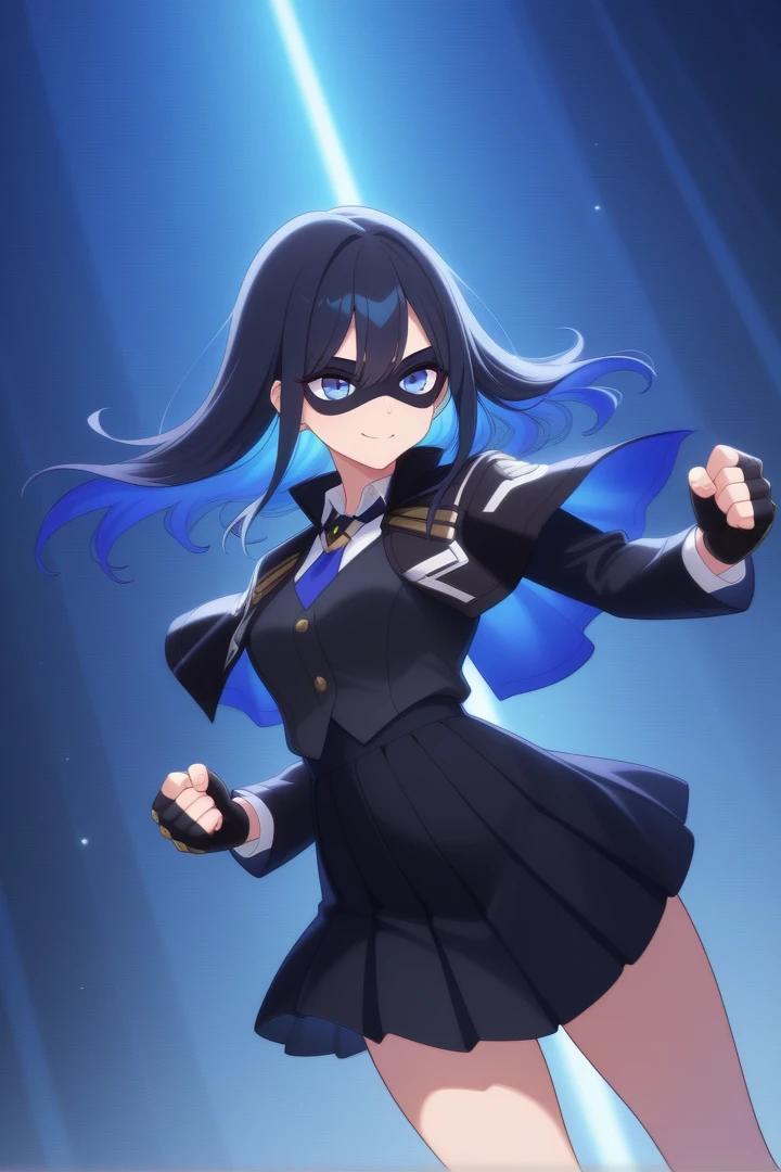 1girl, solo, ReyaMightreya, black hair, long hair, blue eyes, blue inner hair, black top, gold buttons, blue tie, white undershirt, black mantle with blue inners and white highlights, gold pips, black pleated skirt, fingerless gloves, black domino mask