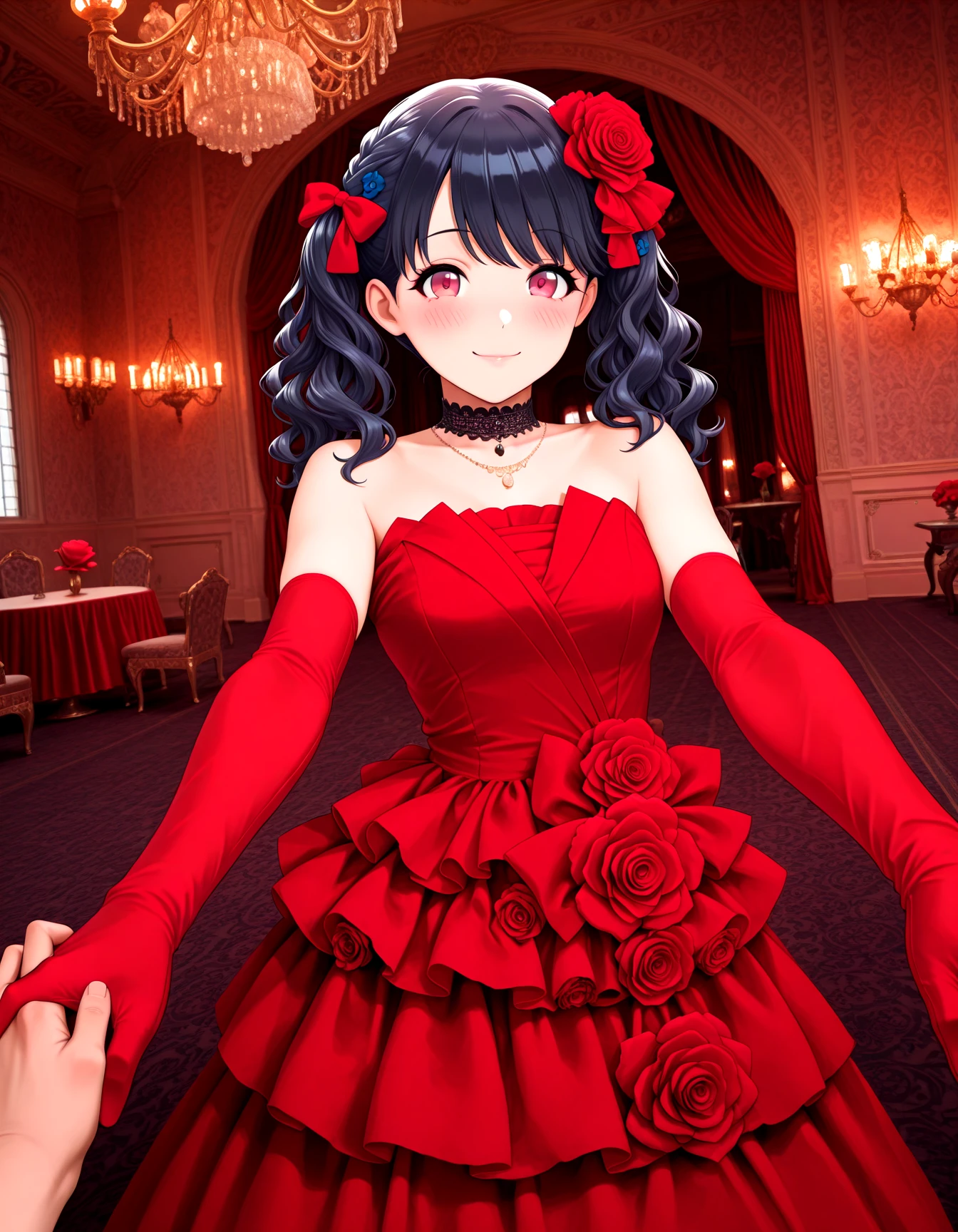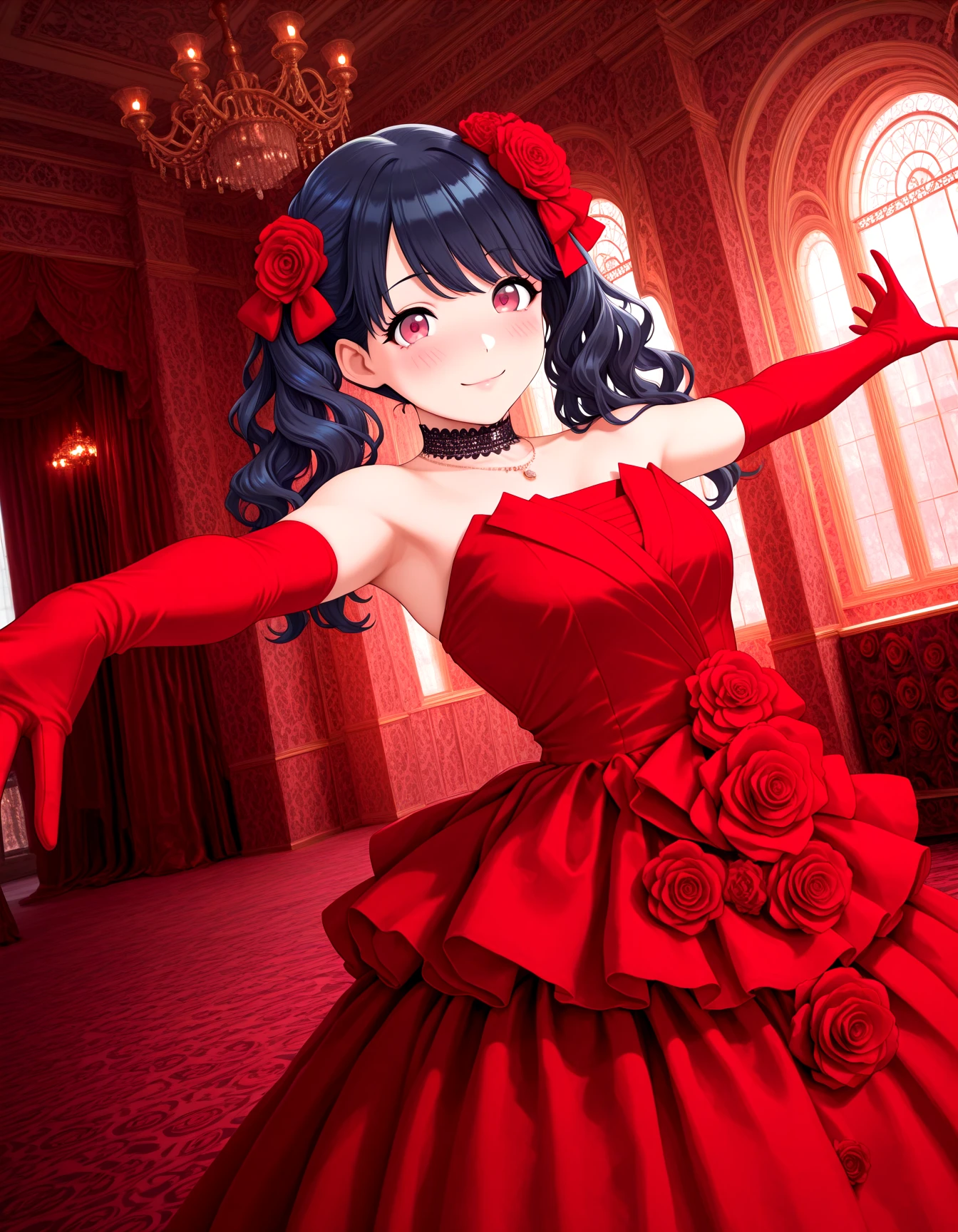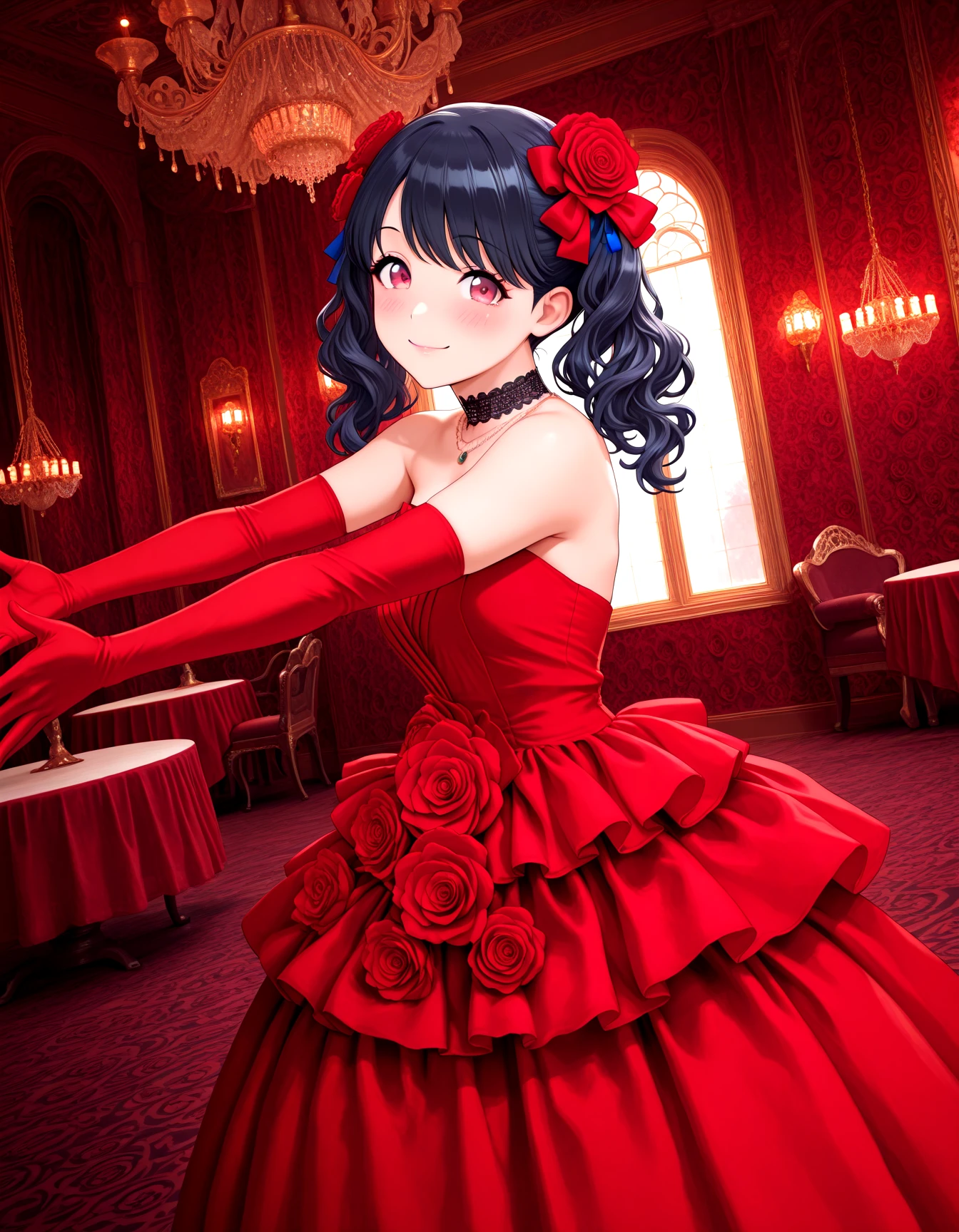 KUR1RG, elbow gloves, red gloves, red dress, strapless dress, long dress, gown, red flower, red rose, bare shoulders, hair ornament, hair flower, red bow, hair bow, black choker, lace choker, jewelry, dress flower, necklace, frills