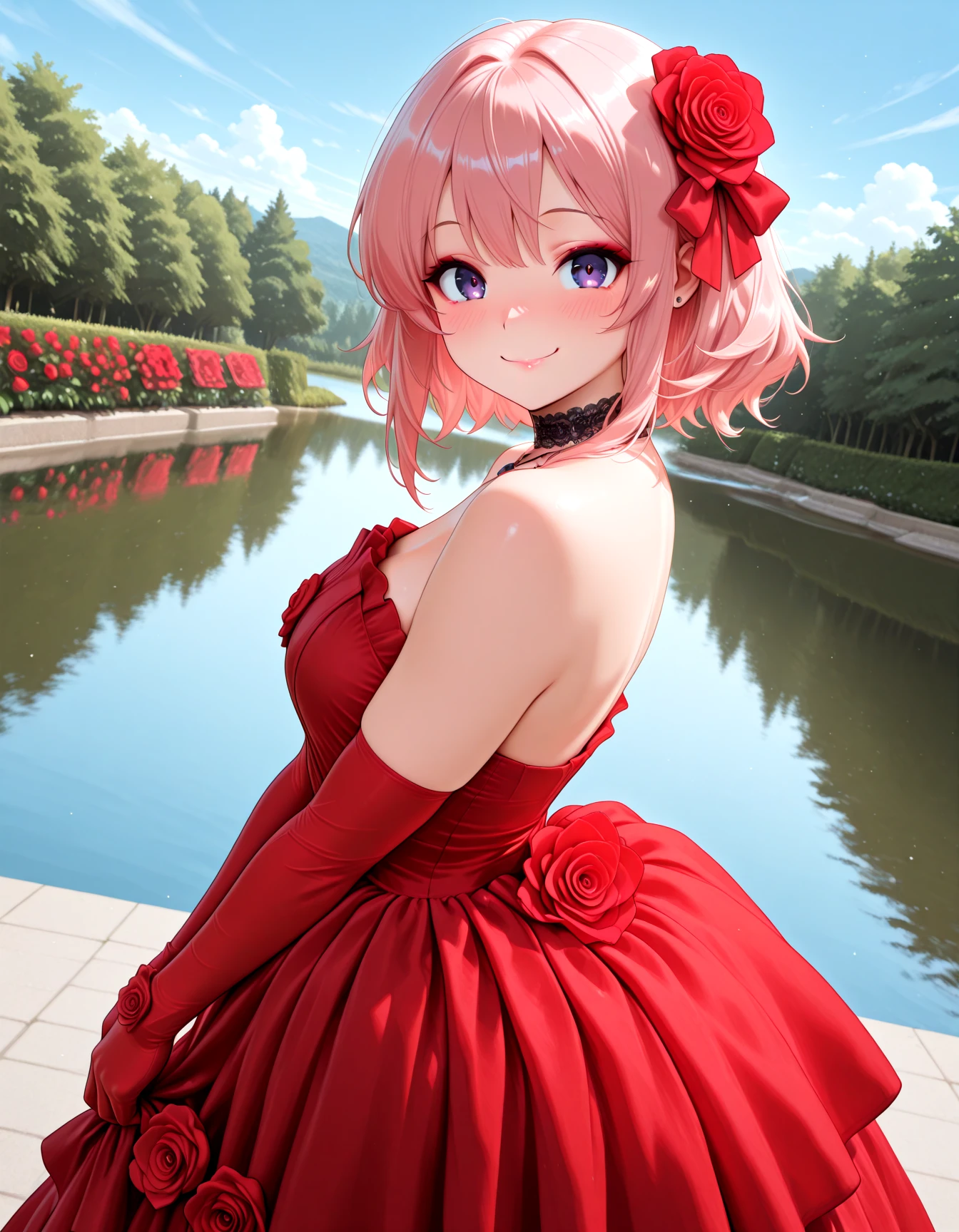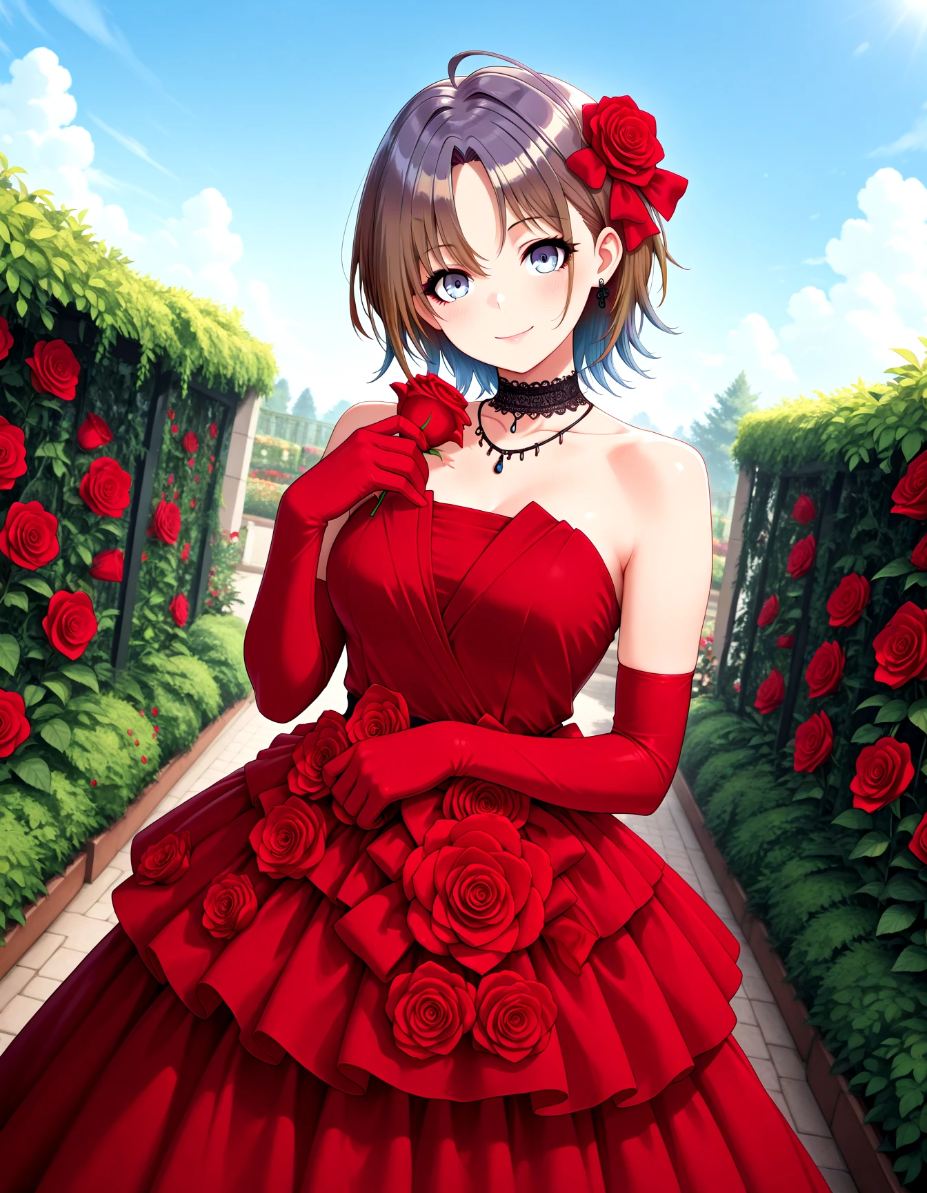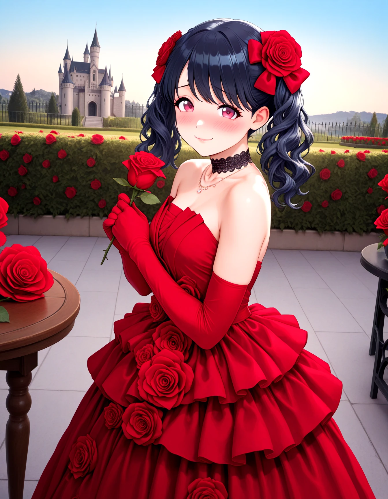 KUR1RG, elbow gloves, red gloves, red dress, strapless dress, long dress, gown, red flower, red rose, bare shoulders, hair ornament, hair flower, red bow, hair bow, black choker, lace choker, jewelry, dress flower, necklace, frills