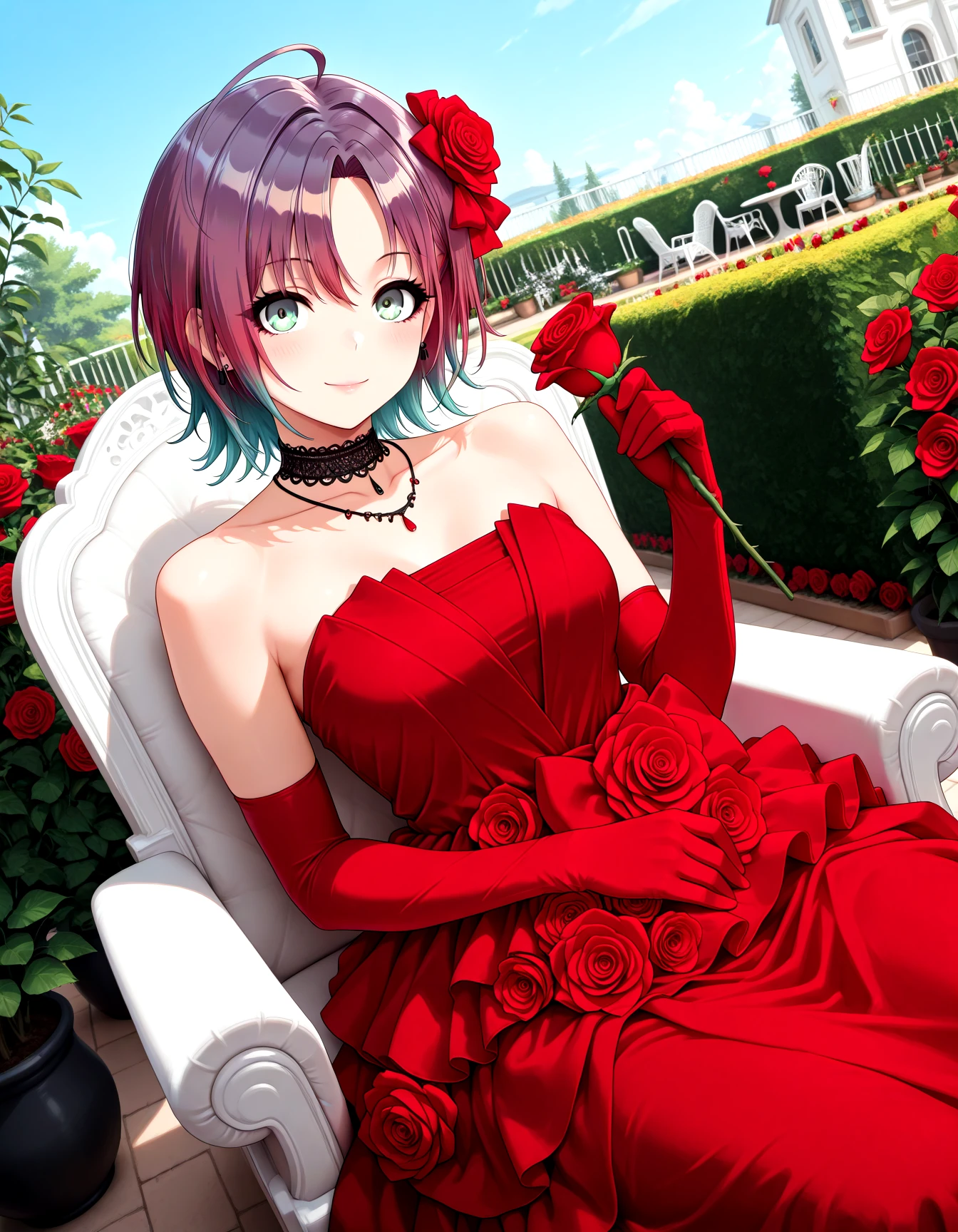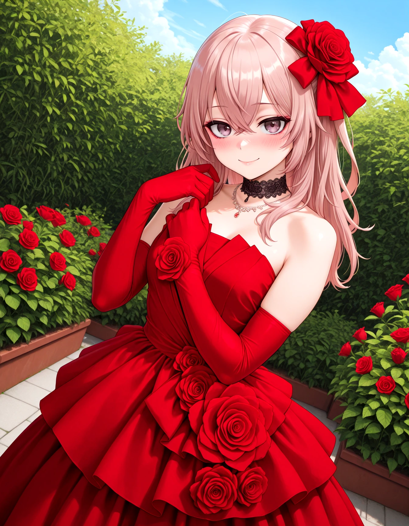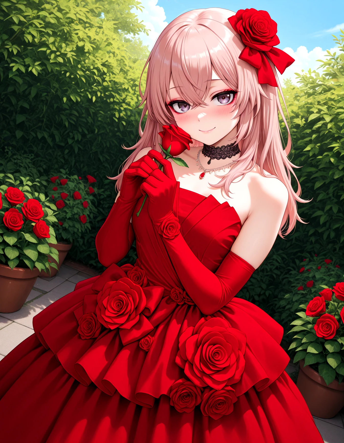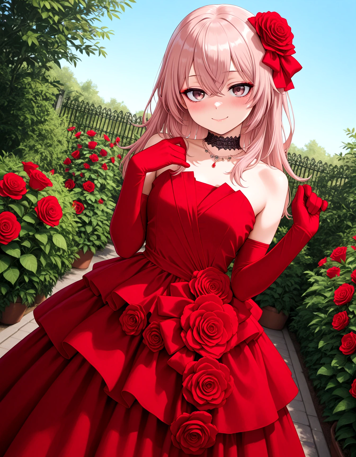 KUR1RG, elbow gloves, red gloves, red dress, strapless dress, long dress, gown, red flower, red rose, bare shoulders, hair ornament, hair flower, red bow, hair bow, black choker, lace choker, jewelry, dress flower, necklace, frills(holding rose)red themeDescription