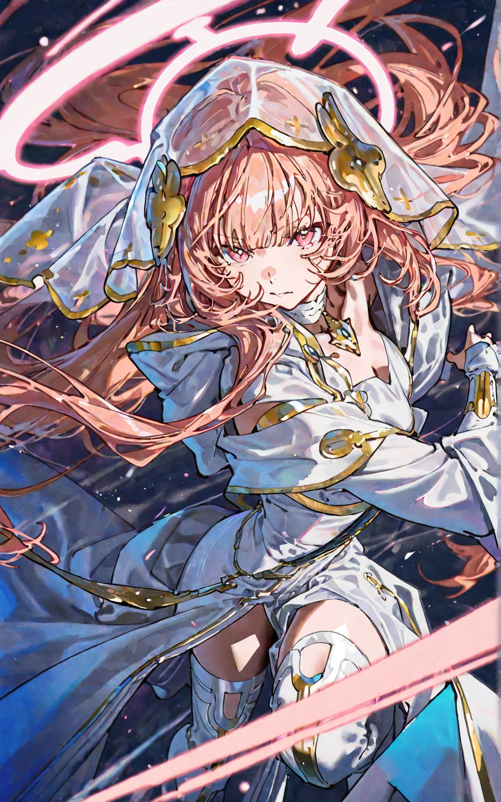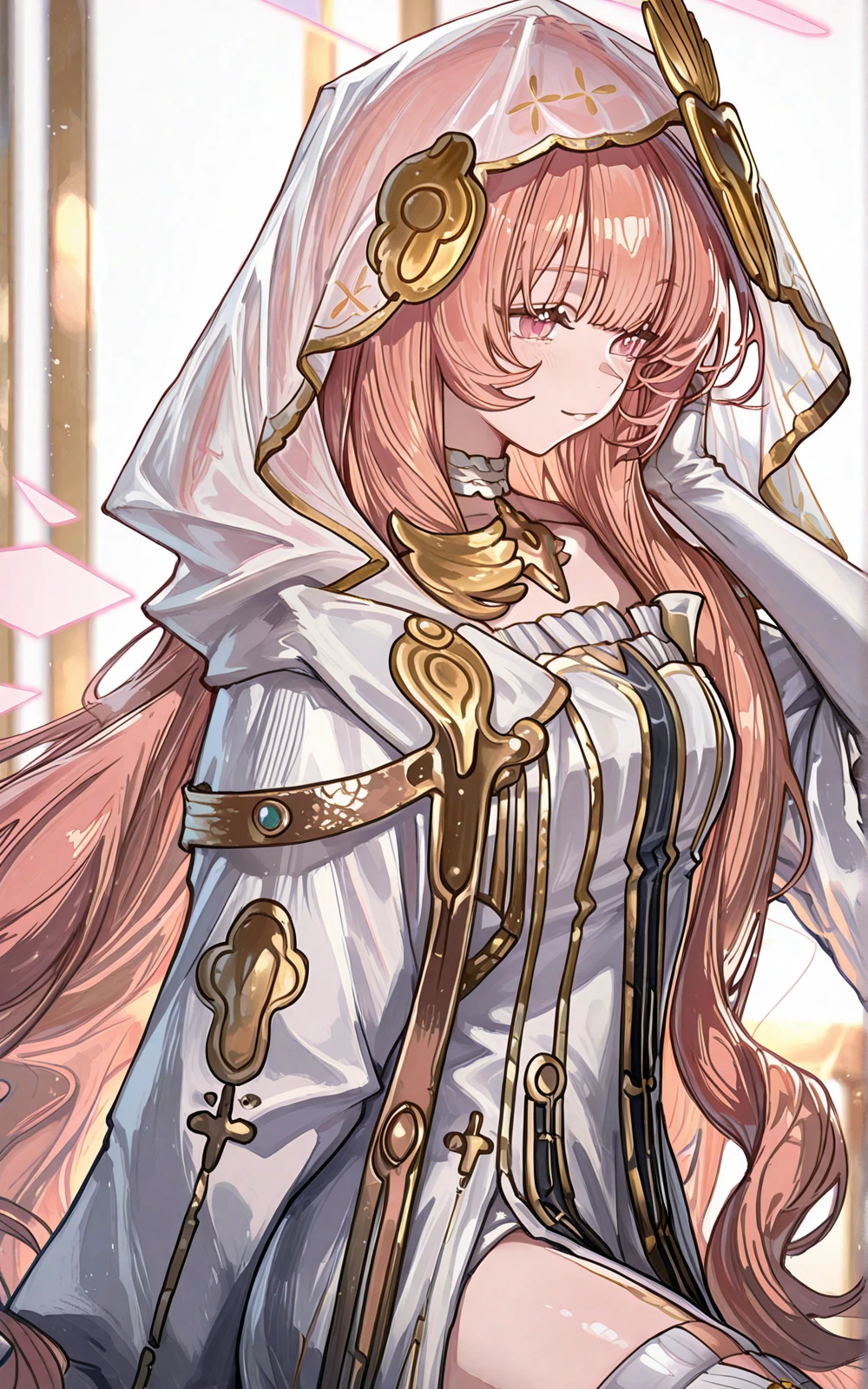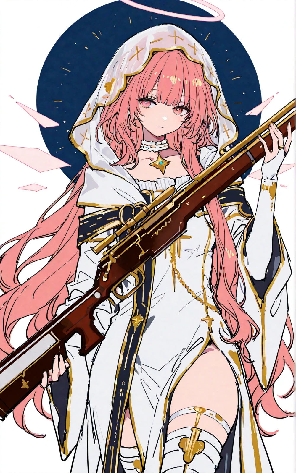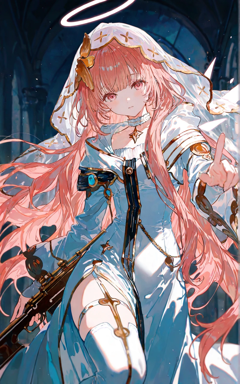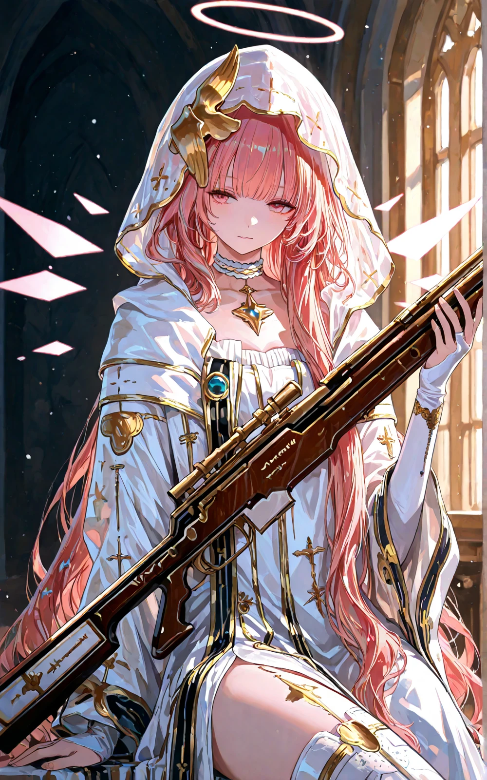 long pink hair, white nun robe, hooded veil, golden accessories, halo, star & cross pendant, embroidered cross, decorated sniper rifle, white elbow gloves, white thigh-high boots with gold details, high-slit robe, pink eyes, lemuen \(arknights\)