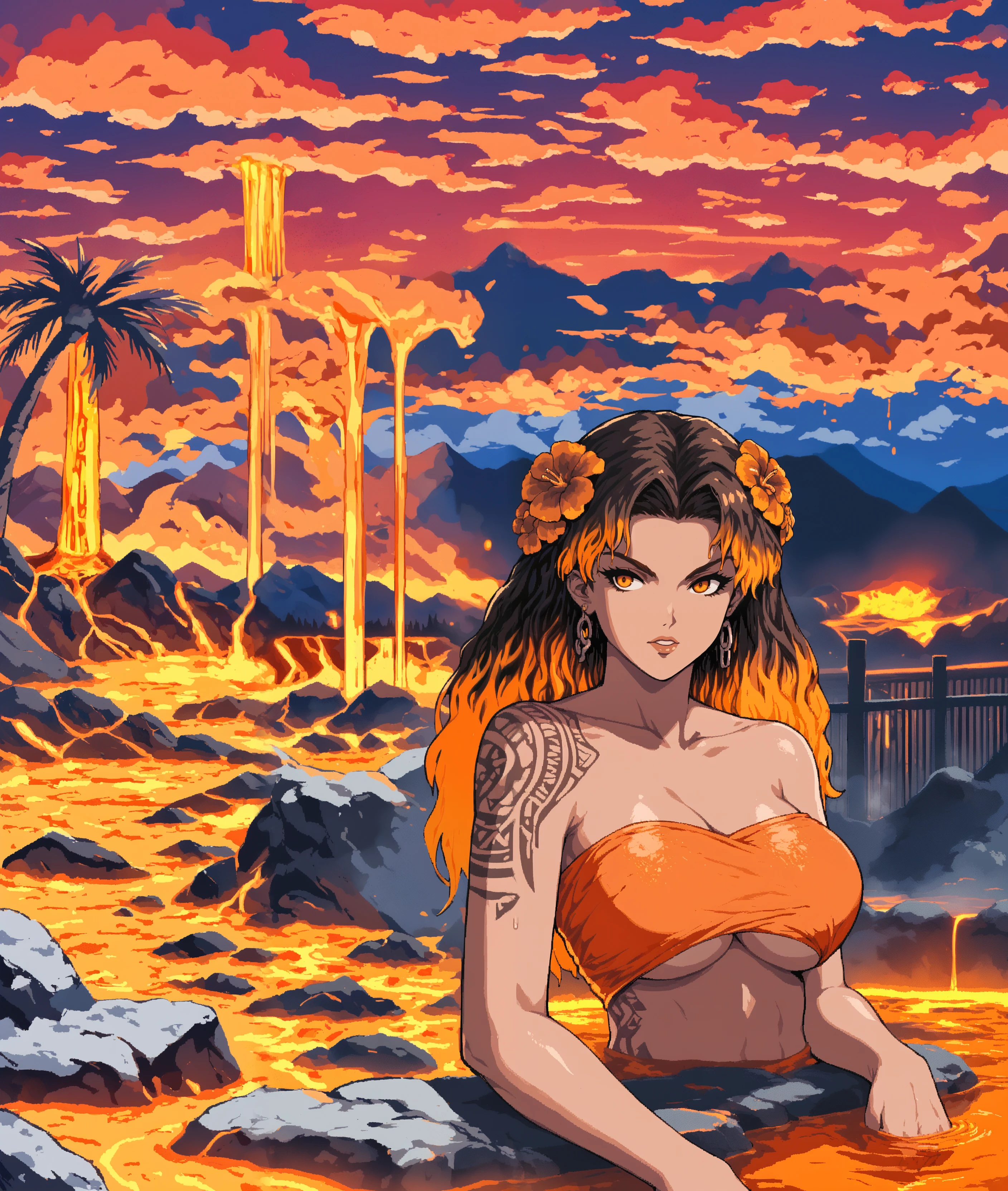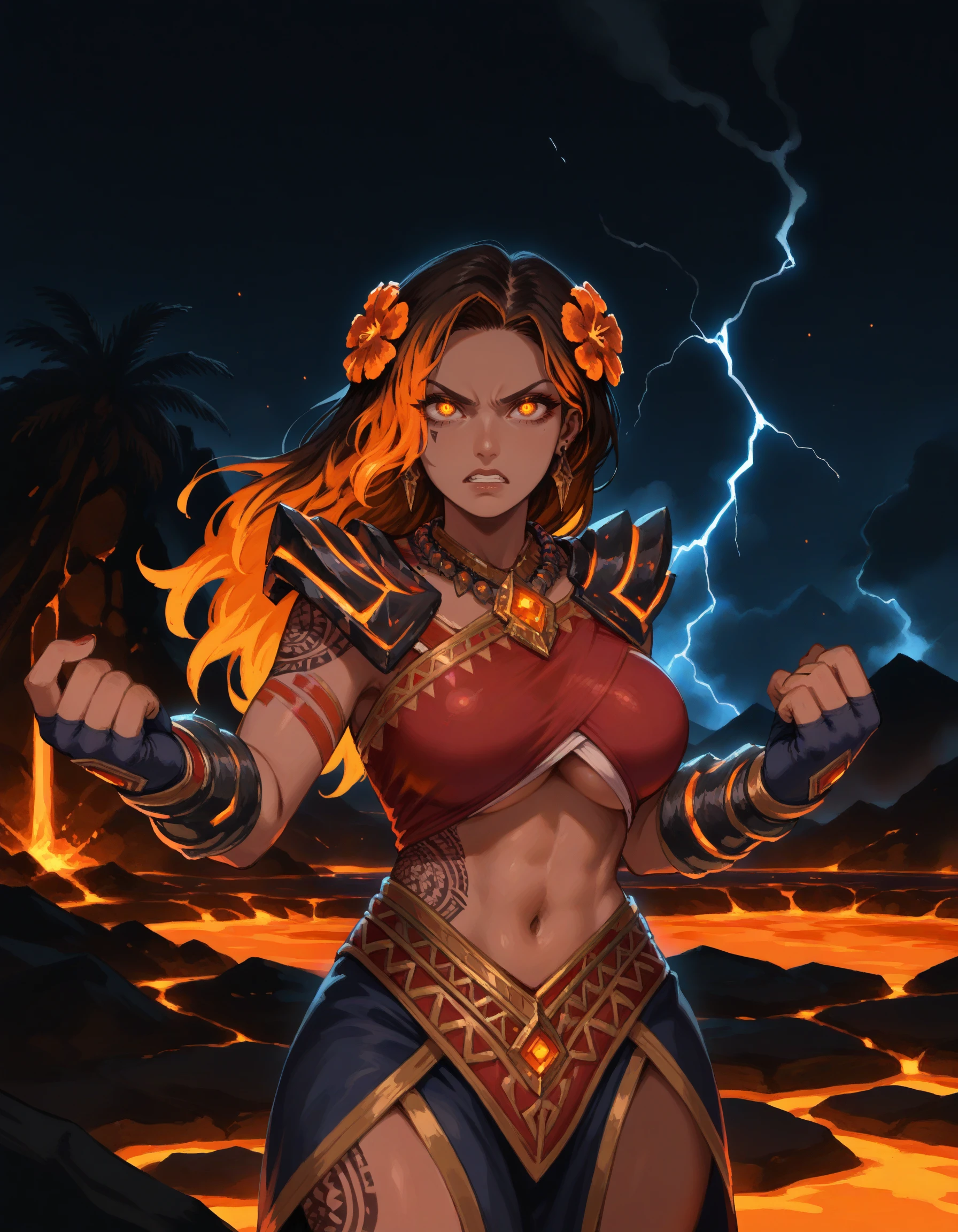 Pele is the goddess of Fire, of Dance and Wind, of Volcanoes and ????????. Pele is both a destroyer and a creator. Through her mastery over the world’s molten core, she wrought the Hawaiian Islands into being, forging them from the lava that ruptured forth from the mouths of her volcanoes. They are places of immense beauty, lush and brimming with life, and by looking upon and reveling in such beauty, you offer Pele worship.