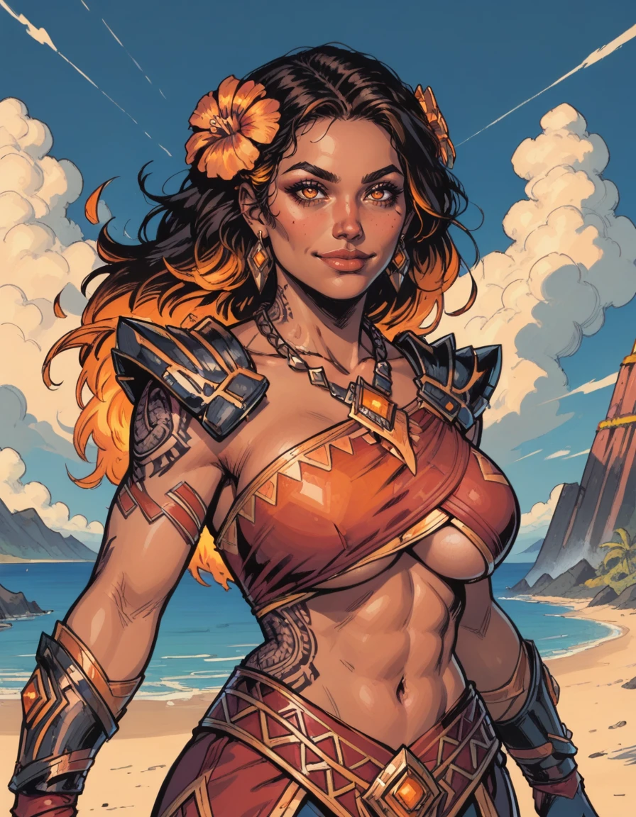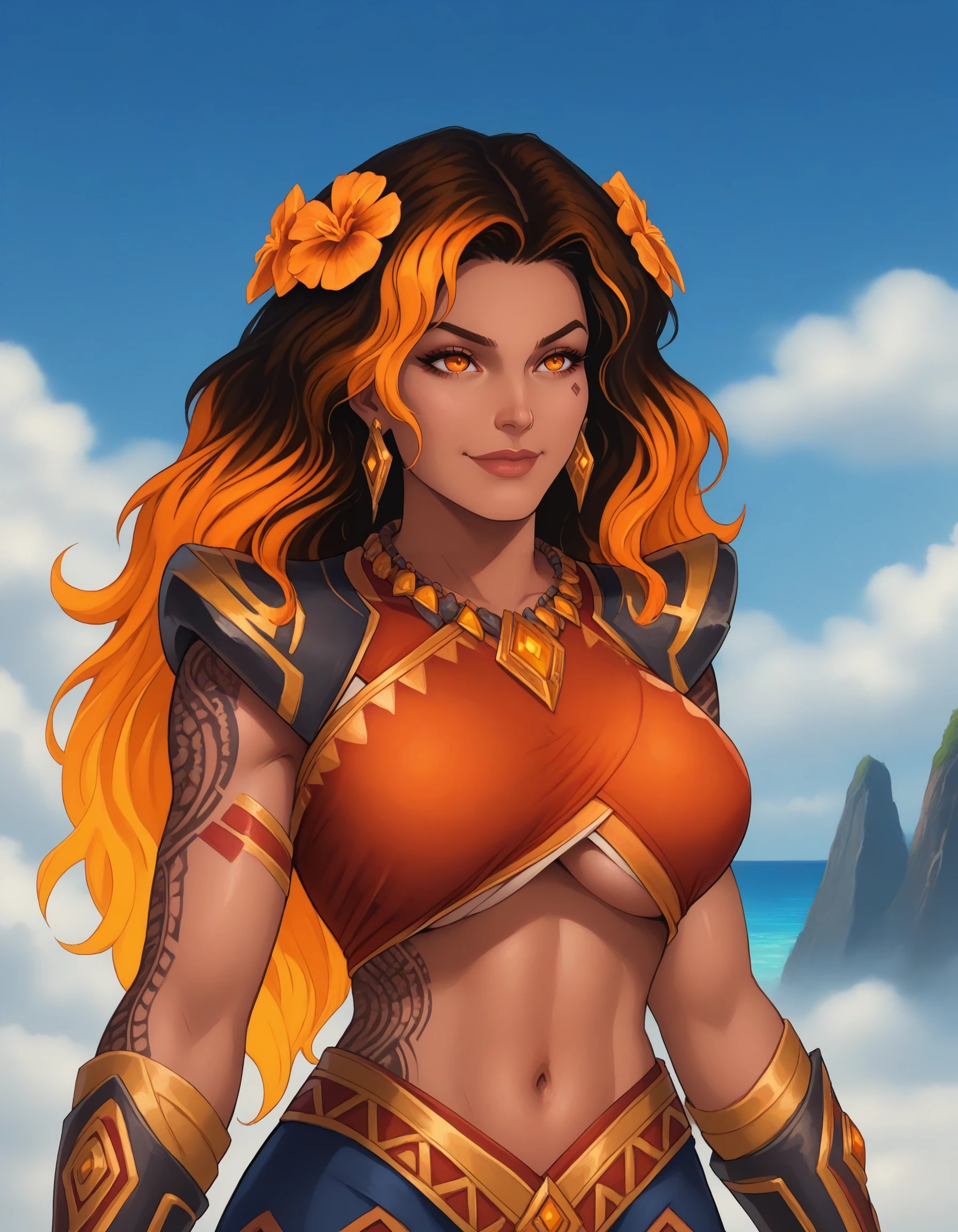 dark-skinned female, dark skin, tribal tattoo, midriff, barefoot