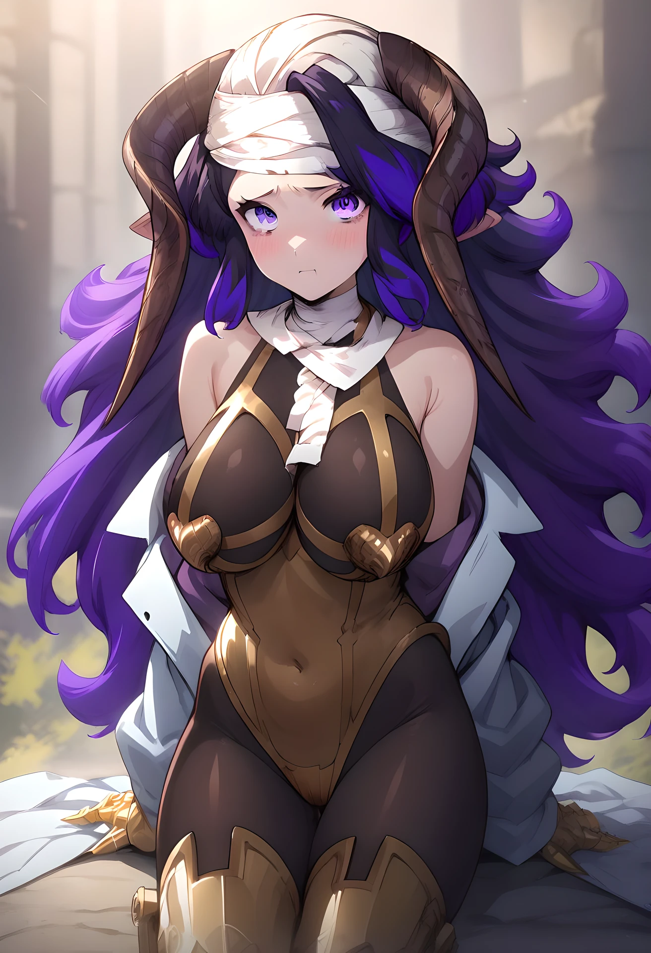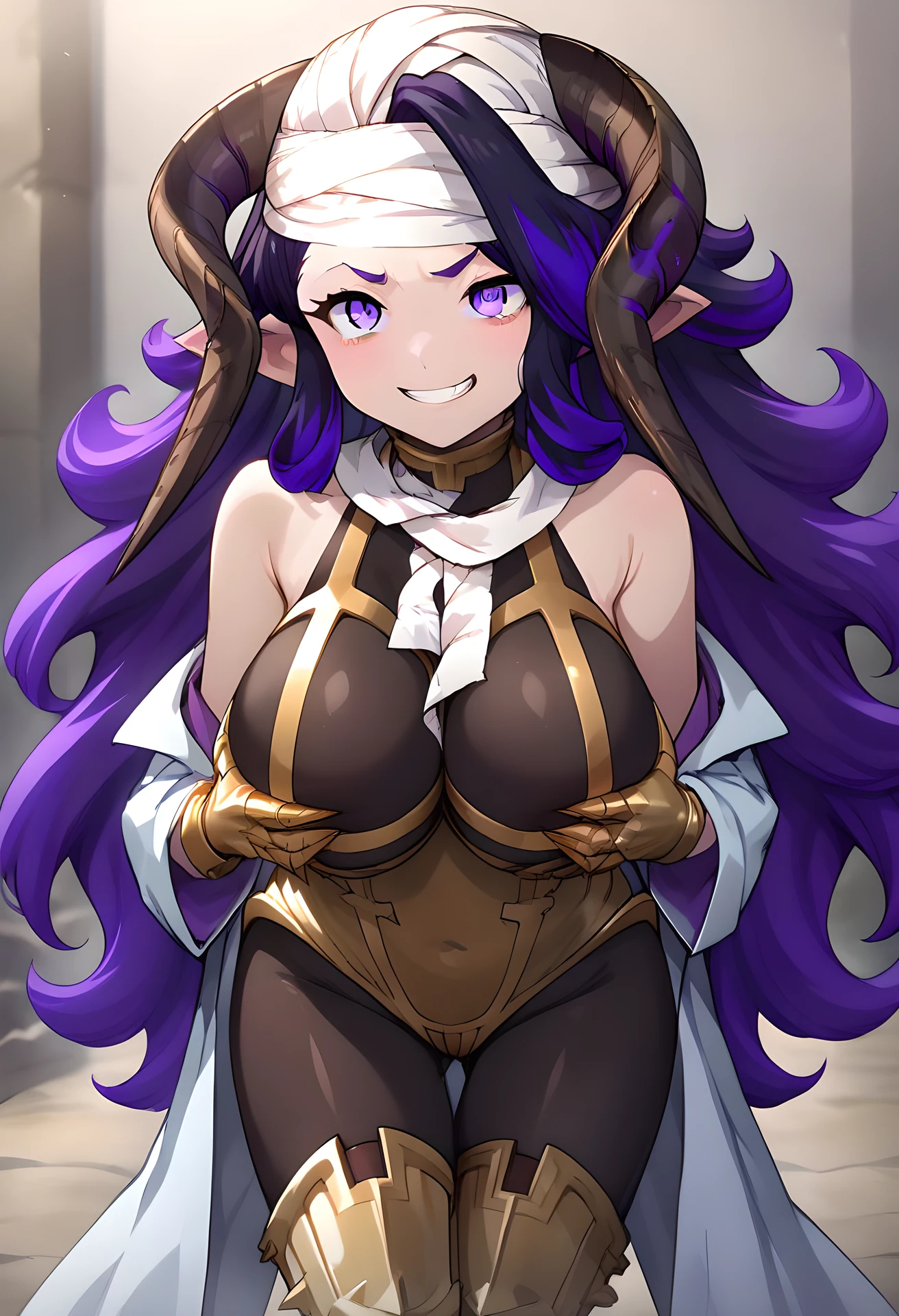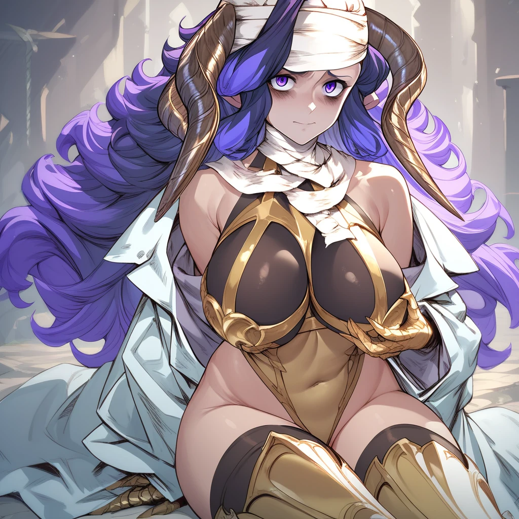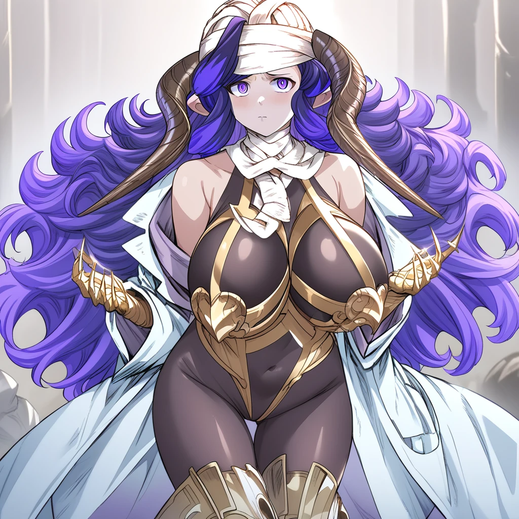 her usual appearance: large breast, purple eyes, purple hair, long hair, multicolored hair, horns, bags under eyes, bandage, head bandages, leotard, golden thigh boots, gold chestplate, lab coat, golden gauntlets,
