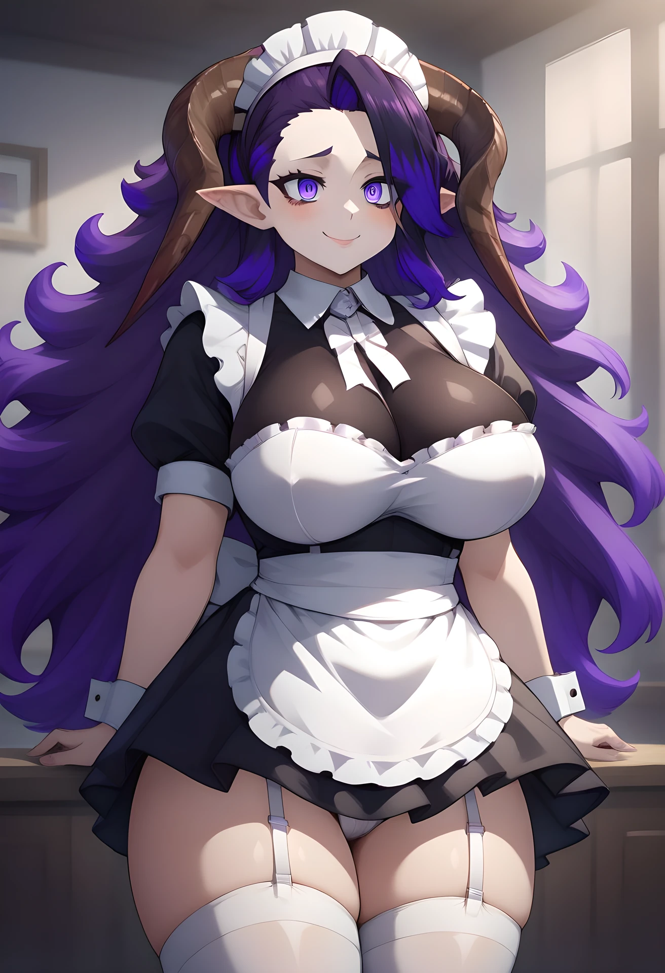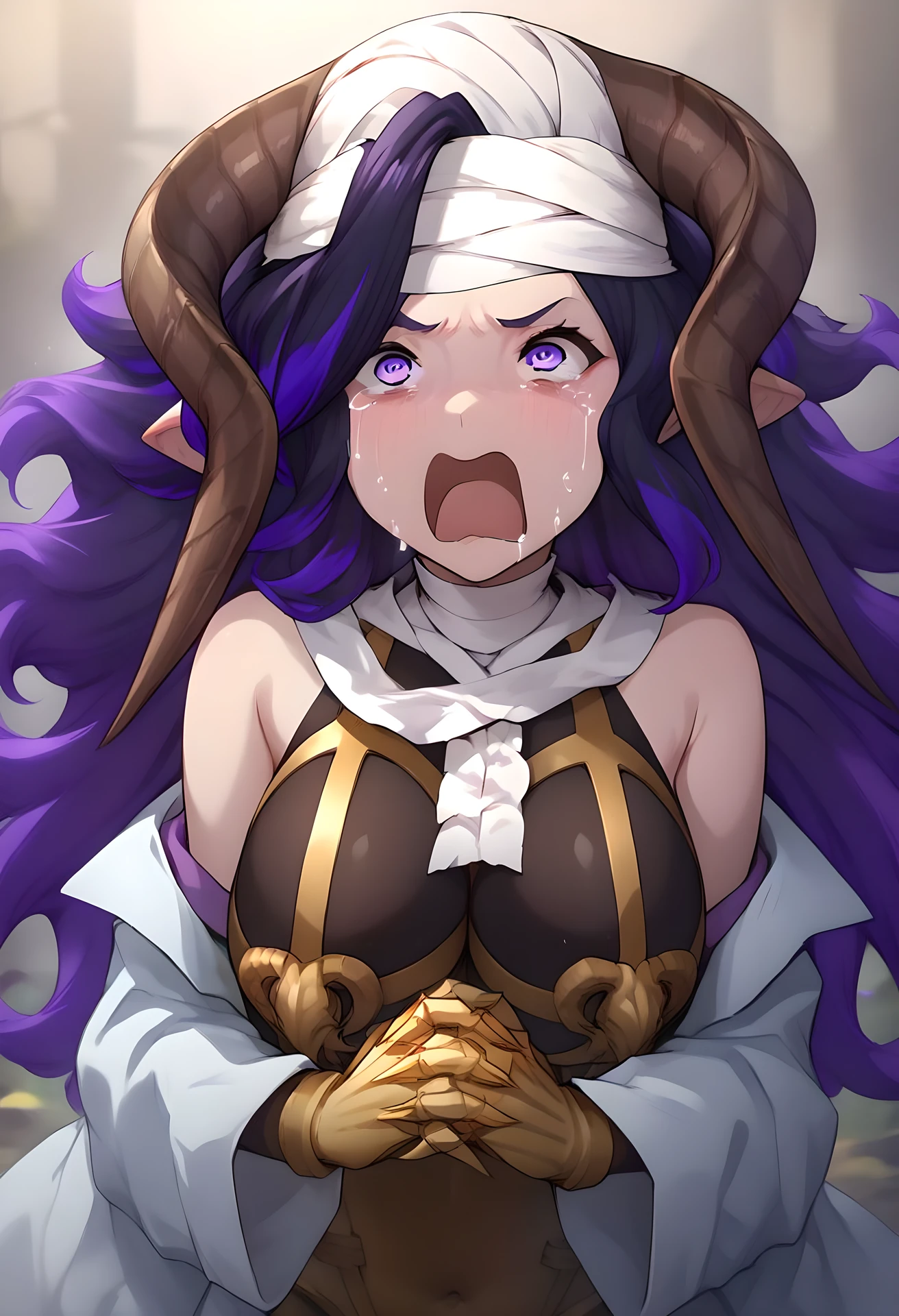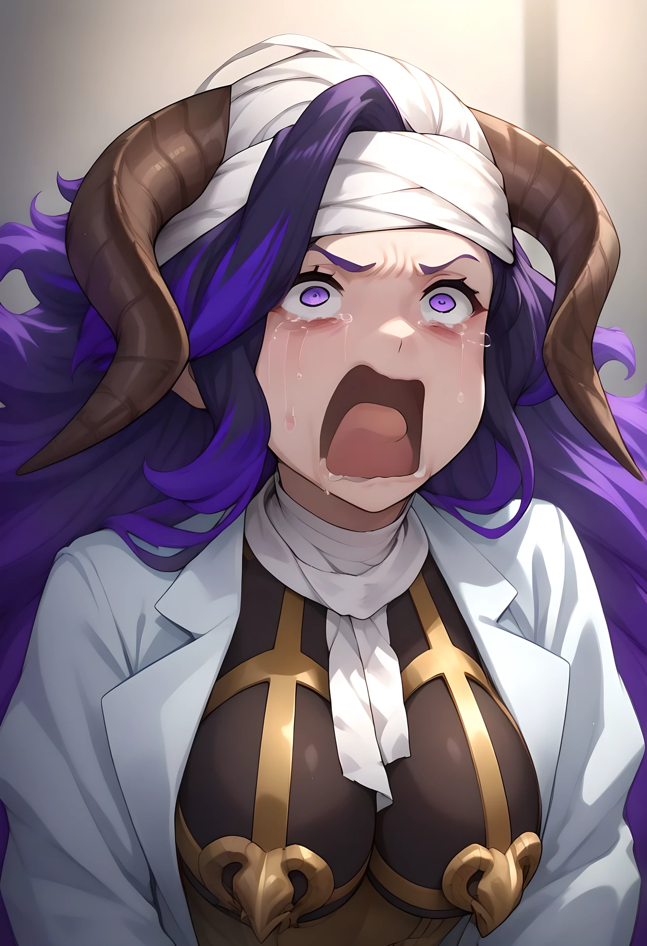 her usual appearance: large breast, purple eyes, purple hair, long hair, multicolored hair, horns, bags under eyes, bandage, head bandages, leotard, golden thigh boots, gold chestplate, lab coat, golden gauntlets,