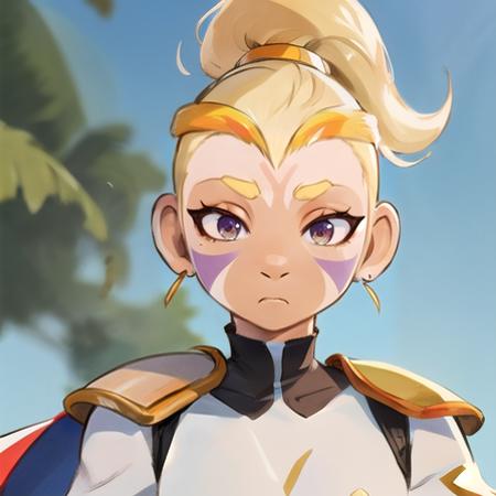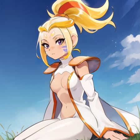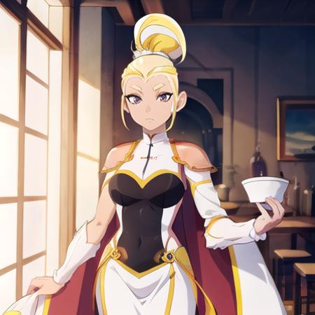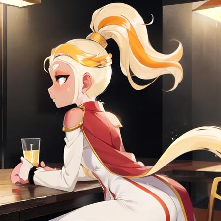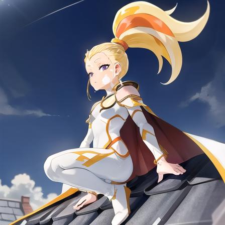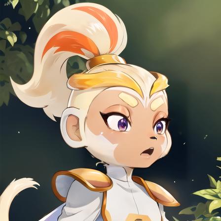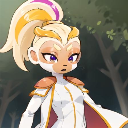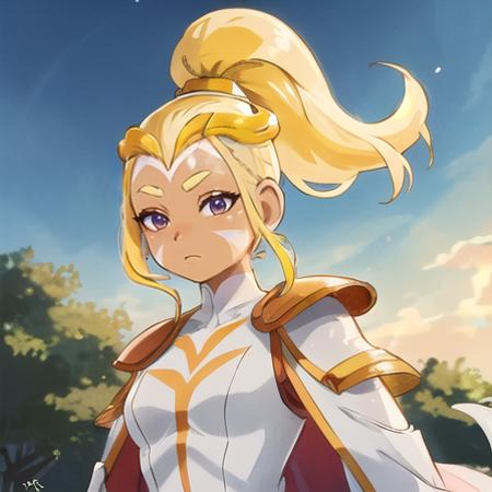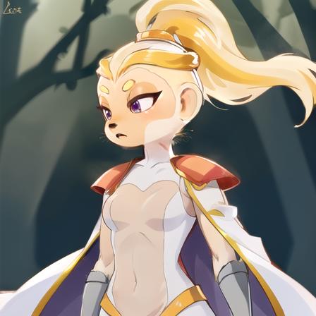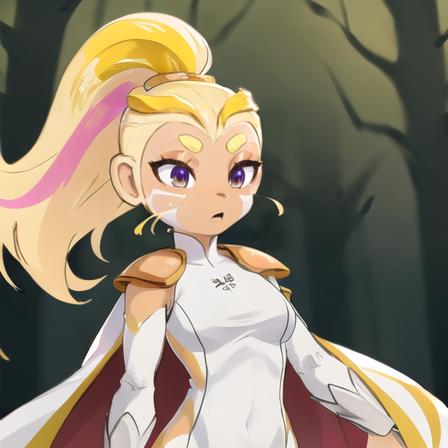 1. Activation tag is Adora, other tags to help include: blonde hair, purple eyes, tail, ponytail, high ponytail, shoulder armor, body fur, two-tone fur, cape, white armor, yellow fur, top knot, facial fur/facial mark, clothed, yellow skin, multicolored skin, adult, yellow hair,