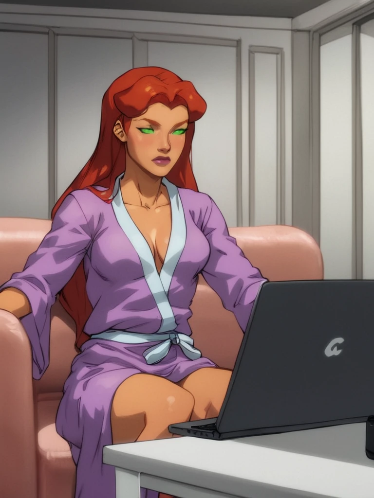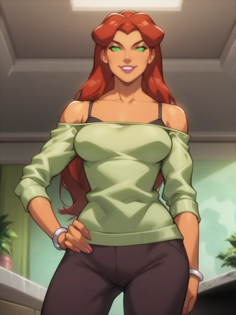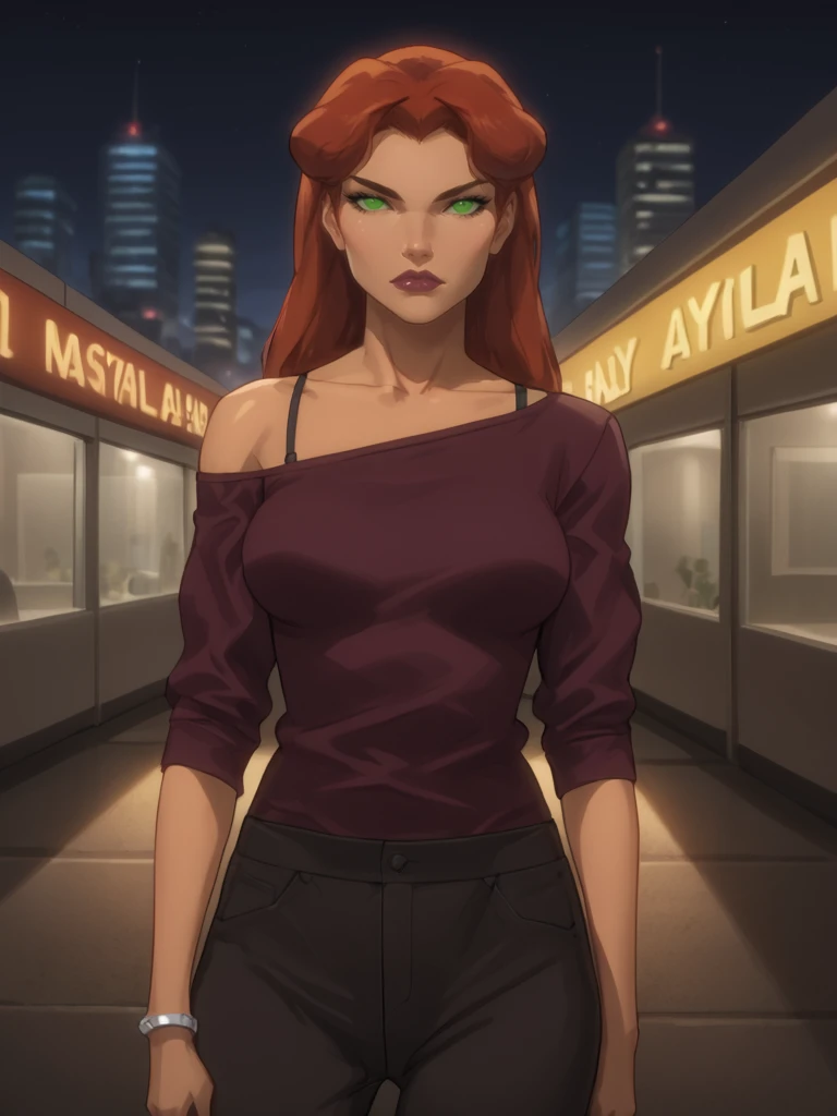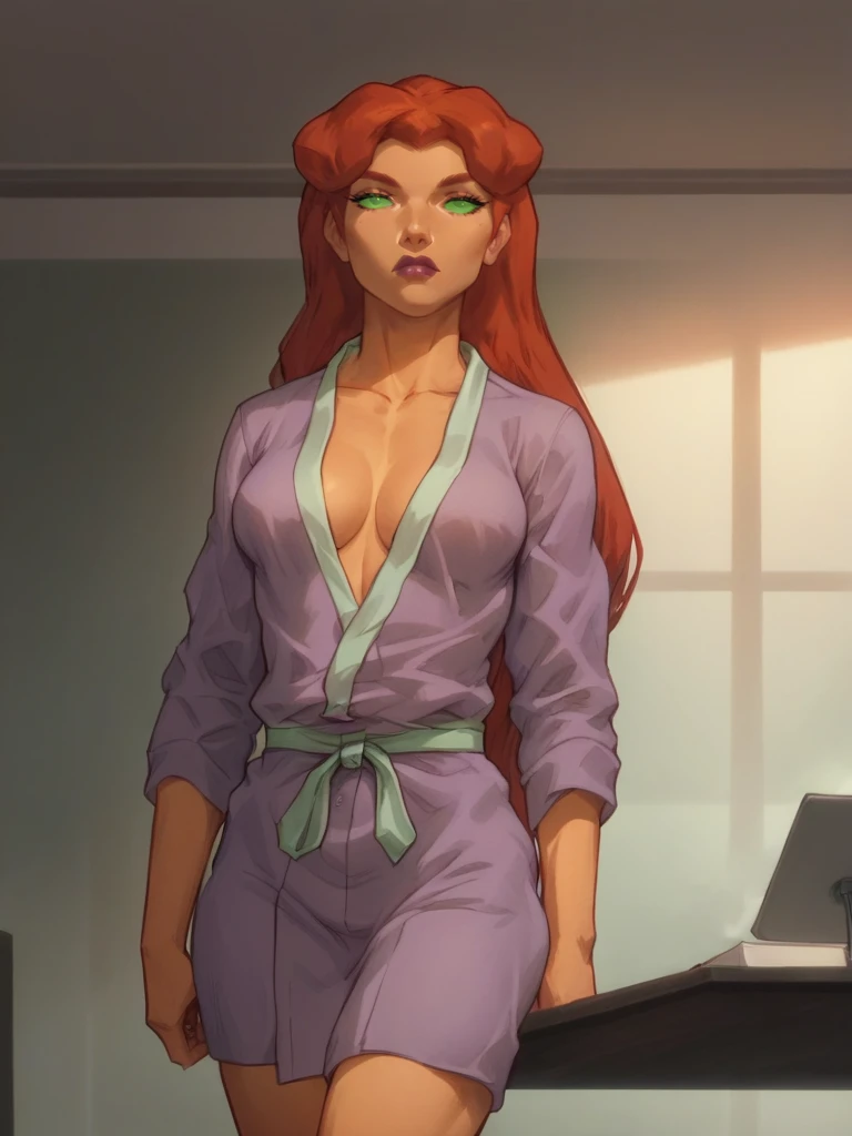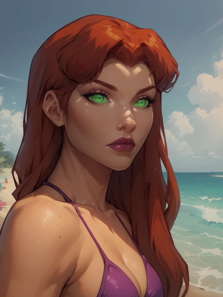 Starfire, orange skin, long hair, red hair, green eyes, green sclera, no pupils, bracers, armlets, keyhole leotard, bare shoulders, cleavage cutout, short skirt, purple outfit, 1girl, tall, clothing cutout, miniskirt, bracer,