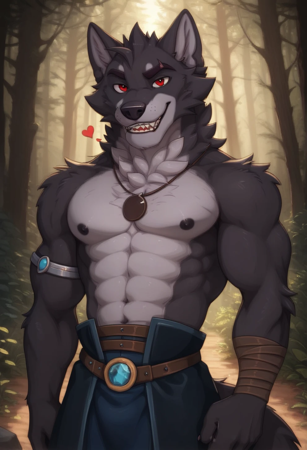 muscular, bara, wolf, black body, black fur, anthro, red eyes, black necklace, black pendent, FBTW, silver armband, silver armband on right arm, black nose, jewelry, black Wolf, brown wristband, leather wrist-wrap, clothes, clothed, topless, black nipples, large male, wearing blue kilt, jewel encrusted belt, black circle necklace, wide face,