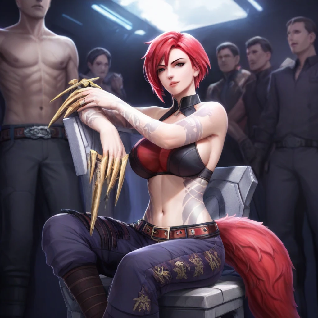 1girl,pink hair,pink fox tail,3 pink tails,midriff,black bra,halter neck,belt,pants,claws on fingers,mouth mask,yakuza tatoos