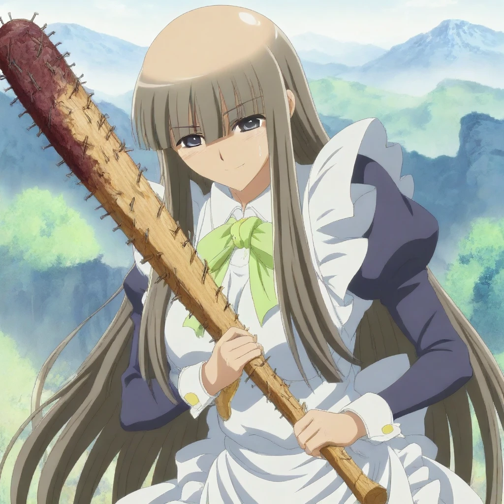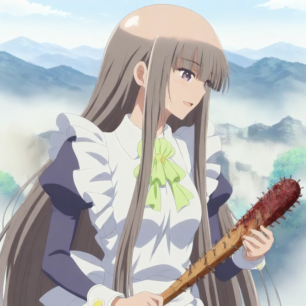 1 young woman, Fubuki ,Kamen no Maid Guy,showcasing her distinctive hairstyle. contrasted by silver collar long hair in a dramatic contrasting with her vibrant blue eyes. She is wearing a Navy blue maid outfit with a white collar, green ascot and white Maid outfit with large frills on the shoulders, bald spot on top of bangs , her baldness is shiny.