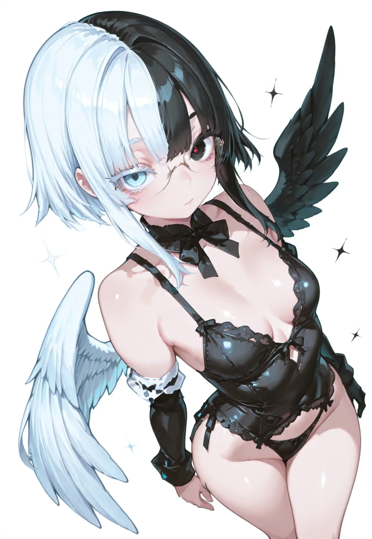 split black and white short hair, long sidelocks, heterochromia, blue left eye , black right eye red pupil, white eyelashes, black eyelashes, glasses, black outfit, fishnet tights, one white wing, one small black wing