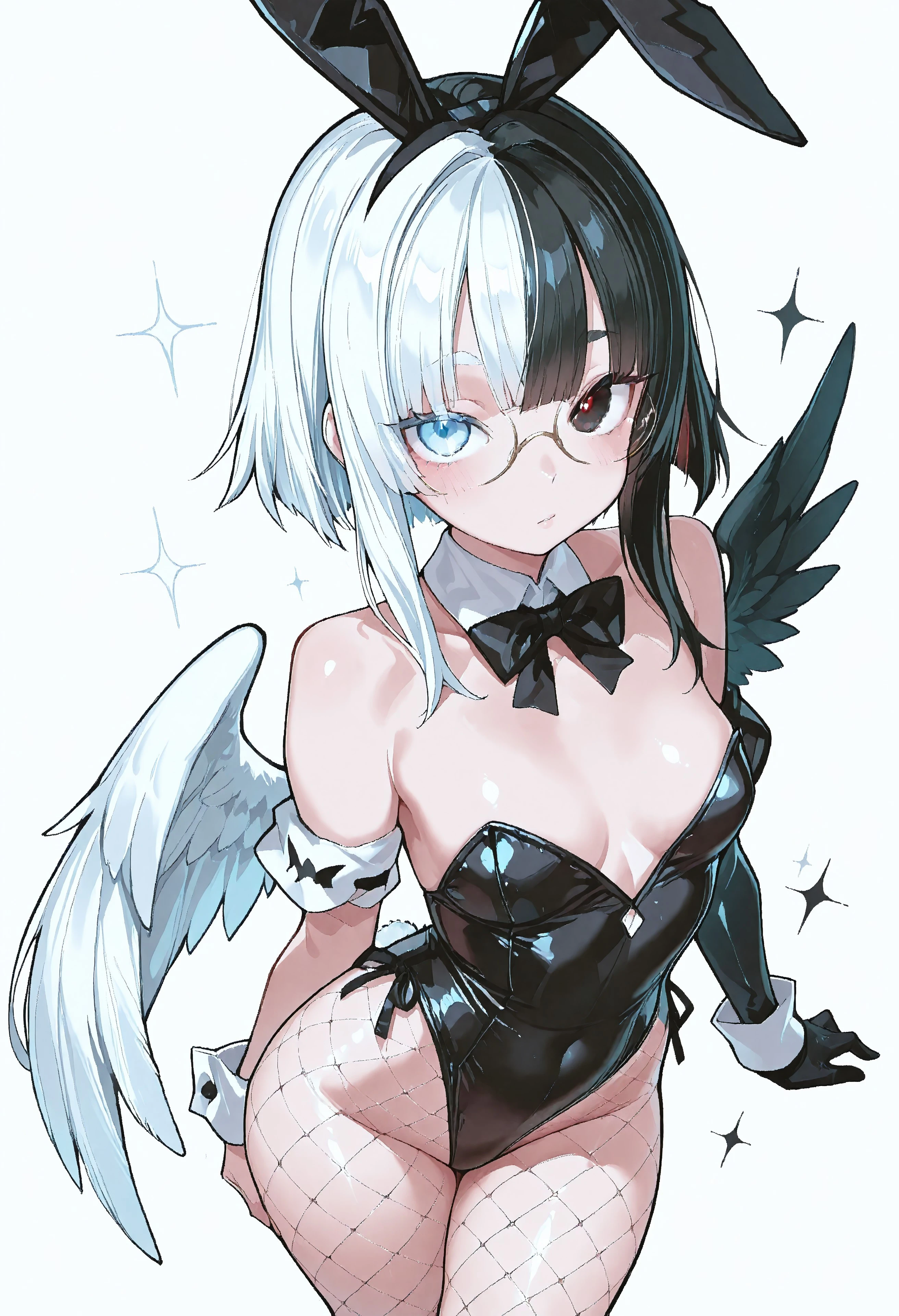split black and white short hair, long sidelocks, heterochromia, blue left eye , black right eye red pupil, white eyelashes, black eyelashes, glasses, black bunny outfit, fishnet tights, one white wing, one small black wing