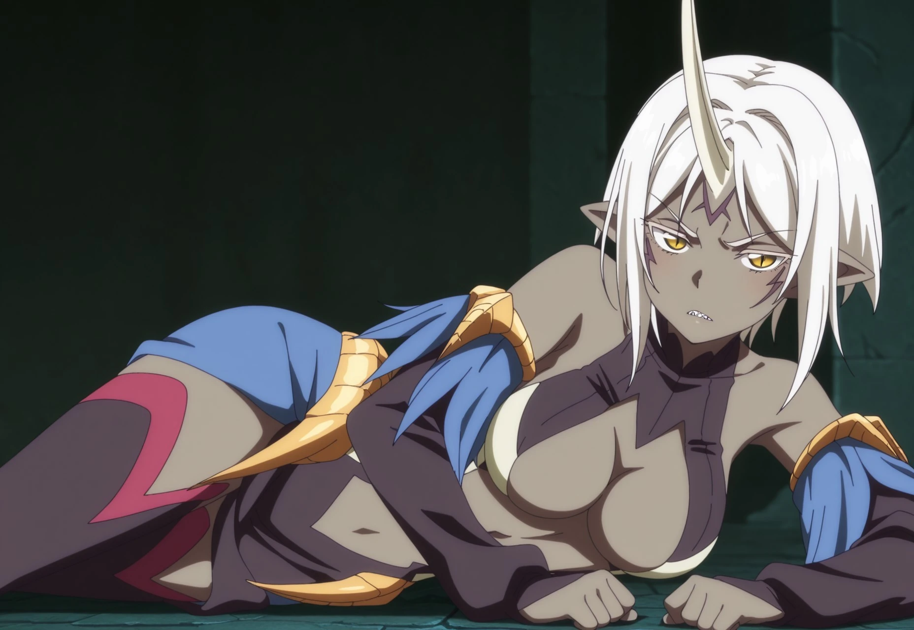 1girl, demon girl, yellow eyes, slit pupils, white hair, short hair, pointy ears, single horn, colored skin, grey skin, facial mark