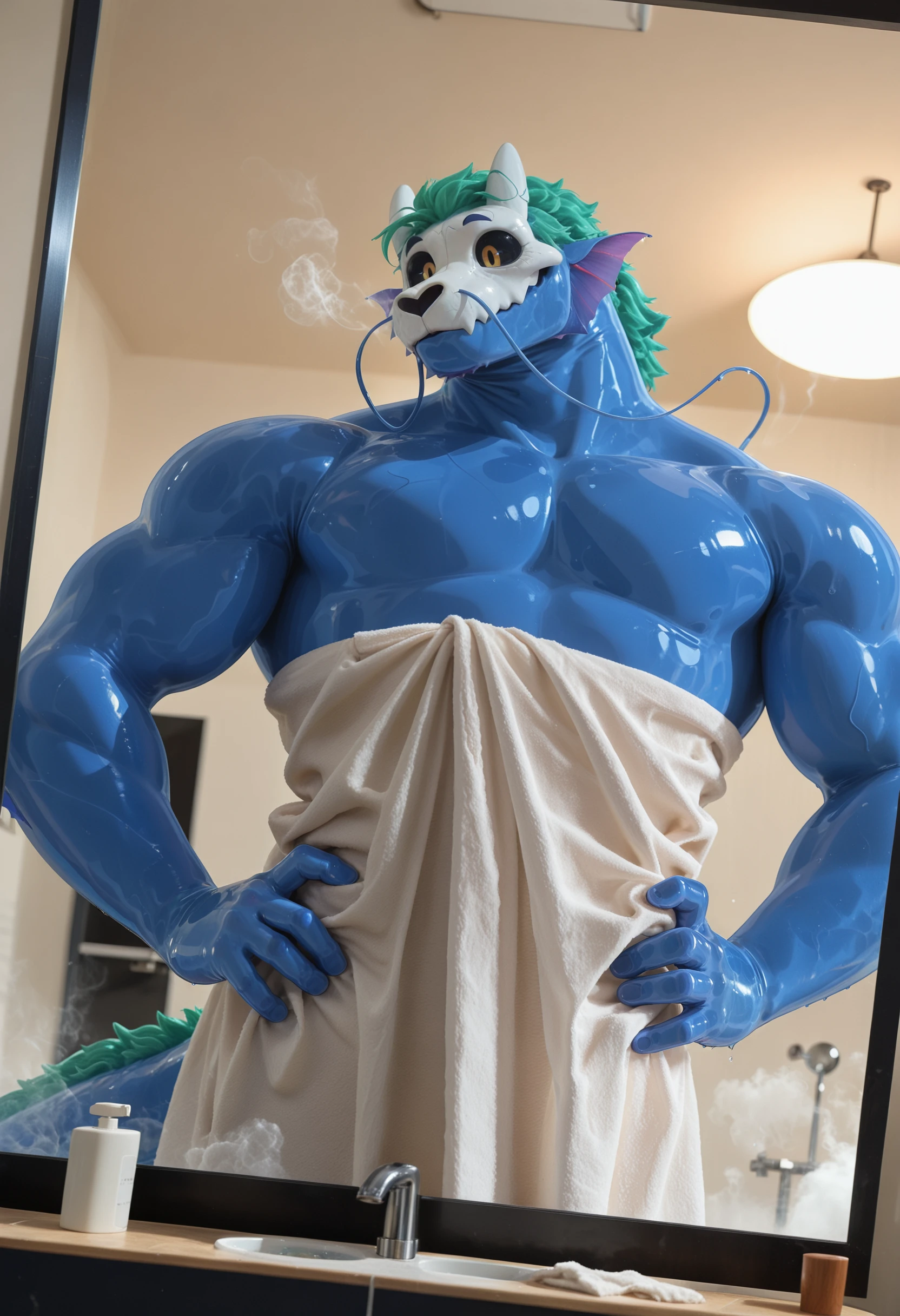 kann0_suk0yiko, liquid body, anthro, male, flesh whiskers, solo, hi res, tail, muscular, big muscles, broad shoulders, blue hair, blue body, white eyes, fins, goo creature, black sclera, barbel (anatomy), skull head, dripping, tiny white horns🔃 Additionally / Дополнительно - green hair, yellow eyes